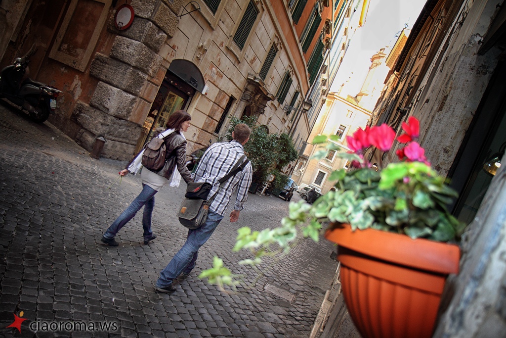 L’energia di camminare non mancava, quindi abbiamo deciso fin da subito di effettuare un gran tour per il centro di Roma che avrebbe coinvolto molte zone importanti per loro care. Le fotografie sono iniziate a Piazza di Spagna per proseguire poi verso il Pincio (Villa Borghese) e giù per Piazza del Popolo, proseguendo poi per via Ripetta ed arrivare a Castel Sant’Angelo. Non sono mai mancati i sorrisi e la felicità della coppia, spensierata finalmente, come tanto avevano desiderato! Proprio sotto Castel Sant’Angelo ci siamo concessi un attimo di relax supplementare facendo una veloce partita al mitico calcio balilla, dove Anton ha vinto con galanteria. Abbiamo poi proseguito per le stradine davanti l’antica prigione imbattendoci in negozi con prodotti turistici caratteristici e qualche portone antico. Arrivati in Piazza Navona non potevamo farci mancare un cartoccio di castagne appena fatte, calde calde, ed un gelato classico romano. Il pomeriggio è corso velocemente e così siamo arrivati al Colosseo in serata, il caldo colore della luce del tramonto ha avvolto l’anfiteatro romano di un colore caldo rossiccio che ben ha coinciso con la passione e l’amore di Tatiana e Anton.