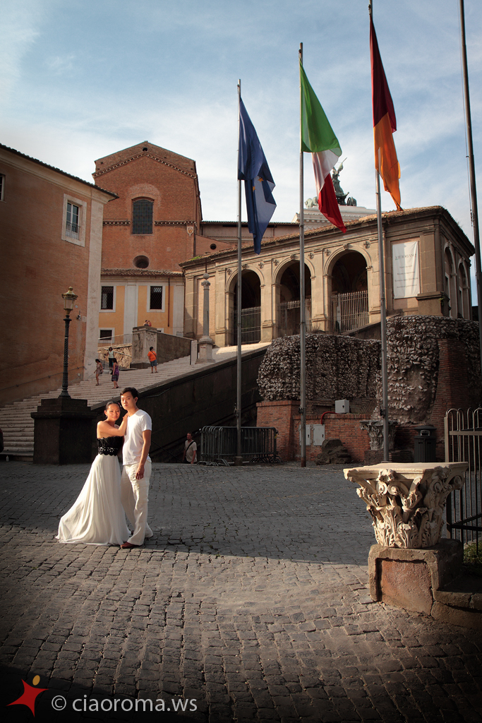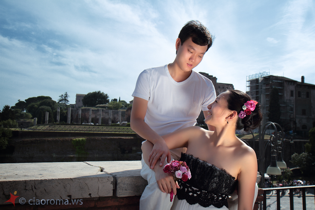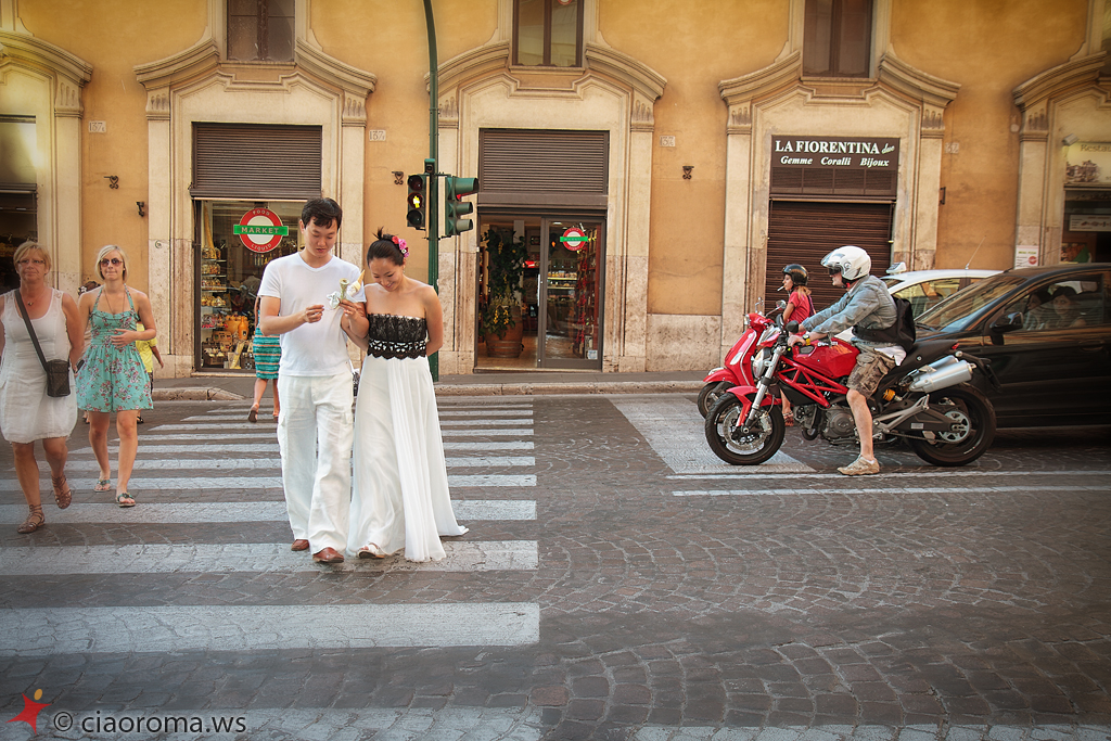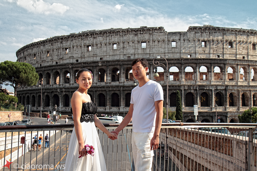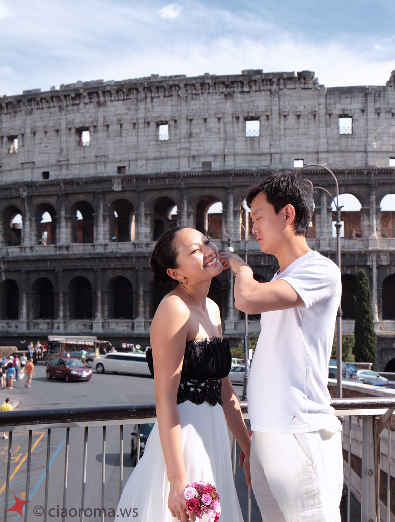 Per l’occasione è stata noleggiata una macchina con conducente che ci ha accompagnato in centro e poi alla fine riportati in Hotel. La sessione fotografica è iniziata nel quartiere Monti, sulla via che conduce al Colosseo con il classico ponte. La naturalezza e la bellezza della sposa mi concedono diverse pose romantiche e suggestive, l’amore tra i due sposini si sente nell’aria e nelle foto. Abbiamo dedicato particolare attenzione al Colosseo, oggetto del loro più ambito desiderio della vacanza che li ha portati a Roma, per poi proseguire per i Fori Imperiali ed al Campidoglio con alcuni panorami caratteristici. Nella piazza del Campidoglio non ci siamo fatti scappare il bellissimo colonnato ed un’altra coppia che si era appena sposata nella Sala Rossa poco distante da li. Scesi dal Campidoglio siamo passati per le stradine di Roma verso Fontana di Trevi dove ho catturato momenti e situazioni particolari come la Fiat 500 ed una macchina antica che stava aspettando altri sposi che erano in zona per altre foto. Gli sposini si sono concessi un gelato per rinfrescarsi un pochino e poi proseguire per le vie della città dove abbiamo trovato una Ducati rossa fiammante ed un’antica Lambretta Piaggio.