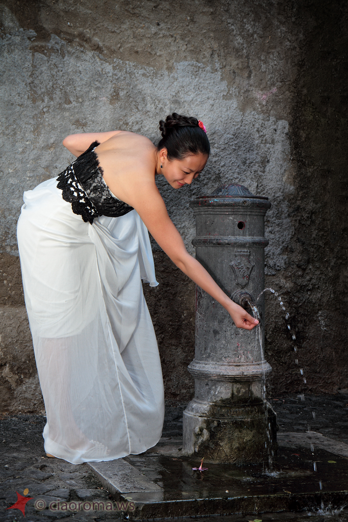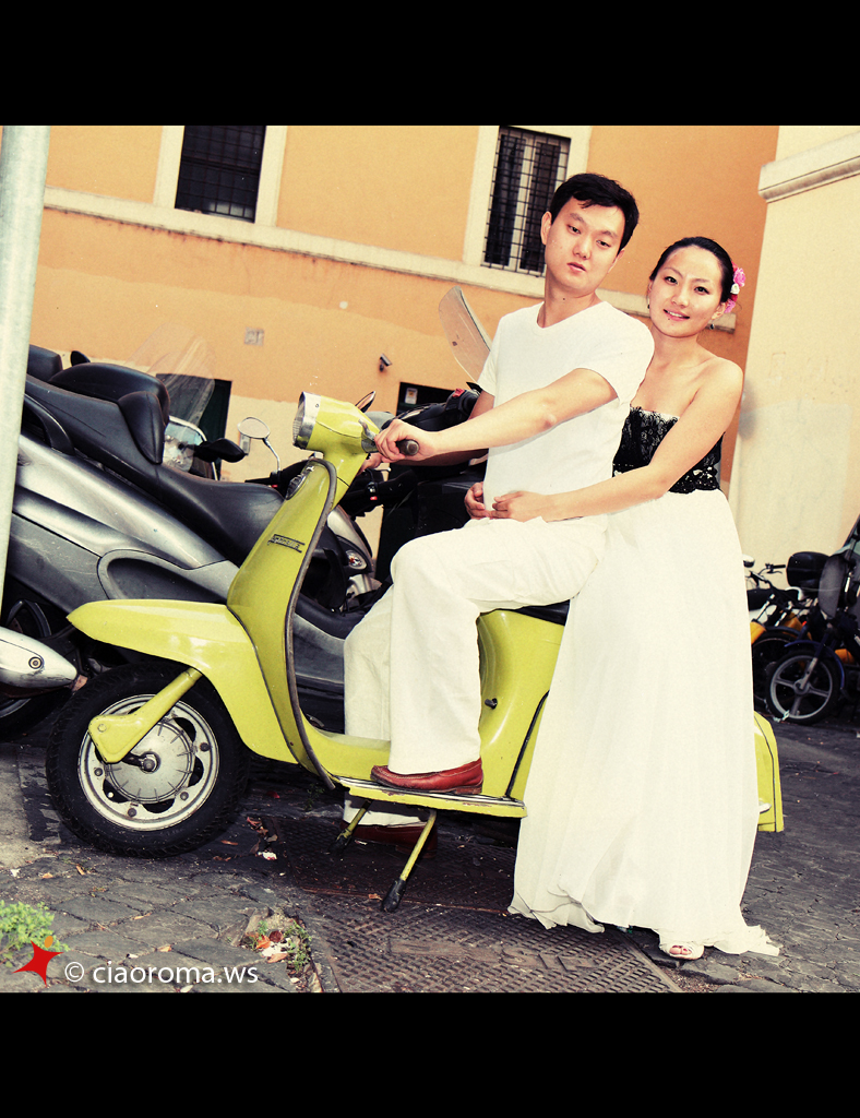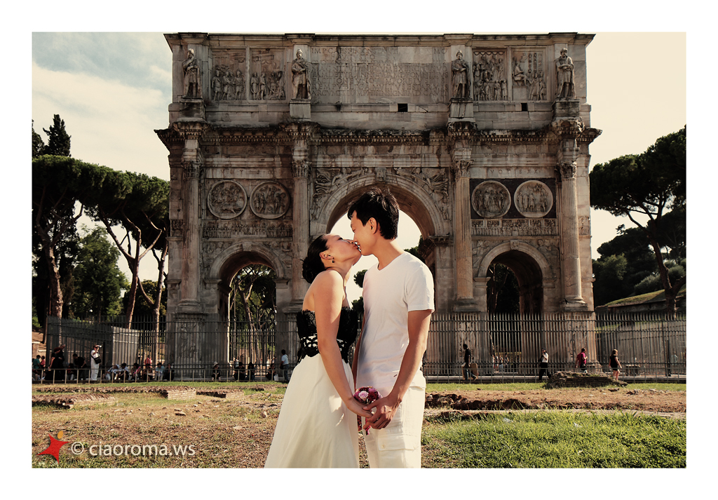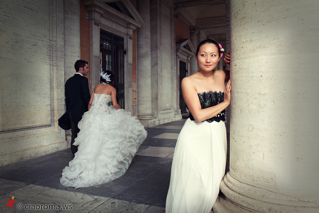 Per l’occasione è stata noleggiata una macchina con conducente che ci ha accompagnato in centro e poi alla fine riportati in Hotel. La sessione fotografica è iniziata nel quartiere Monti, sulla via che conduce al Colosseo con il classico ponte. La naturalezza e la bellezza della sposa mi concedono diverse pose romantiche e suggestive, l’amore tra i due sposini si sente nell’aria e nelle foto. Abbiamo dedicato particolare attenzione al Colosseo, oggetto del loro più ambito desiderio della vacanza che li ha portati a Roma, per poi proseguire per i Fori Imperiali ed al Campidoglio con alcuni panorami caratteristici. Nella piazza del Campidoglio non ci siamo fatti scappare il bellissimo colonnato ed un’altra coppia che si era appena sposata nella Sala Rossa poco distante da li. Scesi dal Campidoglio siamo passati per le stradine di Roma verso Fontana di Trevi dove ho catturato momenti e situazioni particolari come la Fiat 500 ed una macchina antica che stava aspettando altri sposi che erano in zona per altre foto. Gli sposini si sono concessi un gelato per rinfrescarsi un pochino e poi proseguire per le vie della città dove abbiamo trovato una Ducati rossa fiammante ed un’antica Lambretta Piaggio.