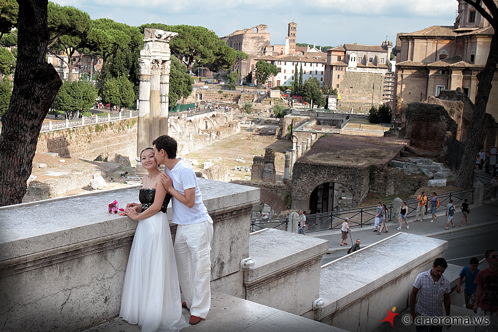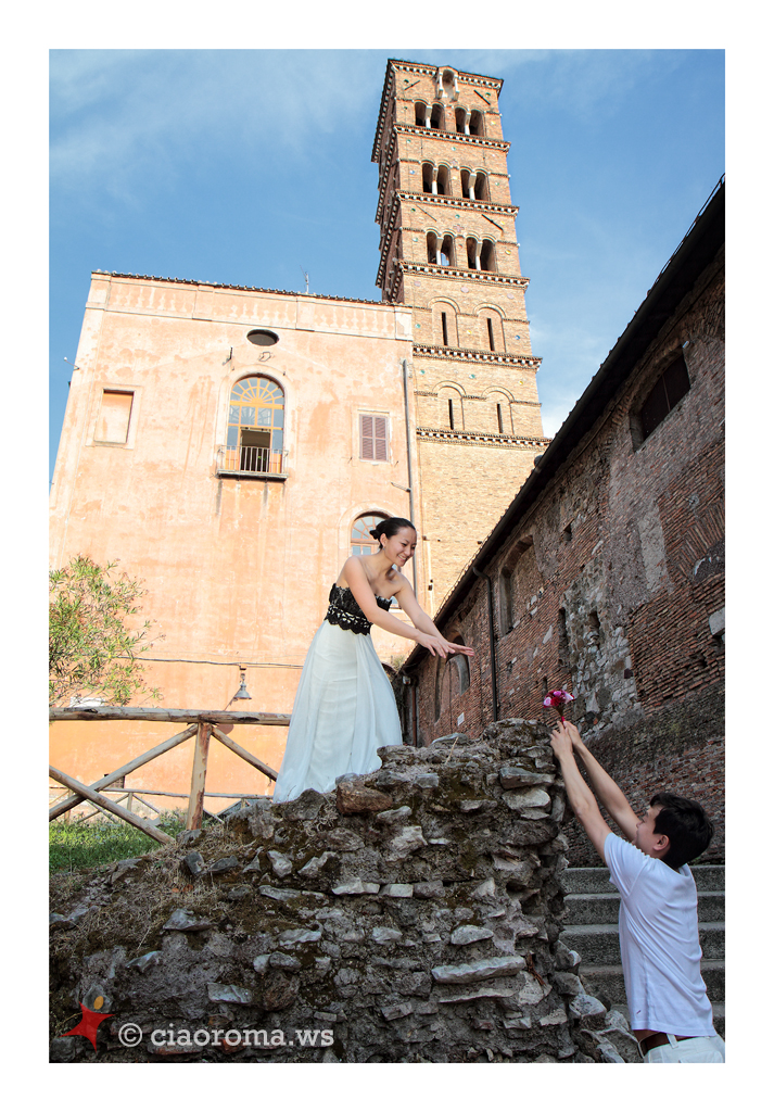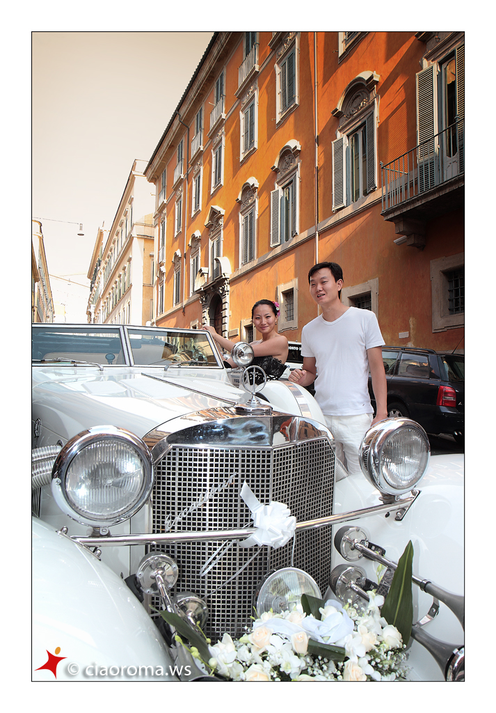 Una bella foto presa in un attimo che eravamo in cammino è l’ultima della serie; bella perché inattesa e improvvisa! Per strada c’era una Rolls Royce bianca con dietro un bus turistico sul quale era riportata la scritta Roma. E’ bastato un attimo che intravedessi la situazione per impostare la fotocamera, direzionare gli sposini nella giusta posa e catturare lo scatto che, secondo me, è venuto perfetto!