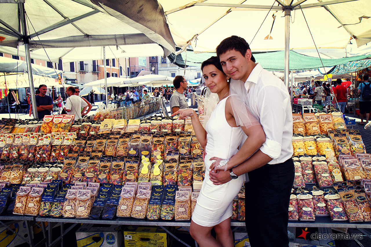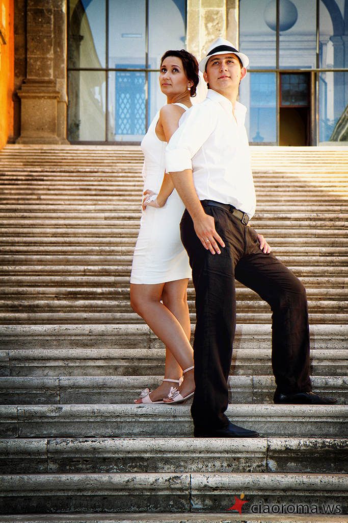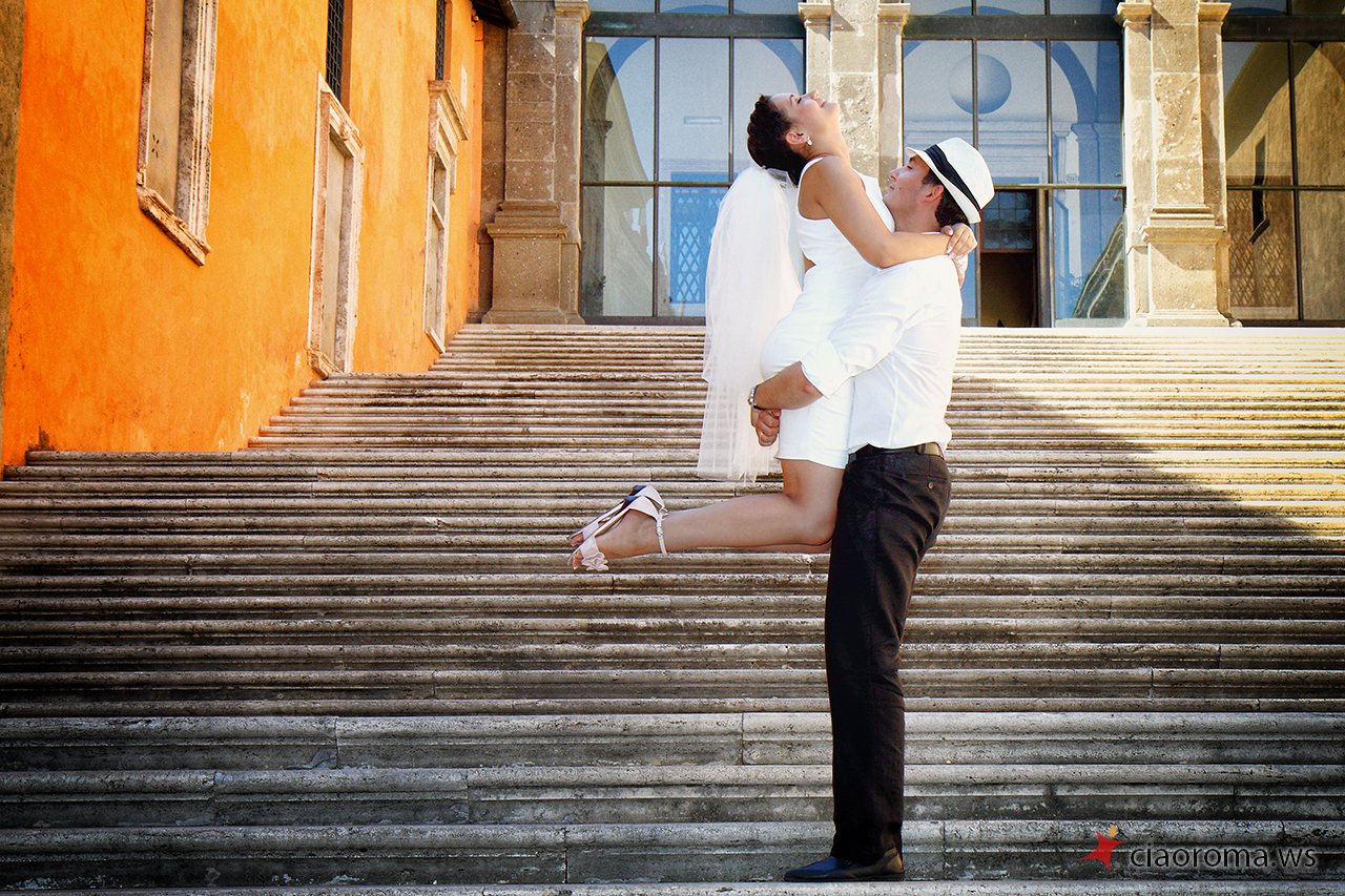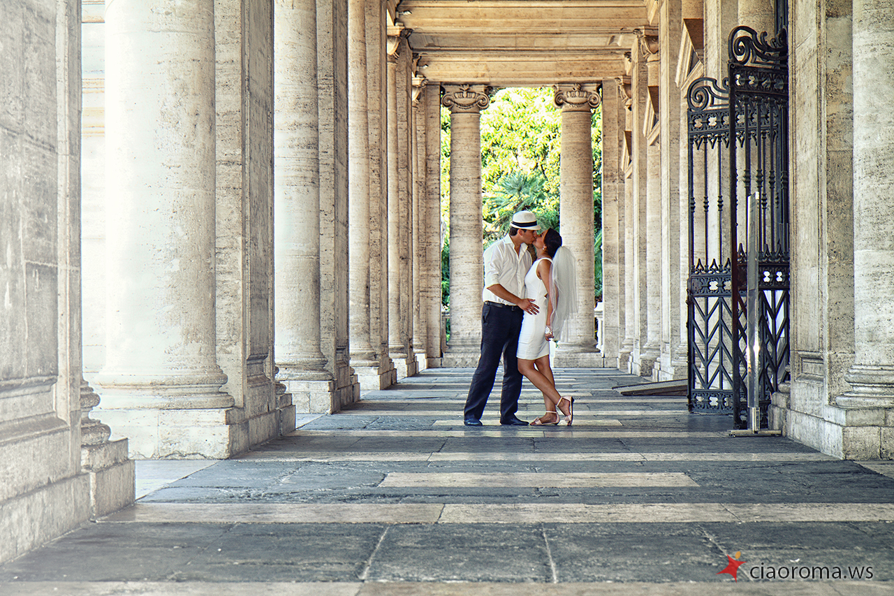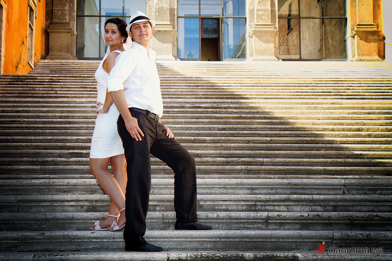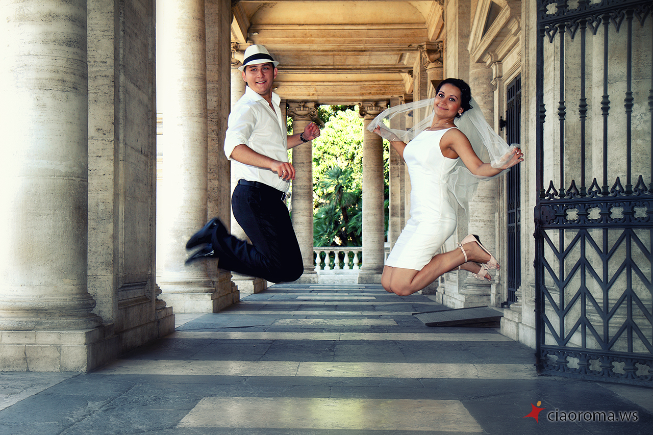 C'è stato fin da subito molto feeling tra me ed i dolci sposini, erano pratici della loro sessione fotografica di matrimonio avuta qualche giorno prima e quindi posavano naturalmente davanti alla mia macchina fotografica. La sessione è iniziata al Colosseo con i loro caldi baci ed abbracci, poi abbiamo proseguito per Via del Colosseo ed abbiamo raggiunto i Fori Imperiali dove ci siamo concessi diverse situazioni fotografiche con lo stupendo panorama che ci circondava. Saliti poi sulla piazza del Campidoglio, abbiamo approfittato della splendida luce che c'era sotto il colonnato e coinvolto gli sposini in un salto per dare un po’ di dinamicità. Qualche foto sulla scalinata, una sulla piazza nel suo completo ed un piccolo caschè di ballo con il sole di punta che ci regala un bellissimo flare. Abbiamo proseguito poi il tour per il Ghetto Ebraico per poi finire la passeggiata a Campo de' Fiori dove abbiamo approfittato del tipico mercatino mattutino fotografando la coppia con i prodotti tipici romani.
