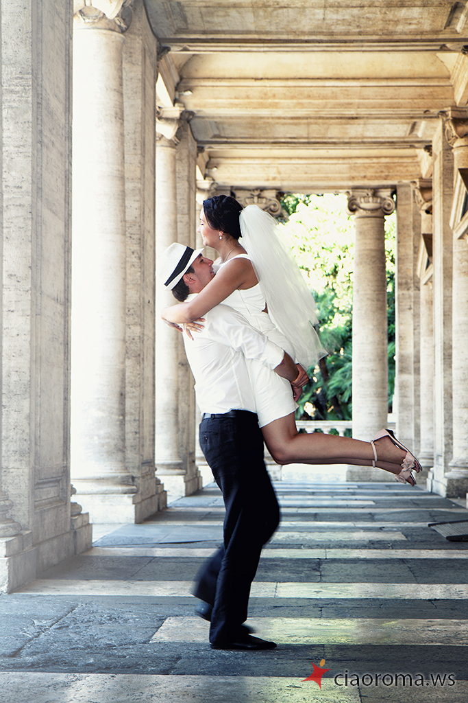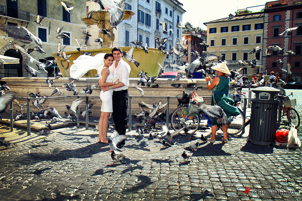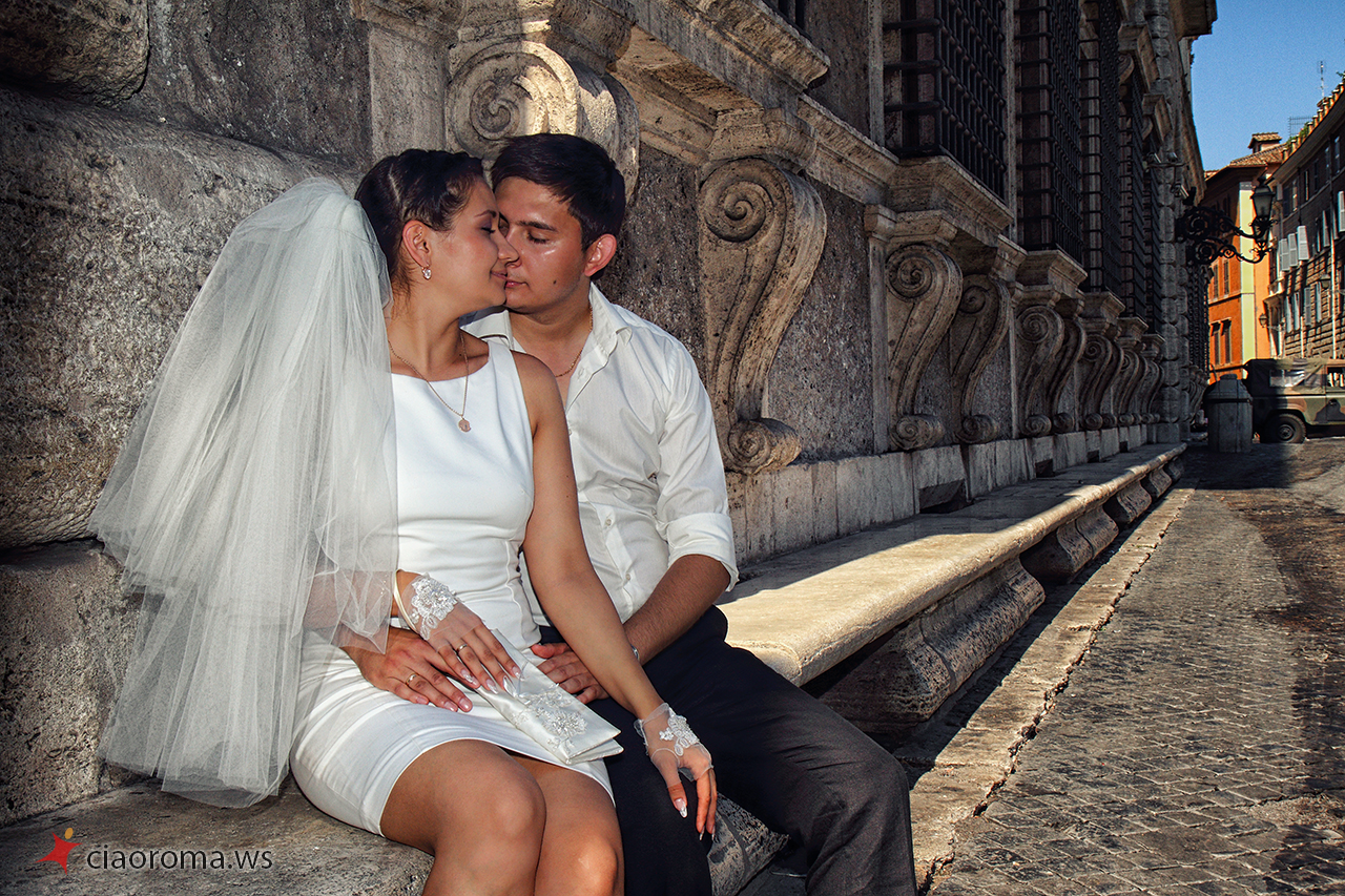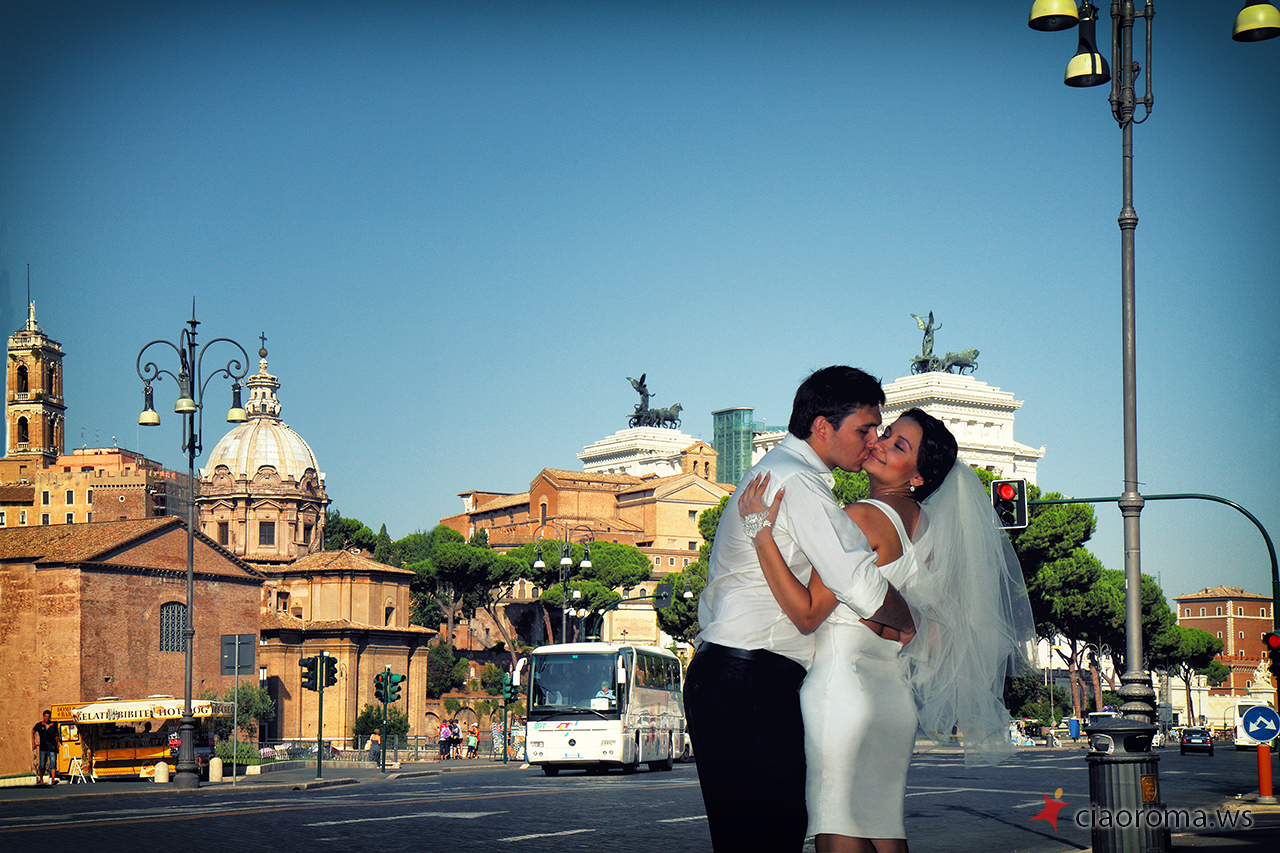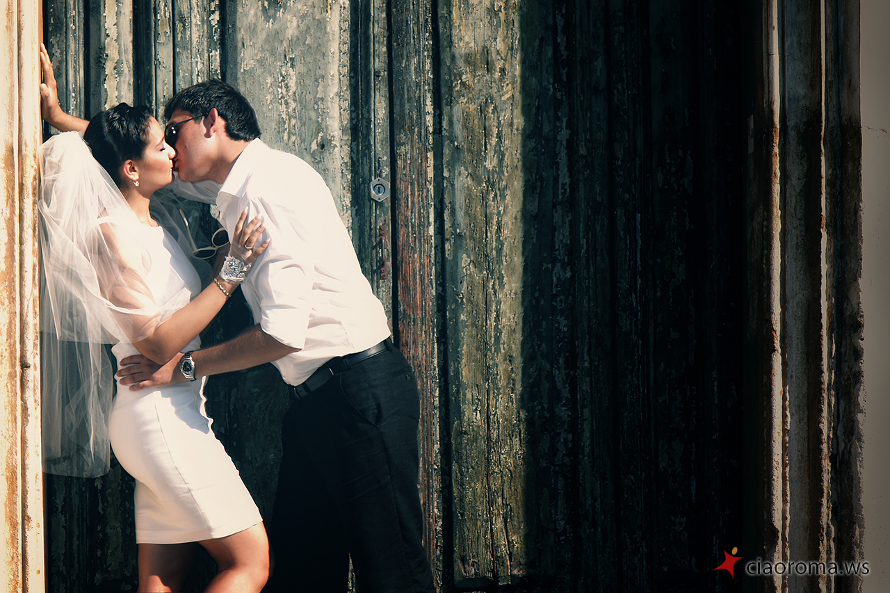 C'è stato fin da subito molto feeling tra me ed i dolci sposini, erano pratici della loro sessione fotografica di matrimonio avuta qualche giorno prima e quindi posavano naturalmente davanti alla mia macchina fotografica. La sessione è iniziata al Colosseo con i loro caldi baci ed abbracci, poi abbiamo proseguito per Via del Colosseo ed abbiamo raggiunto i Fori Imperiali dove ci siamo concessi diverse situazioni fotografiche con lo stupendo panorama che ci circondava. Saliti poi sulla piazza del Campidoglio, abbiamo approfittato della splendida luce che c'era sotto il colonnato e coinvolto gli sposini in un salto per dare un po’ di dinamicità. Qualche foto sulla scalinata, una sulla piazza nel suo completo ed un piccolo caschè di ballo con il sole di punta che ci regala un bellissimo flare. Abbiamo proseguito poi il tour per il Ghetto Ebraico per poi finire la passeggiata a Campo de' Fiori dove abbiamo approfittato del tipico mercatino mattutino fotografando la coppia con i prodotti tipici romani.