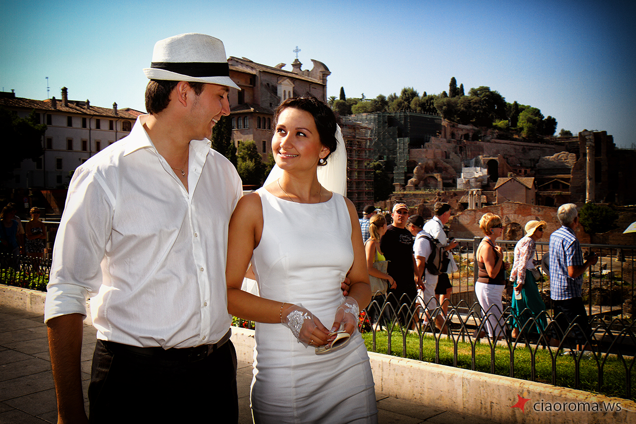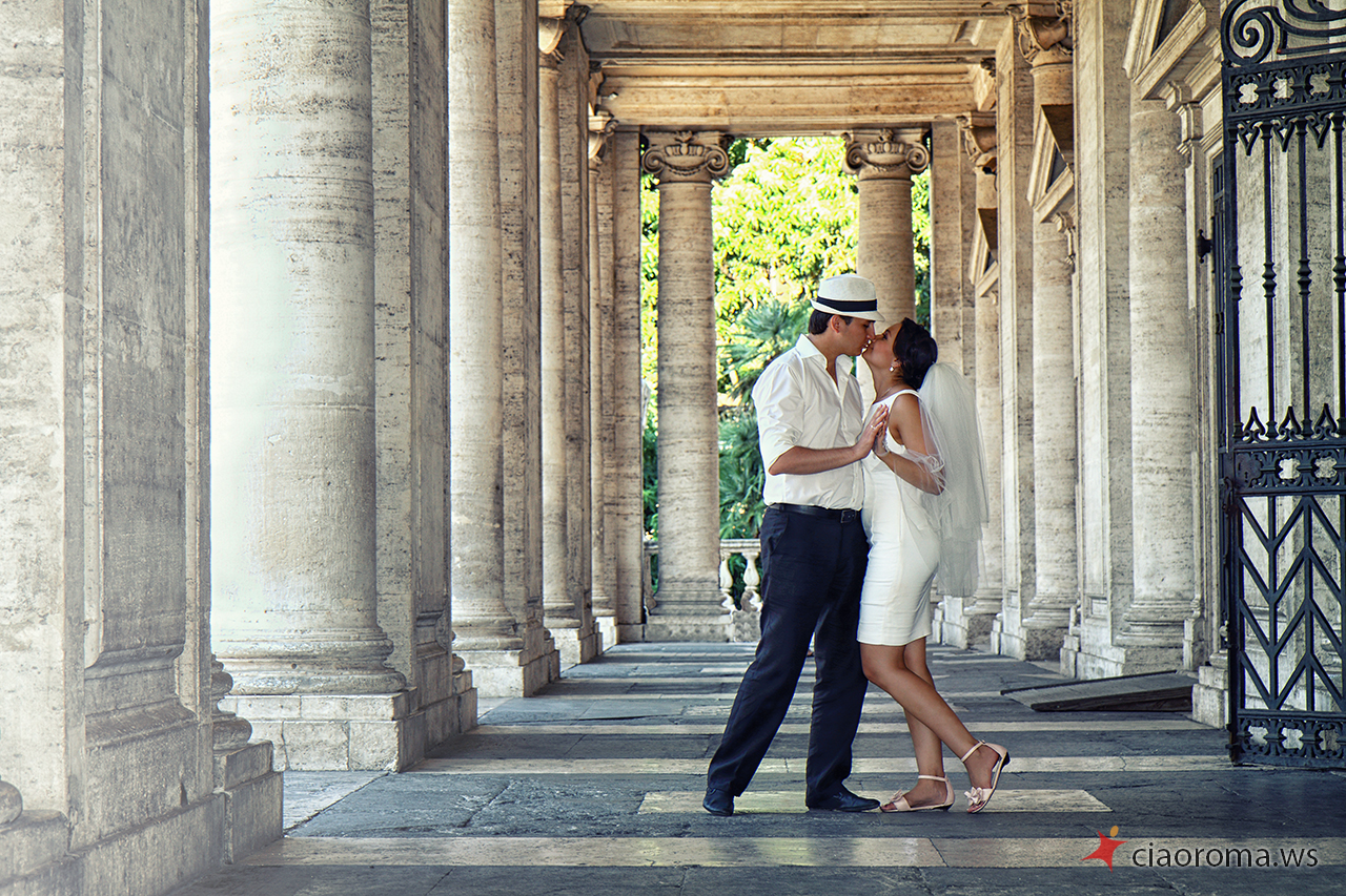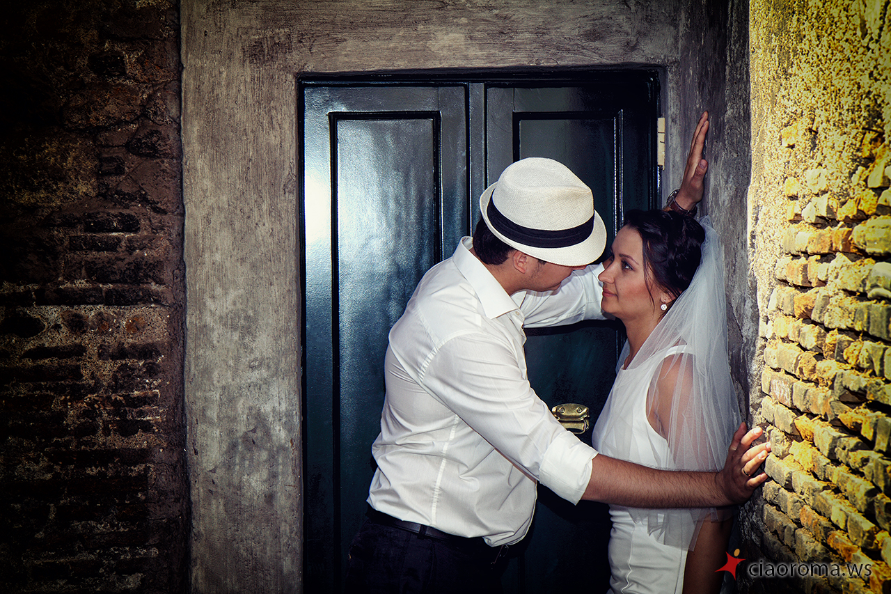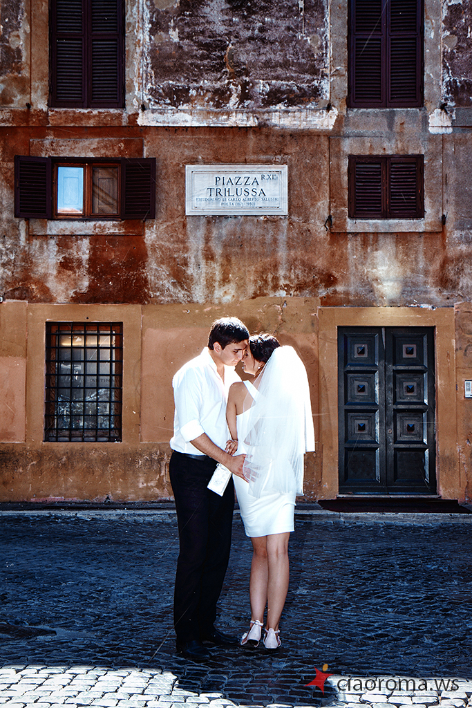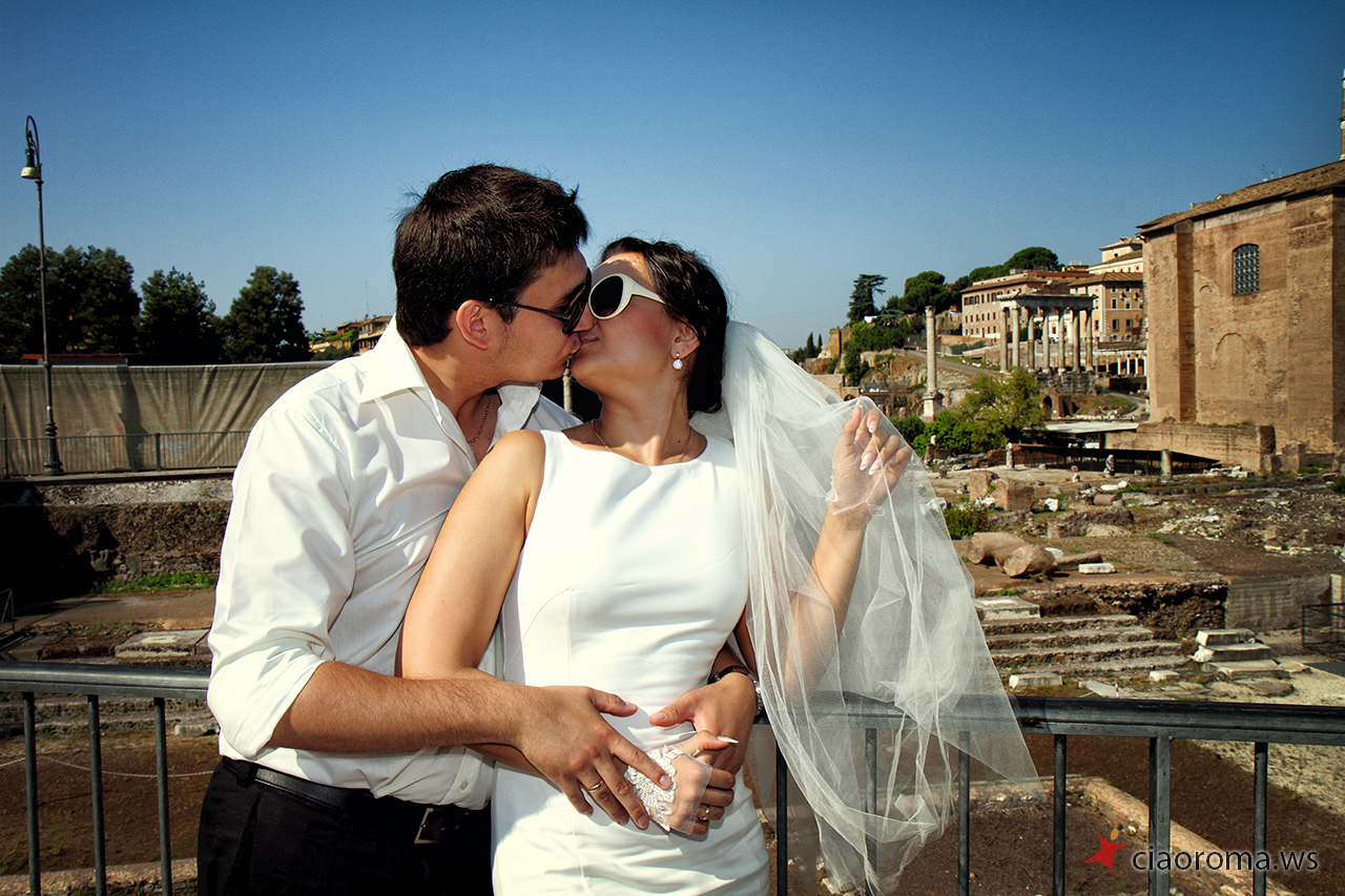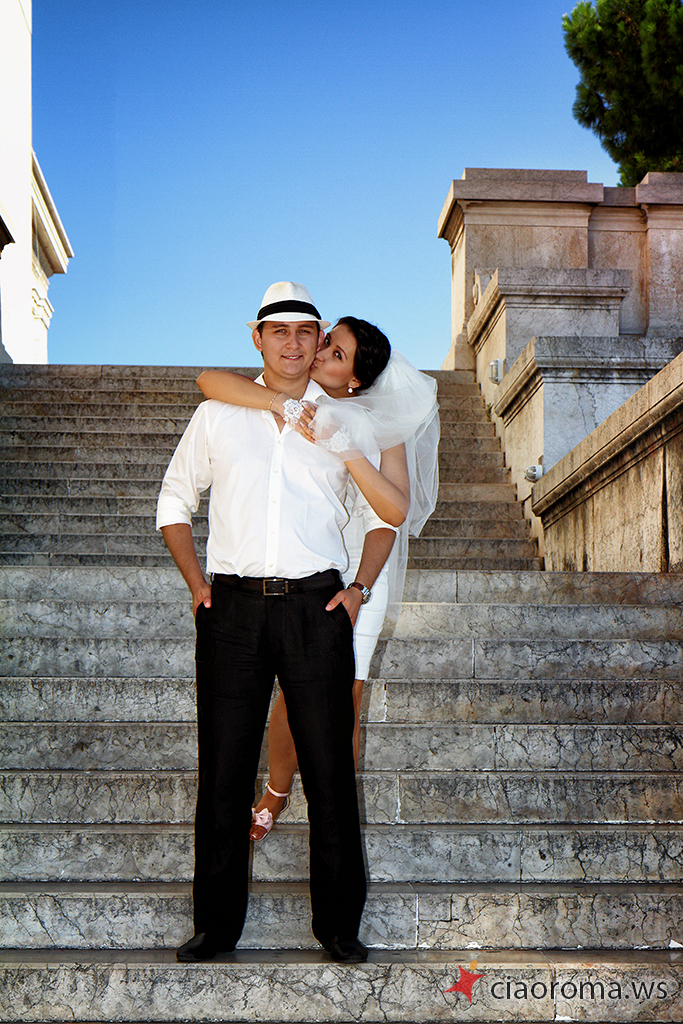 C'è stato fin da subito molto feeling tra me ed i dolci sposini, erano pratici della loro sessione fotografica di matrimonio avuta qualche giorno prima e quindi posavano naturalmente davanti alla mia macchina fotografica. La sessione è iniziata al Colosseo con i loro caldi baci ed abbracci, poi abbiamo proseguito per Via del Colosseo ed abbiamo raggiunto i Fori Imperiali dove ci siamo concessi diverse situazioni fotografiche con lo stupendo panorama che ci circondava. Saliti poi sulla piazza del Campidoglio, abbiamo approfittato della splendida luce che c'era sotto il colonnato e coinvolto gli sposini in un salto per dare un po’ di dinamicità. Qualche foto sulla scalinata, una sulla piazza nel suo completo ed un piccolo caschè di ballo con il sole di punta che ci regala un bellissimo flare. Abbiamo proseguito poi il tour per il Ghetto Ebraico per poi finire la passeggiata a Campo de' Fiori dove abbiamo approfittato del tipico mercatino mattutino fotografando la coppia con i prodotti tipici romani.