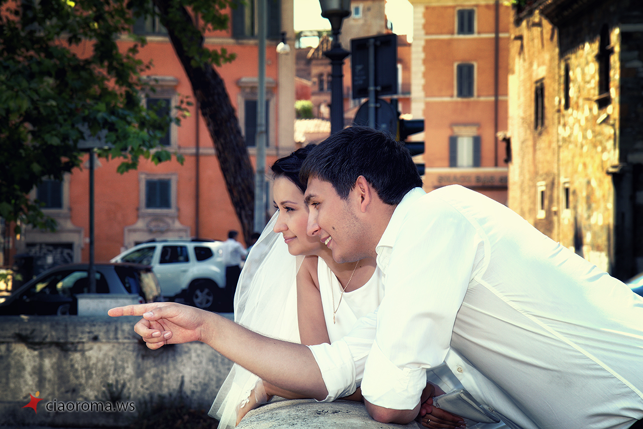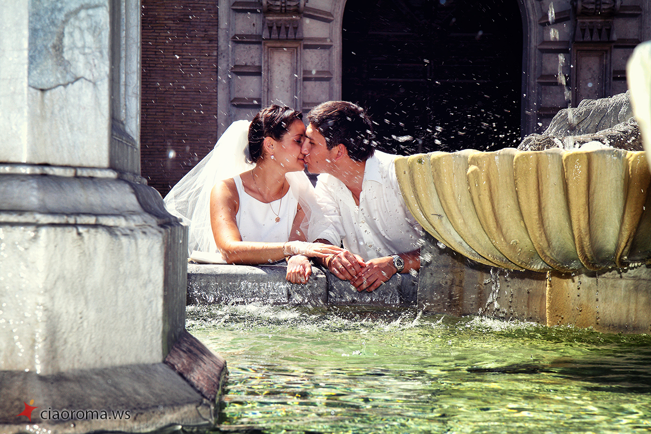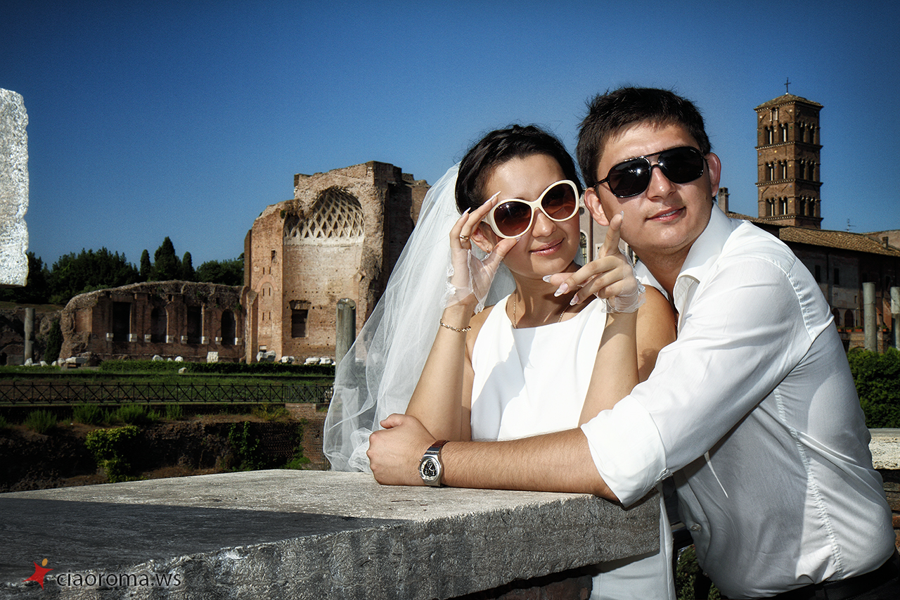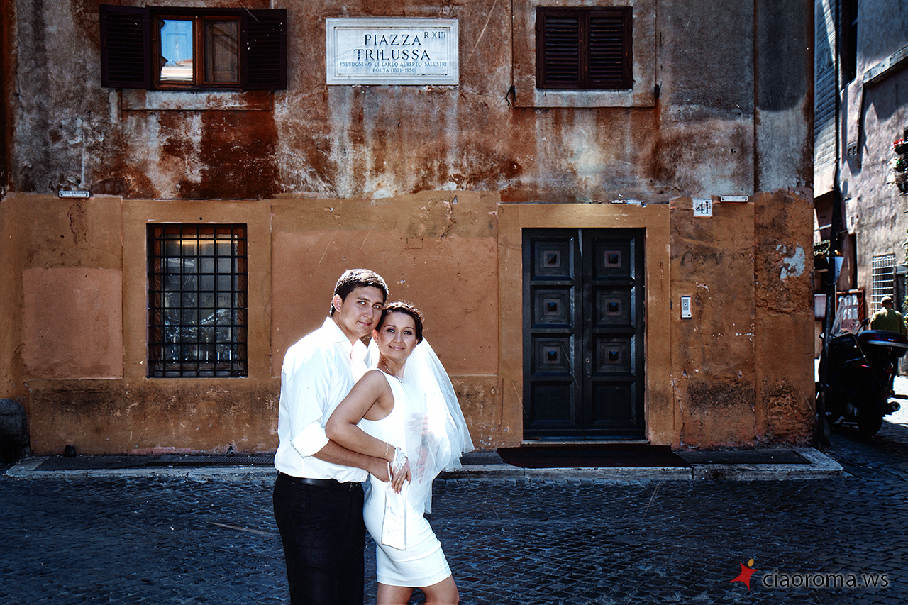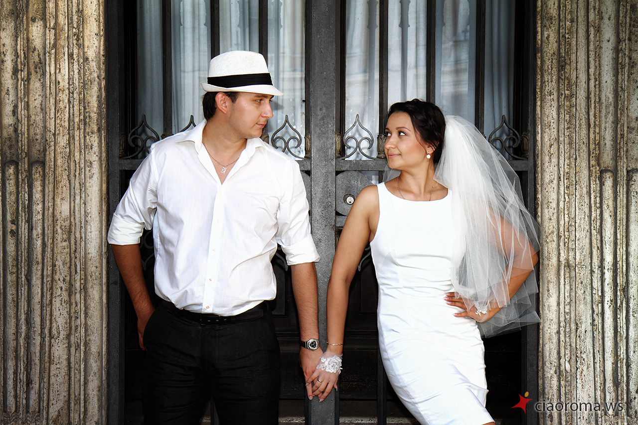 C'è stato fin da subito molto feeling tra me ed i dolci sposini, erano pratici della loro sessione fotografica di matrimonio avuta qualche giorno prima e quindi posavano naturalmente davanti alla mia macchina fotografica. La sessione è iniziata al Colosseo con i loro caldi baci ed abbracci, poi abbiamo proseguito per Via del Colosseo ed abbiamo raggiunto i Fori Imperiali dove ci siamo concessi diverse situazioni fotografiche con lo stupendo panorama che ci circondava. Saliti poi sulla piazza del Campidoglio, abbiamo approfittato della splendida luce che c'era sotto il colonnato e coinvolto gli sposini in un salto per dare un po’ di dinamicità. Qualche foto sulla scalinata, una sulla piazza nel suo completo ed un piccolo caschè di ballo con il sole di punta che ci regala un bellissimo flare. Abbiamo proseguito poi il tour per il Ghetto Ebraico per poi finire la passeggiata a Campo de' Fiori dove abbiamo approfittato del tipico mercatino mattutino fotografando la coppia con i prodotti tipici romani.