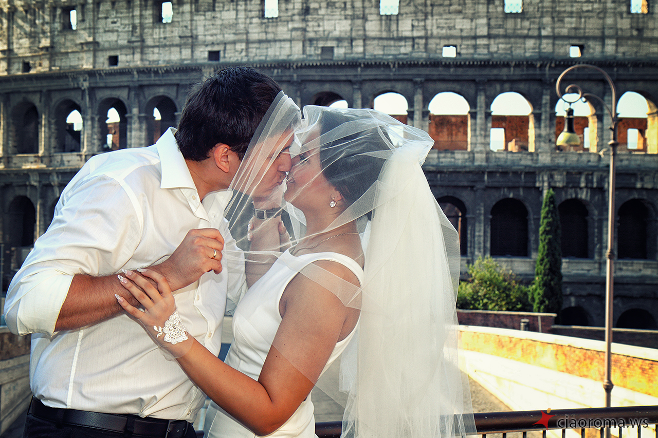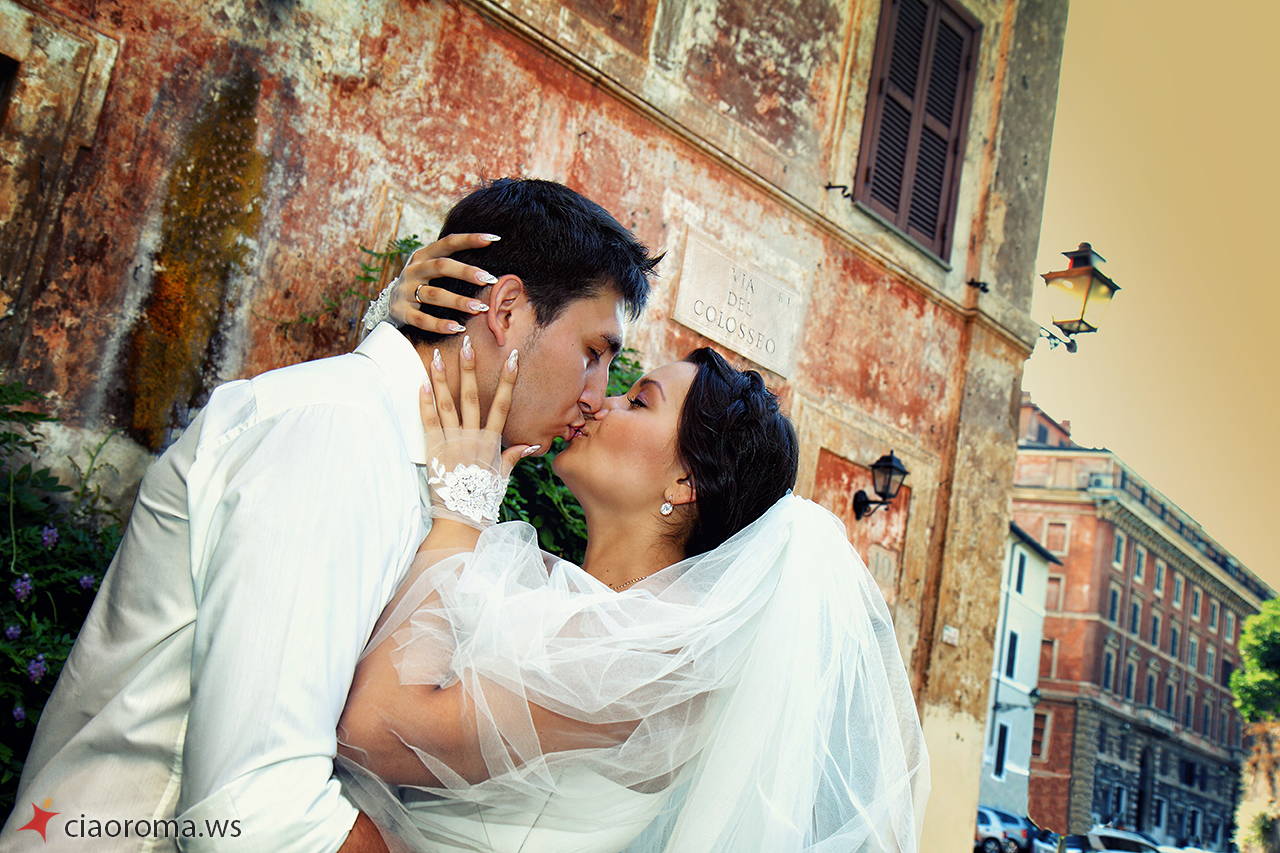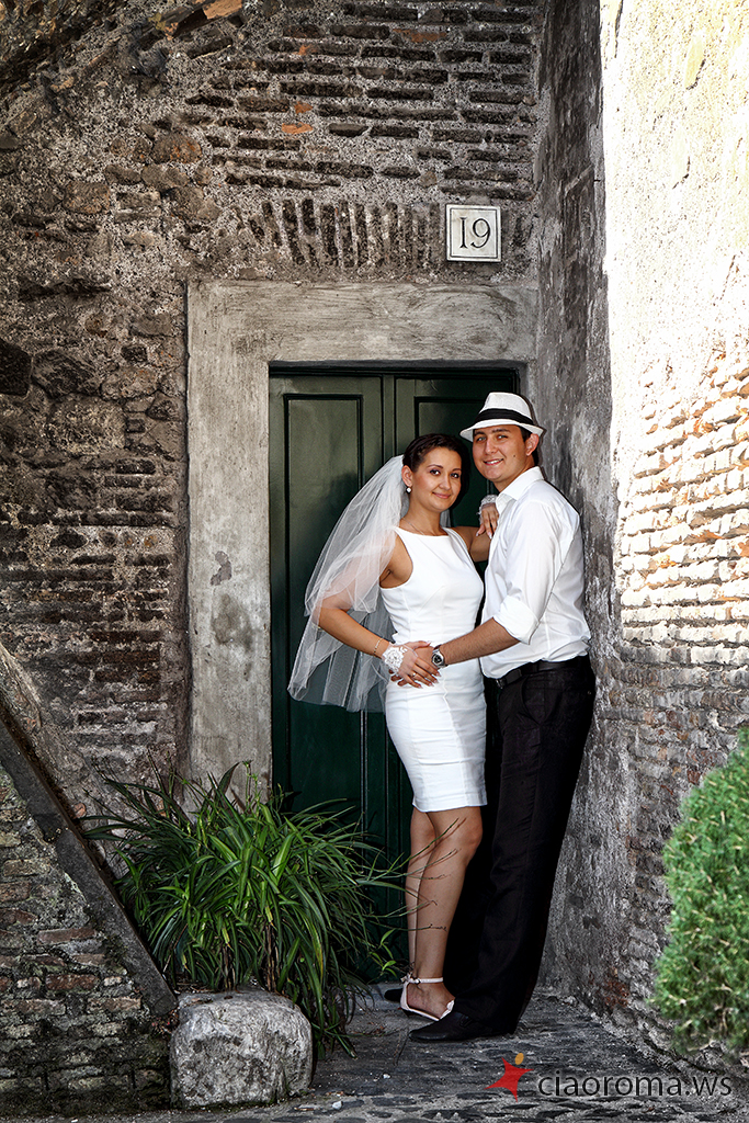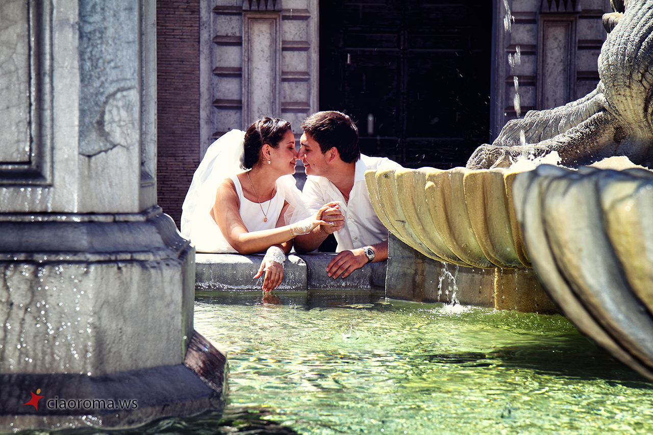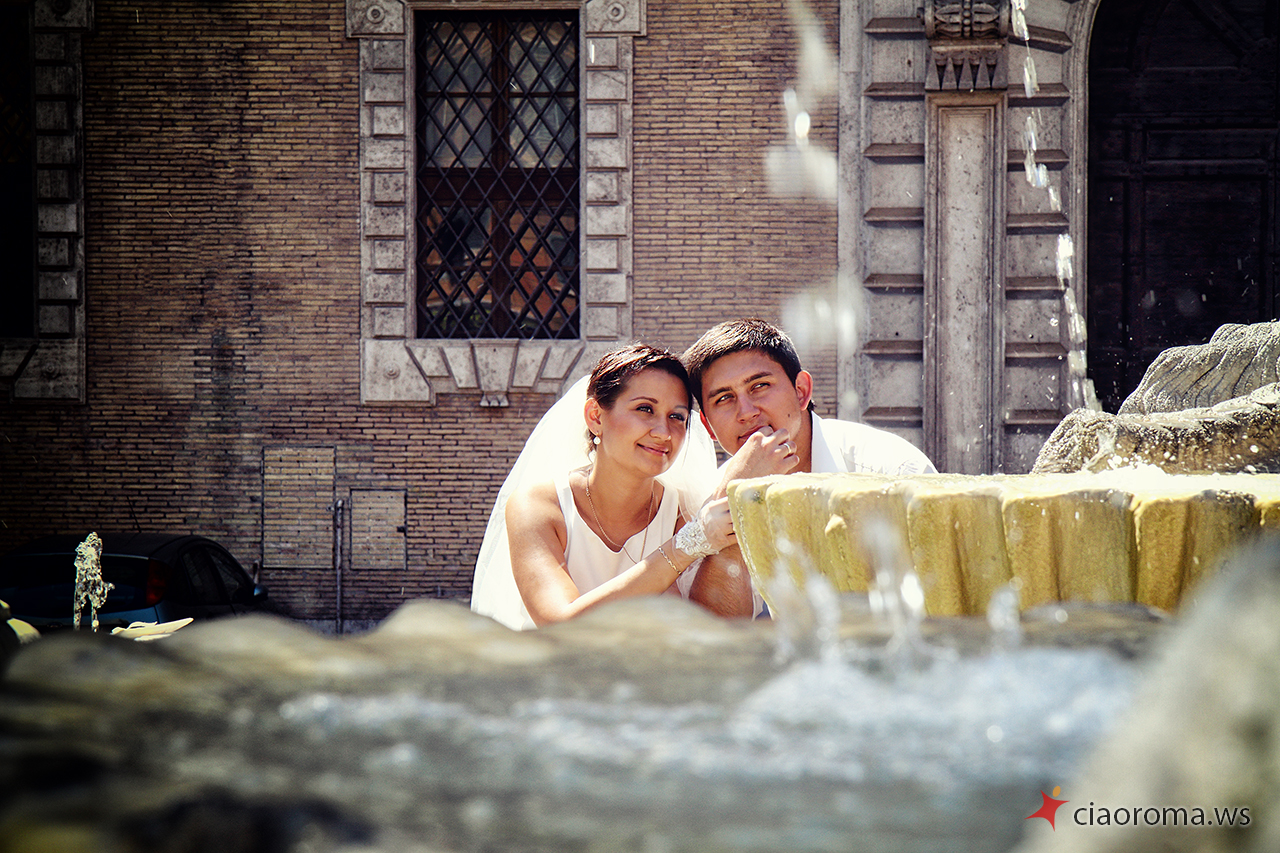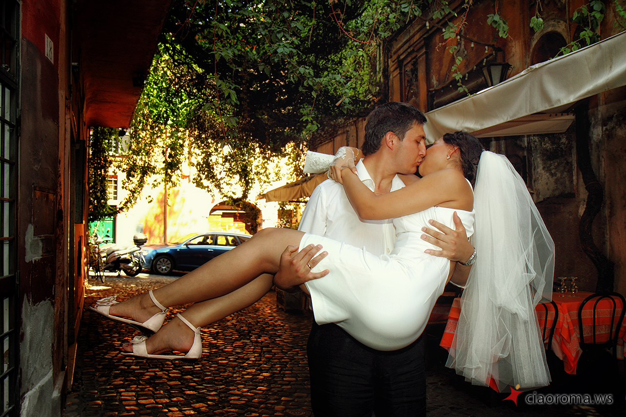 C'è stato fin da subito molto feeling tra me ed i dolci sposini, erano pratici della loro sessione fotografica di matrimonio avuta qualche giorno prima e quindi posavano naturalmente davanti alla mia macchina fotografica. La sessione è iniziata al Colosseo con i loro caldi baci ed abbracci, poi abbiamo proseguito per Via del Colosseo ed abbiamo raggiunto i Fori Imperiali dove ci siamo concessi diverse situazioni fotografiche con lo stupendo panorama che ci circondava. Saliti poi sulla piazza del Campidoglio, abbiamo approfittato della splendida luce che c'era sotto il colonnato e coinvolto gli sposini in un salto per dare un po’ di dinamicità. Qualche foto sulla scalinata, una sulla piazza nel suo completo ed un piccolo caschè di ballo con il sole di punta che ci regala un bellissimo flare. Abbiamo proseguito poi il tour per il Ghetto Ebraico per poi finire la passeggiata a Campo de' Fiori dove abbiamo approfittato del tipico mercatino mattutino fotografando la coppia con i prodotti tipici romani.