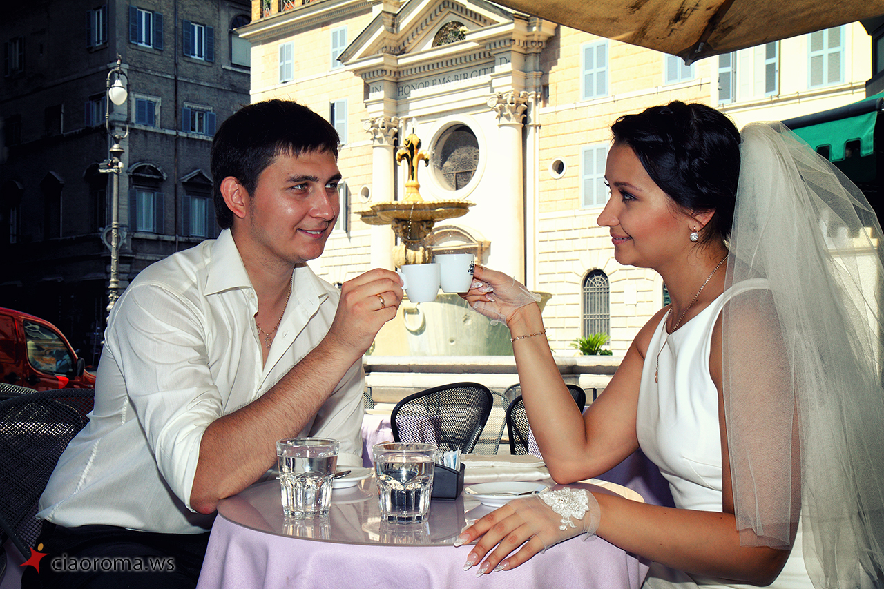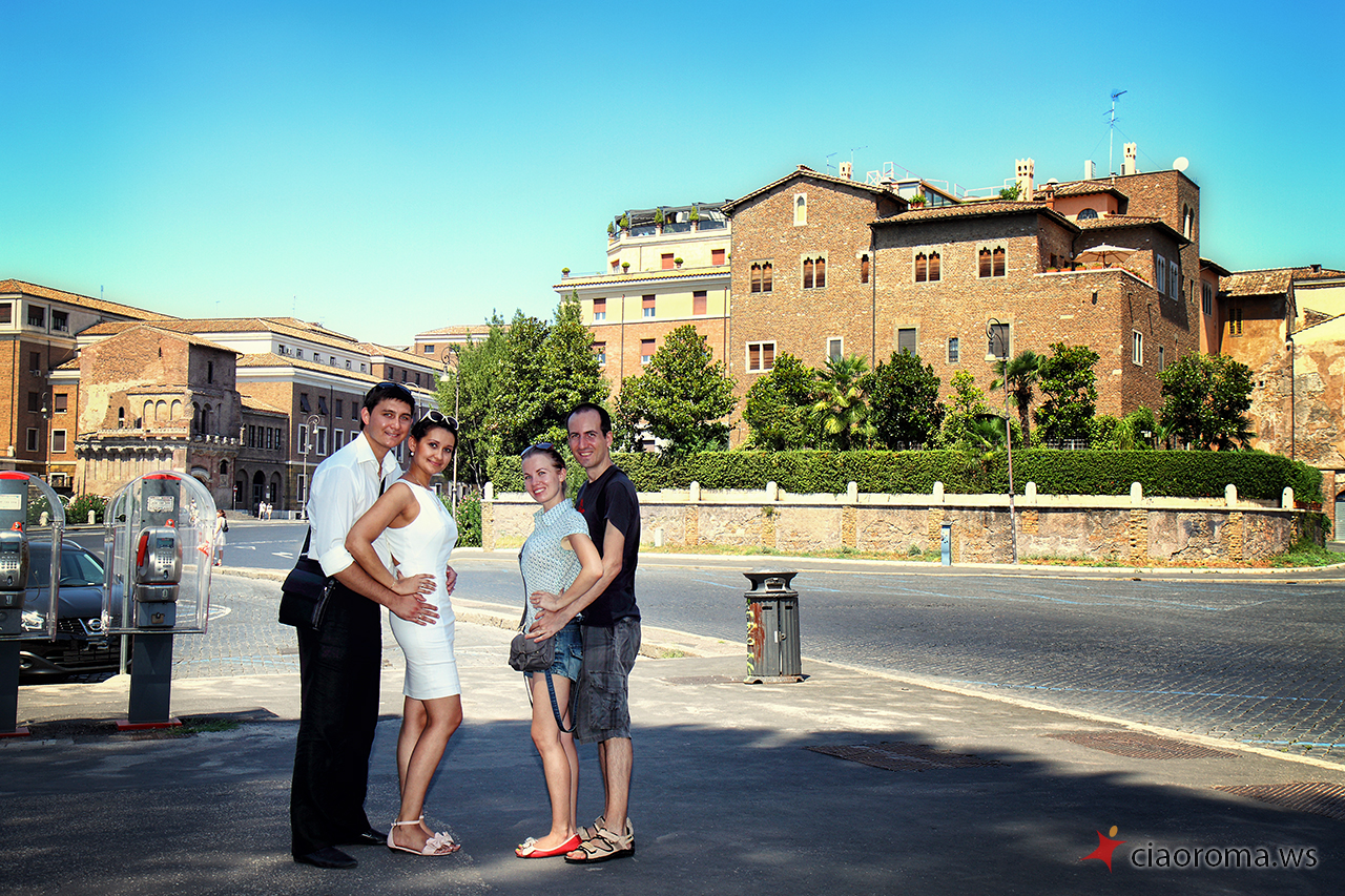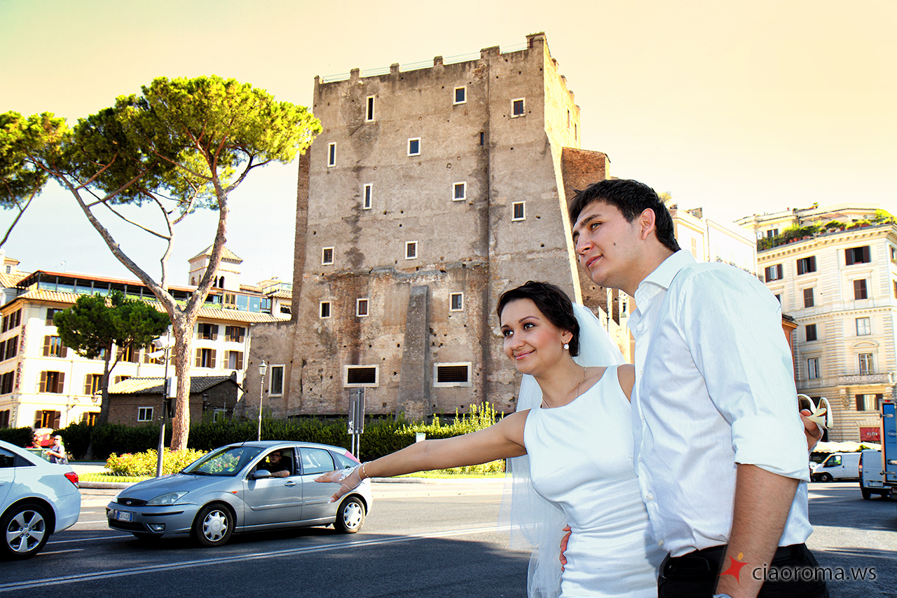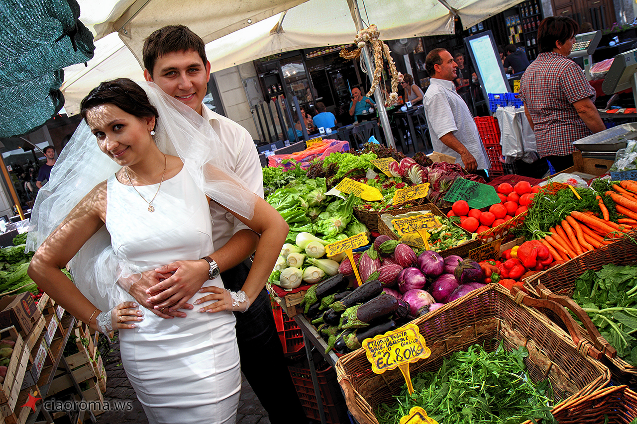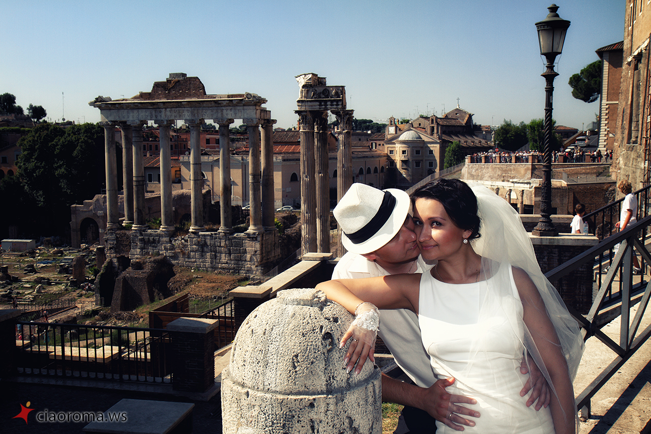 C'è stato fin da subito molto feeling tra me ed i dolci sposini, erano pratici della loro sessione fotografica di matrimonio avuta qualche giorno prima e quindi posavano naturalmente davanti alla mia macchina fotografica. La sessione è iniziata al Colosseo con i loro caldi baci ed abbracci, poi abbiamo proseguito per Via del Colosseo ed abbiamo raggiunto i Fori Imperiali dove ci siamo concessi diverse situazioni fotografiche con lo stupendo panorama che ci circondava. Saliti poi sulla piazza del Campidoglio, abbiamo approfittato della splendida luce che c'era sotto il colonnato e coinvolto gli sposini in un salto per dare un po’ di dinamicità. Qualche foto sulla scalinata, una sulla piazza nel suo completo ed un piccolo caschè di ballo con il sole di punta che ci regala un bellissimo flare. Abbiamo proseguito poi il tour per il Ghetto Ebraico per poi finire la passeggiata a Campo de' Fiori dove abbiamo approfittato del tipico mercatino mattutino fotografando la coppia con i prodotti tipici romani.