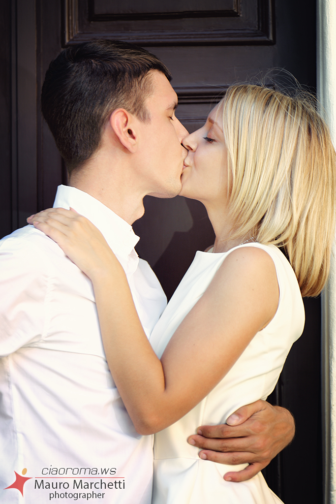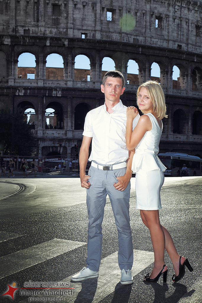 Ci siamo incontrati alla Metro Colosseo ed abbiamo iniziato la nostra sessione fotografica nella zona tra via Labicana e la Domus Aurea. La bionda Olga era vestita di un bellissimo tailleur bianco che le donava una bellissima forma smagliante, Aleksey aveva una camicia bianca con un pantalone in cotone grigio. Ci fermavamo nei punti più suggestivi di Roma per catturare la magia della loro veloce gita romana, con muri particolari, portoni, un ristorantino con la vetrina piena di pesce fresco, e poi una pausa a Piazza del Quirinale per non farci mancare la bellissima luce che ci avvolgeva. Molto belle sono le foto in uno dei vicoletti che abbiamo percorso prima di arrivare a Fontana di Trevi, con i caratteristici sampietrini ed il colore giallognolo dei muri delle case romane. Il lancio della moneta non ha creato molta emozione in Aleksey, ma il momento ricordato è comunque simpatico. Dopo il lancio della moneta nella fontana abbiamo proseguito la passeggiata in direzione di Via Nazionale, non prima però di immortalare con una bella foto il loro bacio e la scritta That’s Amore di un ristorante dietro di loro. Suggestive le foto dentro il tunnel con una spettacolare luce verde smeraldo che attira l’attenzione ed accentua la giovane coppia russa che passeggia.