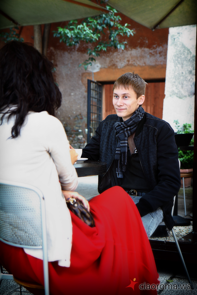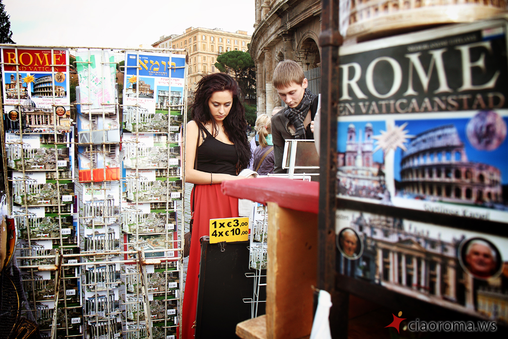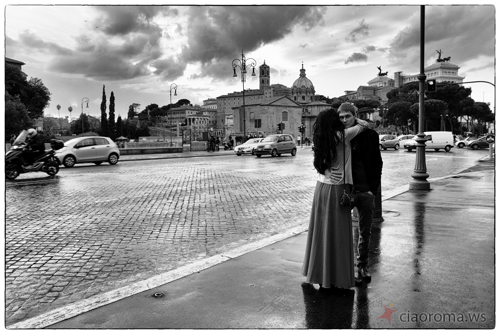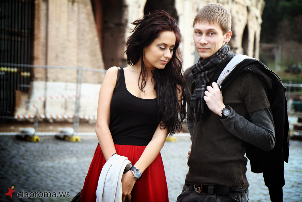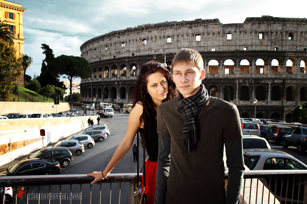 I due ragazzi sono molto giovani, manifestano una normale freddezza davanti l'obiettivo, come quando si ha dello scetticismo di fronte ad una persona che non si conosce. Infatti la naturalezza nelle foto che abbiamo effettuato la troviamo solo dopo circa metà sessione quando i due ragazzi si sono rilassati ed hanno trovato con me il giusto feeling. Abbiamo iniziato il tour fotografico dal Colosseo per poi proseguire per i Fori Imperiali e, colti da un acquazzone improvviso (solo 10 minuti), abbiamo approfittato di un bar per prenderci un caffè e fare qualche altra foto particolare con i balconi in classico stile centro/sud Italia addobbati dai vestiti stesi ad asciugare.