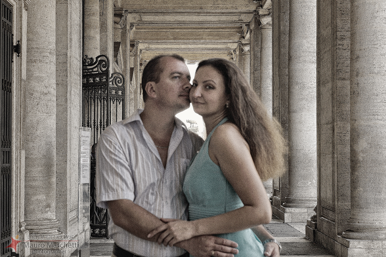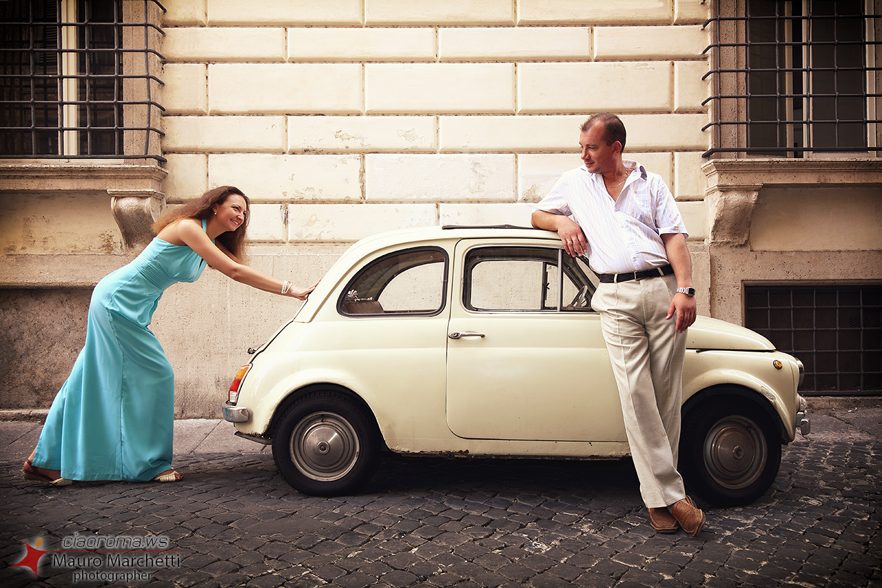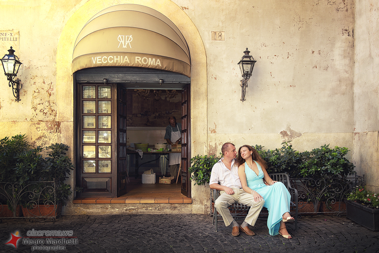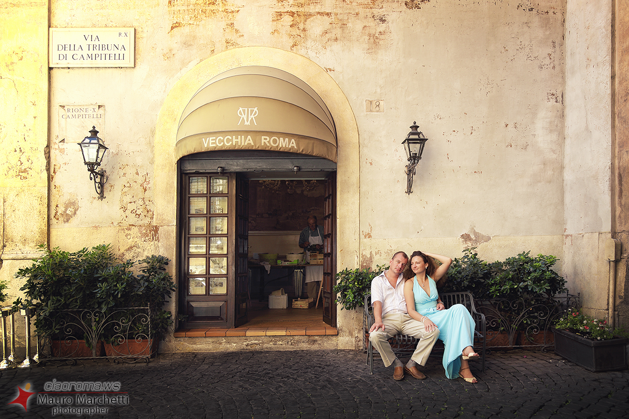 Abbiamo iniziato il nostro tour nei pressi dell’Hotel dove la coppia alloggiava, poco dietro il Parco di Colle Oppio, dove mi si è presentata una bella situazione: un negozio di strumenti a fiato con in vetrina alcuni sax, una fontana (a Roma lo chiamiamo nasone), e poco più a sinistra che cos’è? Guardate la prima foto per scoprirlo. La sessione fotografica è poi proseguita attraverso il parco con bellissimi scorci del Colosseo ed il sole che, mentre sorgeva, ci regalava dei bellissimi riflessi sui capelli di Ekaterina. Bellissimo il cielo catturato sulla foto in via dei Fori Imperiali, ho potuto realizzare con esso un’ottima panoramica delle rovine romane. Saliti poi sul campidoglio, abbiamo realizzato alcune foto sotto il colonnato e sulla scalinata che porta giù per Piazza Venezia per poi sederci al caffè Roma e dare un tocco di romanticità alla nostra coppia. In una delle vie poco dietro al bar, ho realizzato qualche ritratto singolo con uno splendido albero che sorgeva attaccatissimo al muro di una vecchia casa. Siamo anche stati fortunati a trovare, in una vietta del Ghetto Ebraico, una favolosa Fiat 500 che ci è servita da modella per qualche simpatica foto. La nostra sessione è terminata alla taverna Vecchia Roma, dove ci aspettava una bella panchina ed il cuoco che si apprestava a preparare le pietanze per il prossimo pranzo.