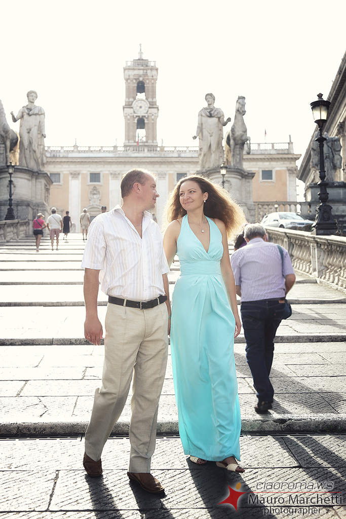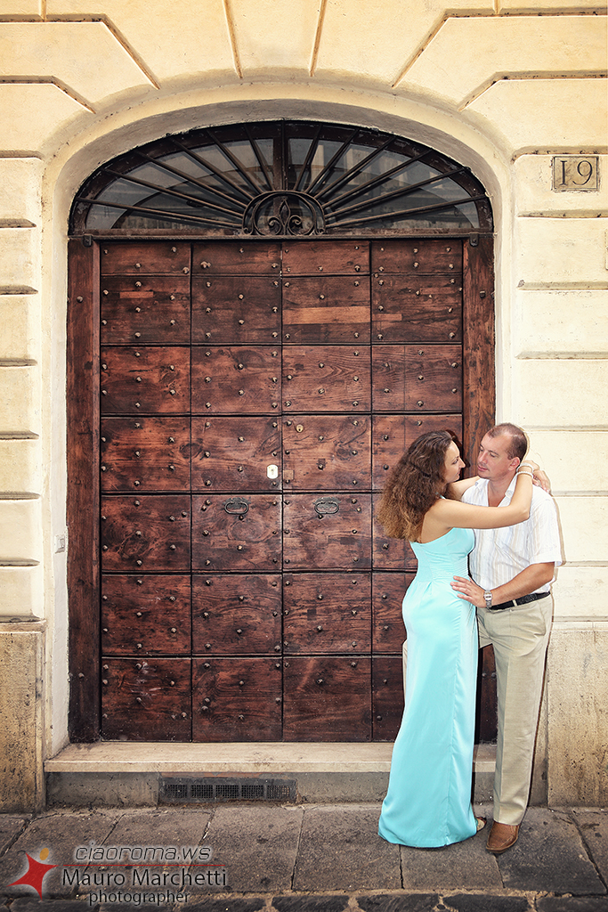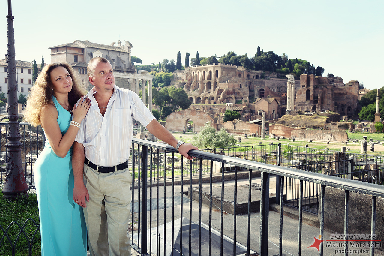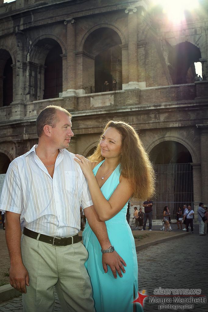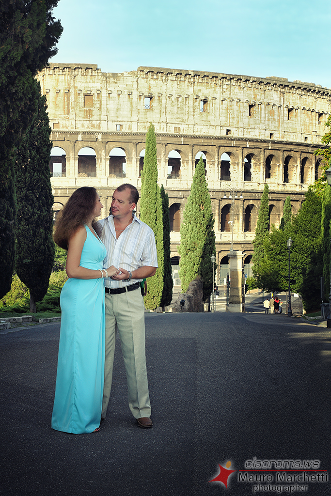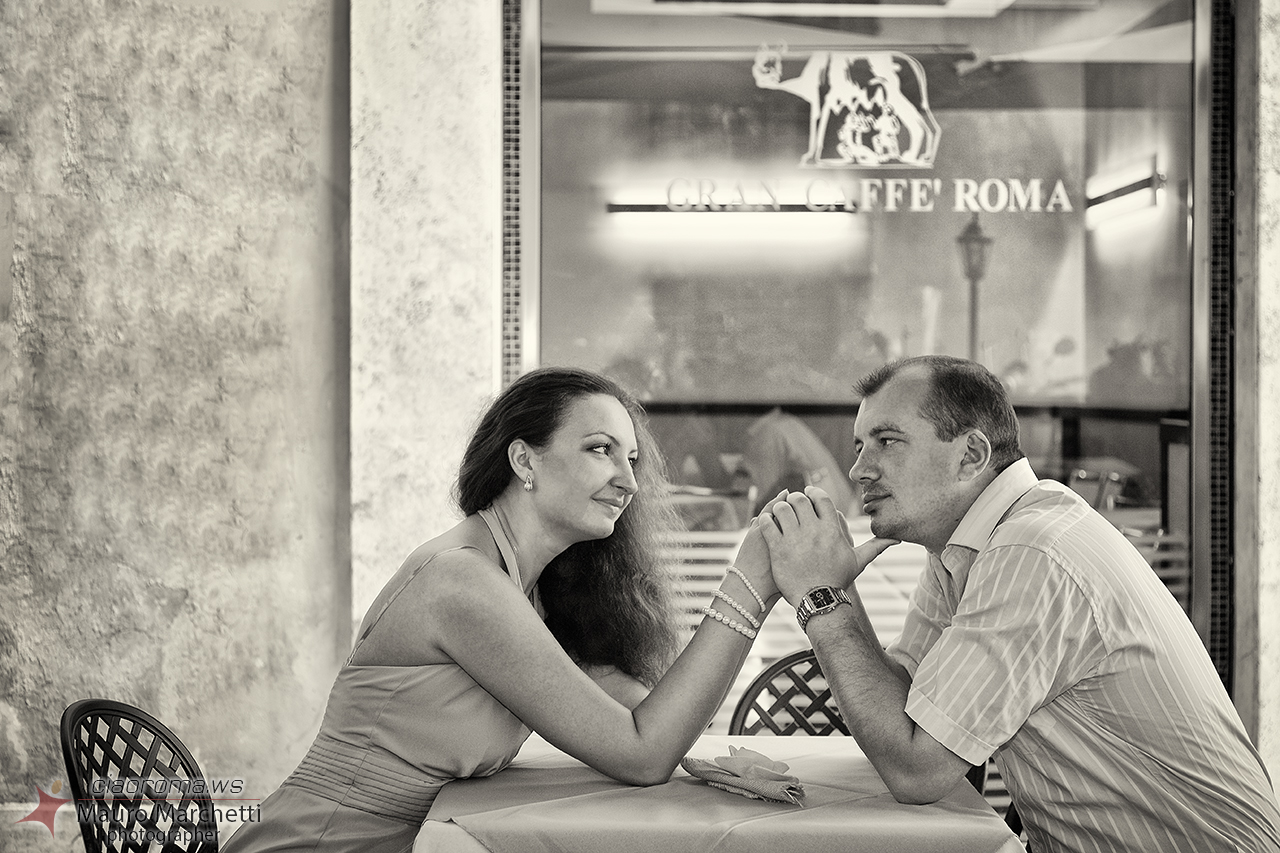Abbiamo iniziato il nostro tour nei pressi dell’Hotel dove la coppia alloggiava, poco dietro il Parco di Colle Oppio, dove mi si è presentata una bella situazione: un negozio di strumenti a fiato con in vetrina alcuni sax, una fontana (a Roma lo chiamiamo nasone), e poco più a sinistra che cos’è? Guardate la prima foto per scoprirlo. La sessione fotografica è poi proseguita attraverso il parco con bellissimi scorci del Colosseo ed il sole che, mentre sorgeva, ci regalava dei bellissimi riflessi sui capelli di Ekaterina. Bellissimo il cielo catturato sulla foto in via dei Fori Imperiali, ho potuto realizzare con esso un’ottima panoramica delle rovine romane. Saliti poi sul campidoglio, abbiamo realizzato alcune foto sotto il colonnato e sulla scalinata che porta giù per Piazza Venezia per poi sederci al caffè Roma e dare un tocco di romanticità alla nostra coppia. In una delle vie poco dietro al bar, ho realizzato qualche ritratto singolo con uno splendido albero che sorgeva attaccatissimo al muro di una vecchia casa. Siamo anche stati fortunati a trovare, in una vietta del Ghetto Ebraico, una favolosa Fiat 500 che ci è servita da modella per qualche simpatica foto. La nostra sessione è terminata alla taverna Vecchia Roma, dove ci aspettava una bella panchina ed il cuoco che si apprestava a preparare le pietanze per il prossimo pranzo.