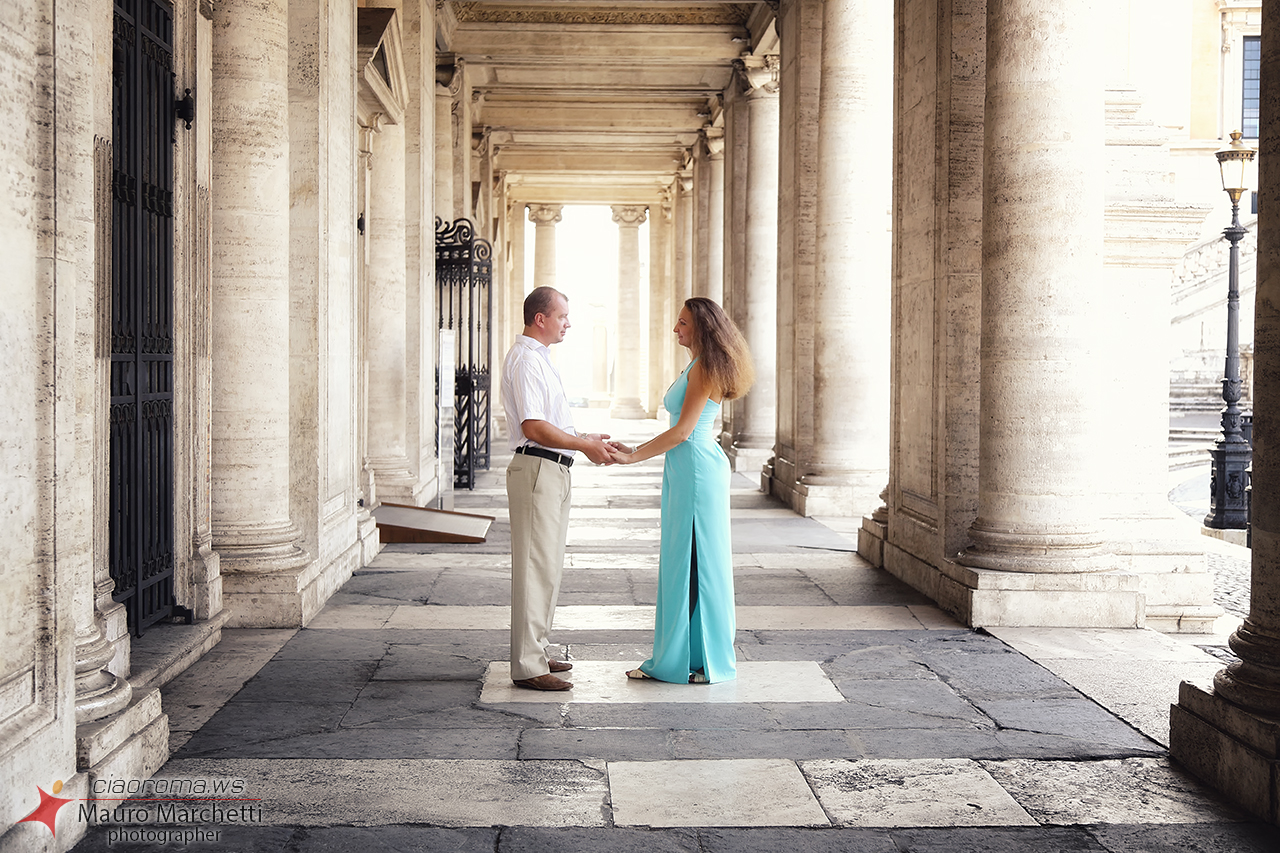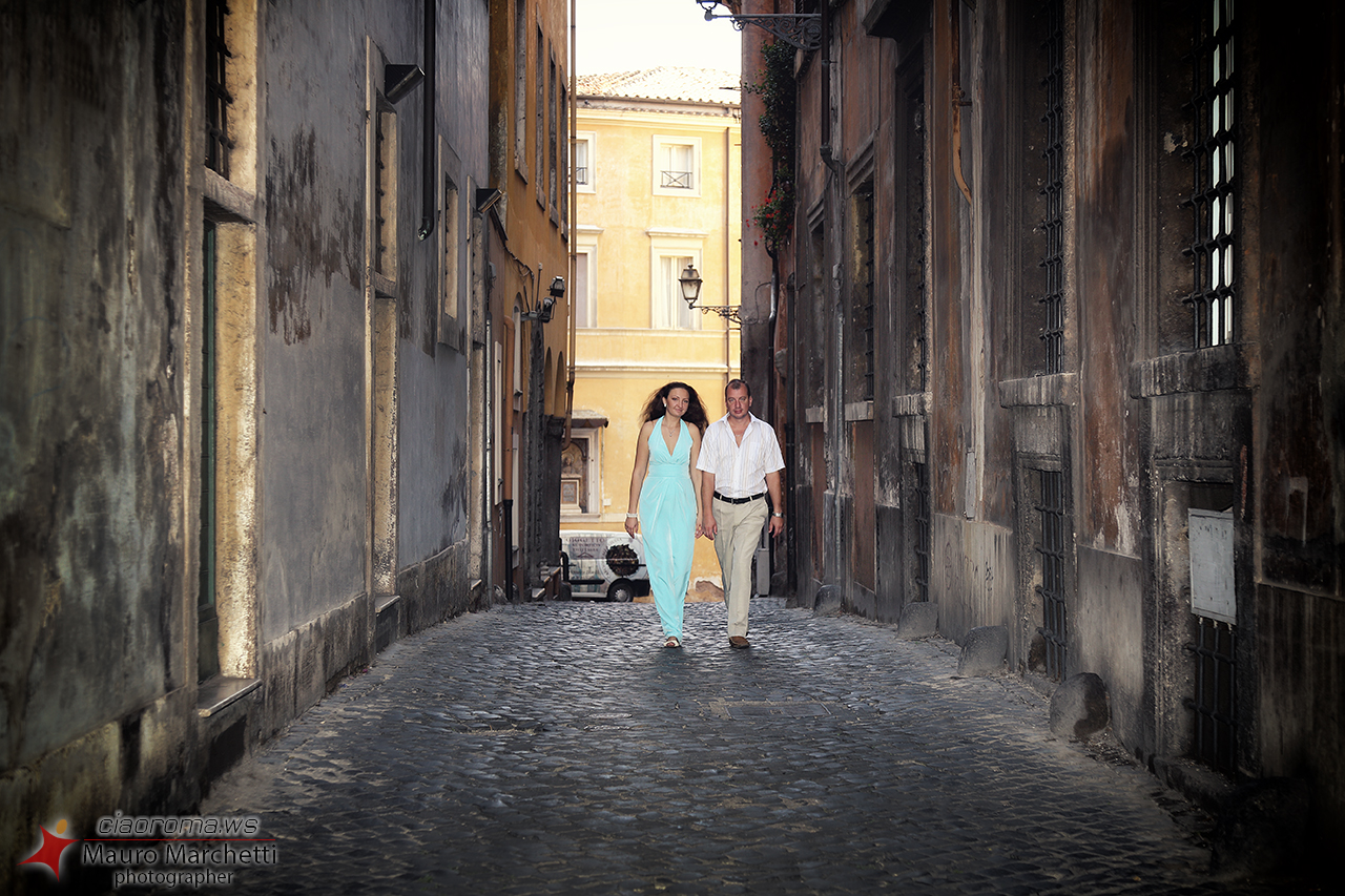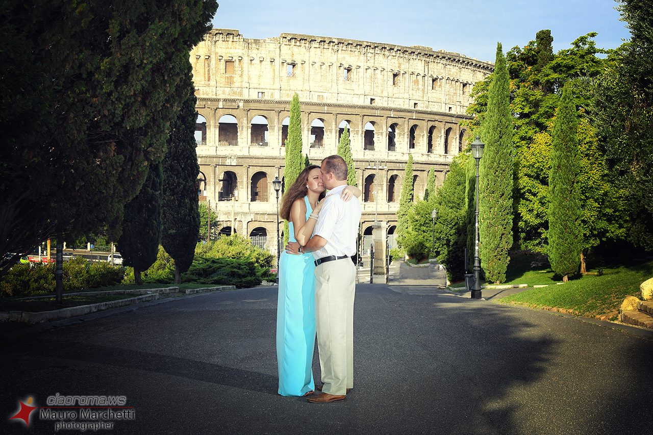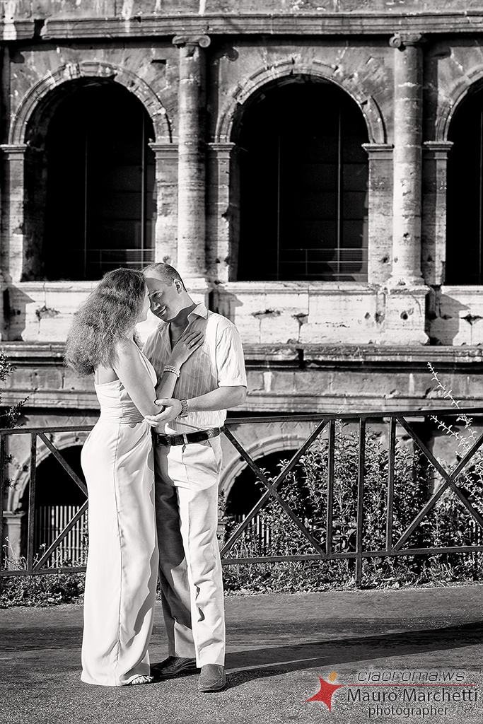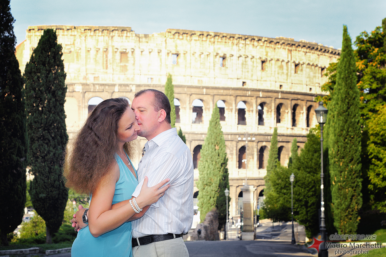 Abbiamo iniziato il nostro tour nei pressi dell’Hotel dove la coppia alloggiava, poco dietro il Parco di Colle Oppio, dove mi si è presentata una bella situazione: un negozio di strumenti a fiato con in vetrina alcuni sax, una fontana (a Roma lo chiamiamo nasone), e poco più a sinistra che cos’è? Guardate la prima foto per scoprirlo. La sessione fotografica è poi proseguita attraverso il parco con bellissimi scorci del Colosseo ed il sole che, mentre sorgeva, ci regalava dei bellissimi riflessi sui capelli di Ekaterina. Bellissimo il cielo catturato sulla foto in via dei Fori Imperiali, ho potuto realizzare con esso un’ottima panoramica delle rovine romane. Saliti poi sul campidoglio, abbiamo realizzato alcune foto sotto il colonnato e sulla scalinata che porta giù per Piazza Venezia per poi sederci al caffè Roma e dare un tocco di romanticità alla nostra coppia. In una delle vie poco dietro al bar, ho realizzato qualche ritratto singolo con uno splendido albero che sorgeva attaccatissimo al muro di una vecchia casa. Siamo anche stati fortunati a trovare, in una vietta del Ghetto Ebraico, una favolosa Fiat 500 che ci è servita da modella per qualche simpatica foto. La nostra sessione è terminata alla taverna Vecchia Roma, dove ci aspettava una bella panchina ed il cuoco che si apprestava a preparare le pietanze per il prossimo pranzo.