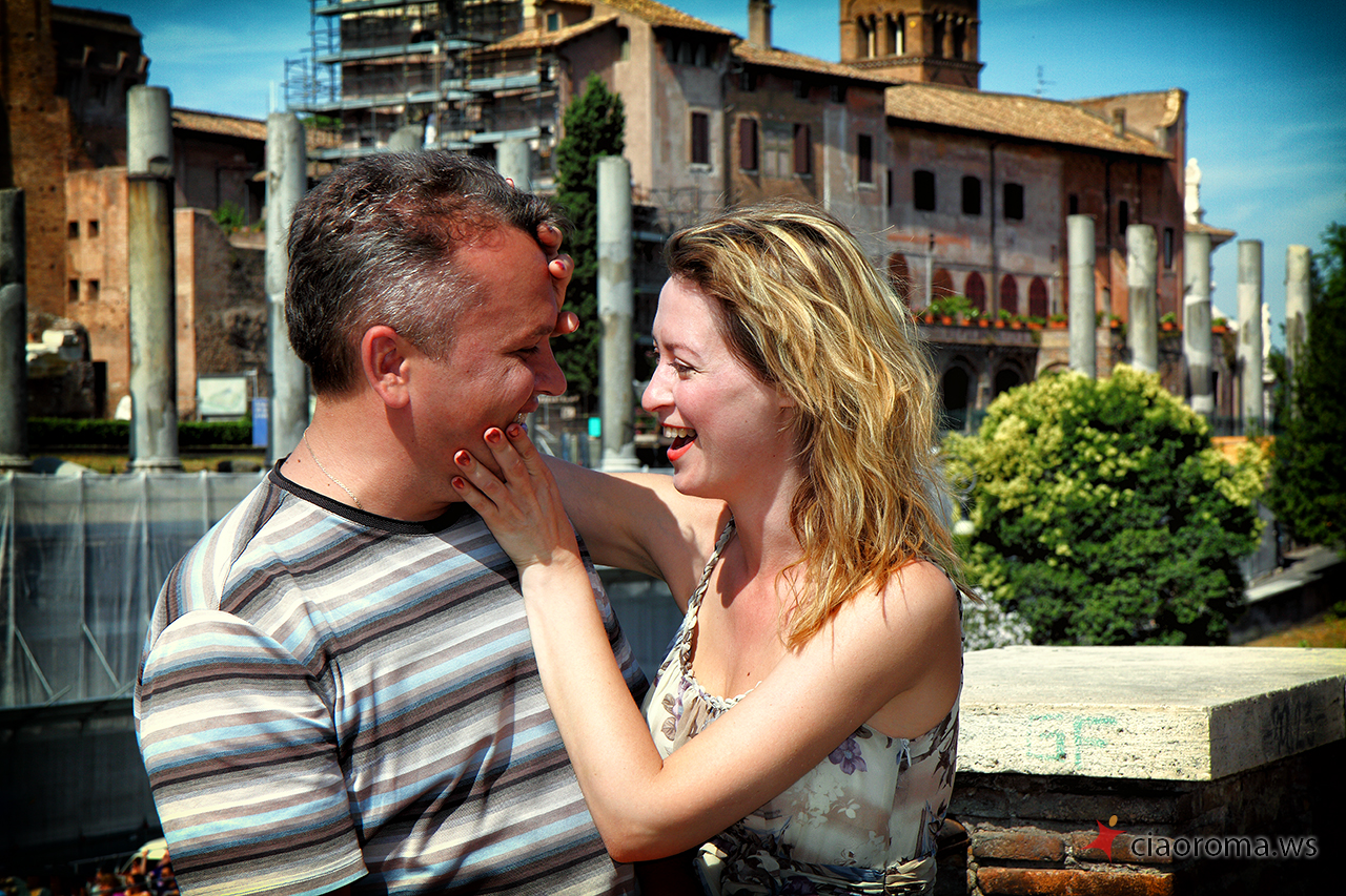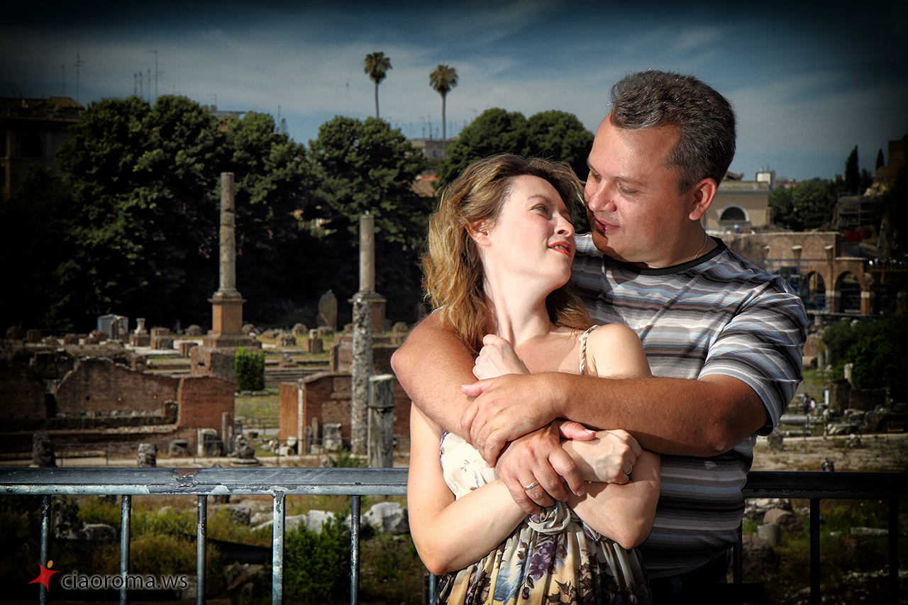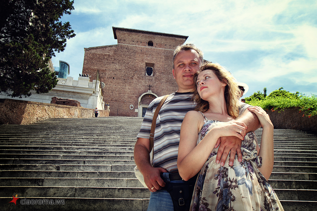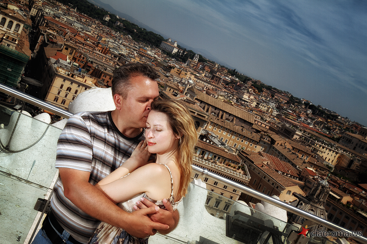 La coppia di Stavropol' è simpatica, lei si lascia facilmente coinvolgere dal marito per dimostrargli la naturalezza e l’energia che è dentro di lei, trasmette felicità! Si lasciano catturare naturalmente in posizioni posate e naturali mentre camminiamo per i Fori Imperiali, anche quando incontriamo una band di musicisti per strada che ci coinvolgono nelle loro musiche turistiche. La nostra camminata ci porta al Campidoglio per farci scoprire, lungo la scalinata nei pressi della famosa Lupa simbolo di Roma, un nuovo panorama dei Fori Imperiali che ho catturato in diverse condizioni di luce per la loro memoria. Proseguiamo poi per l’Altare della Patria dove non ci facciamo mancare la veduta panoramica dall’ultimo piano del monumento, di tutta Roma, dove spiccano Via del Corso e l’Aventino. Alcuni scatti simpatici con i cannocchiali messi a disposizione dal comune con ancora qualche foto simpatica e romantica. La più bella foto, felice, spensierata, libera, è per me quella davanti il piazzale della Basilica di Santa Maria in Ara Coeli dove un gruppo di colombe prende il volo di fronte la felice coppia innamorata che corre verso di me che li fotografo!
