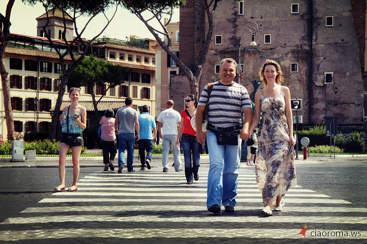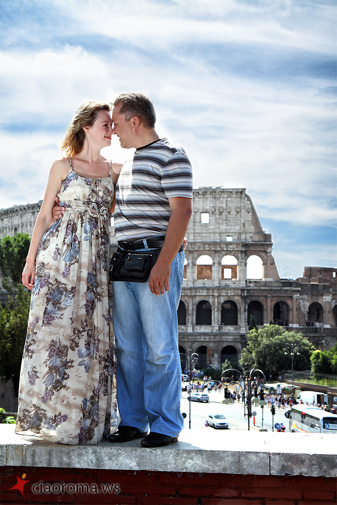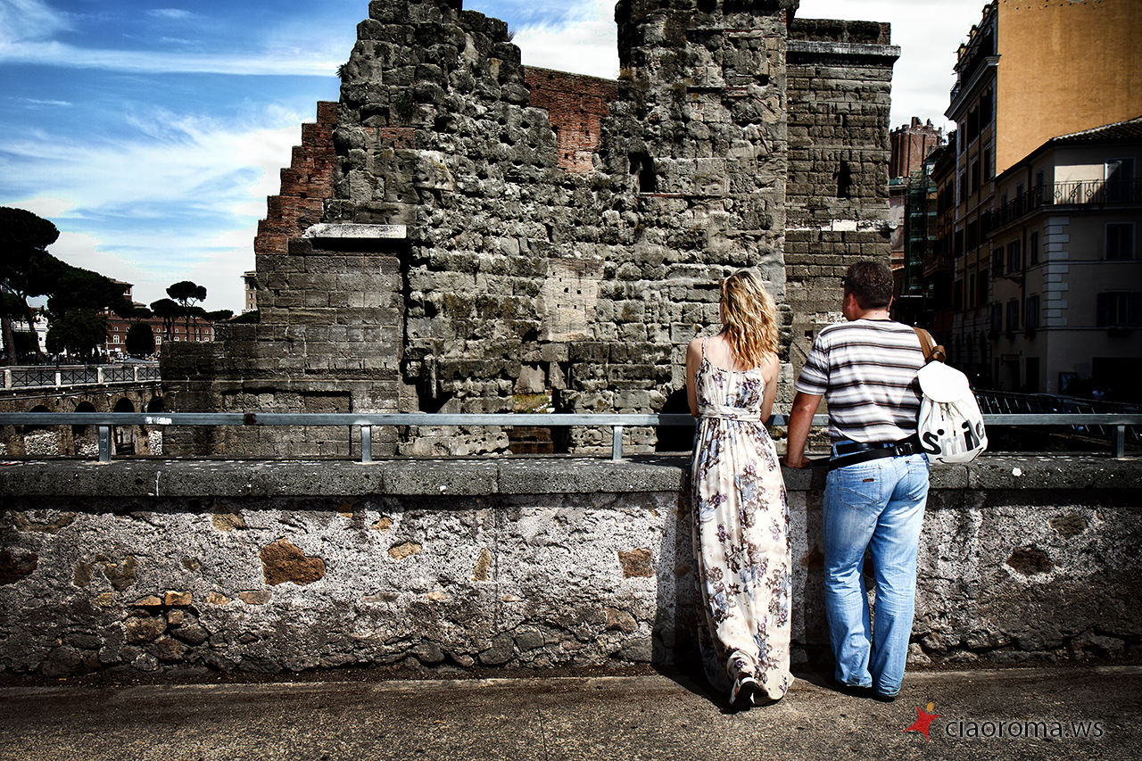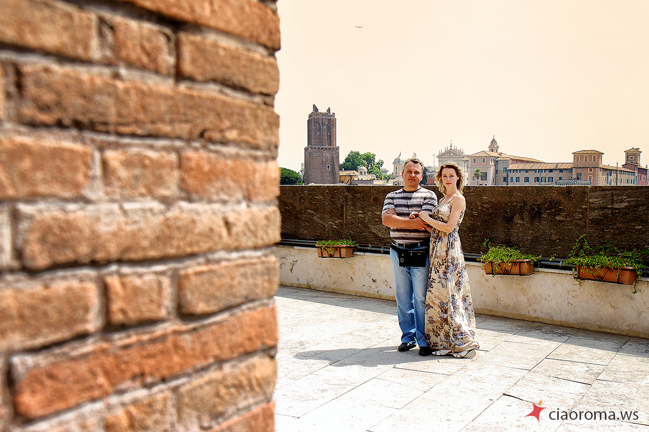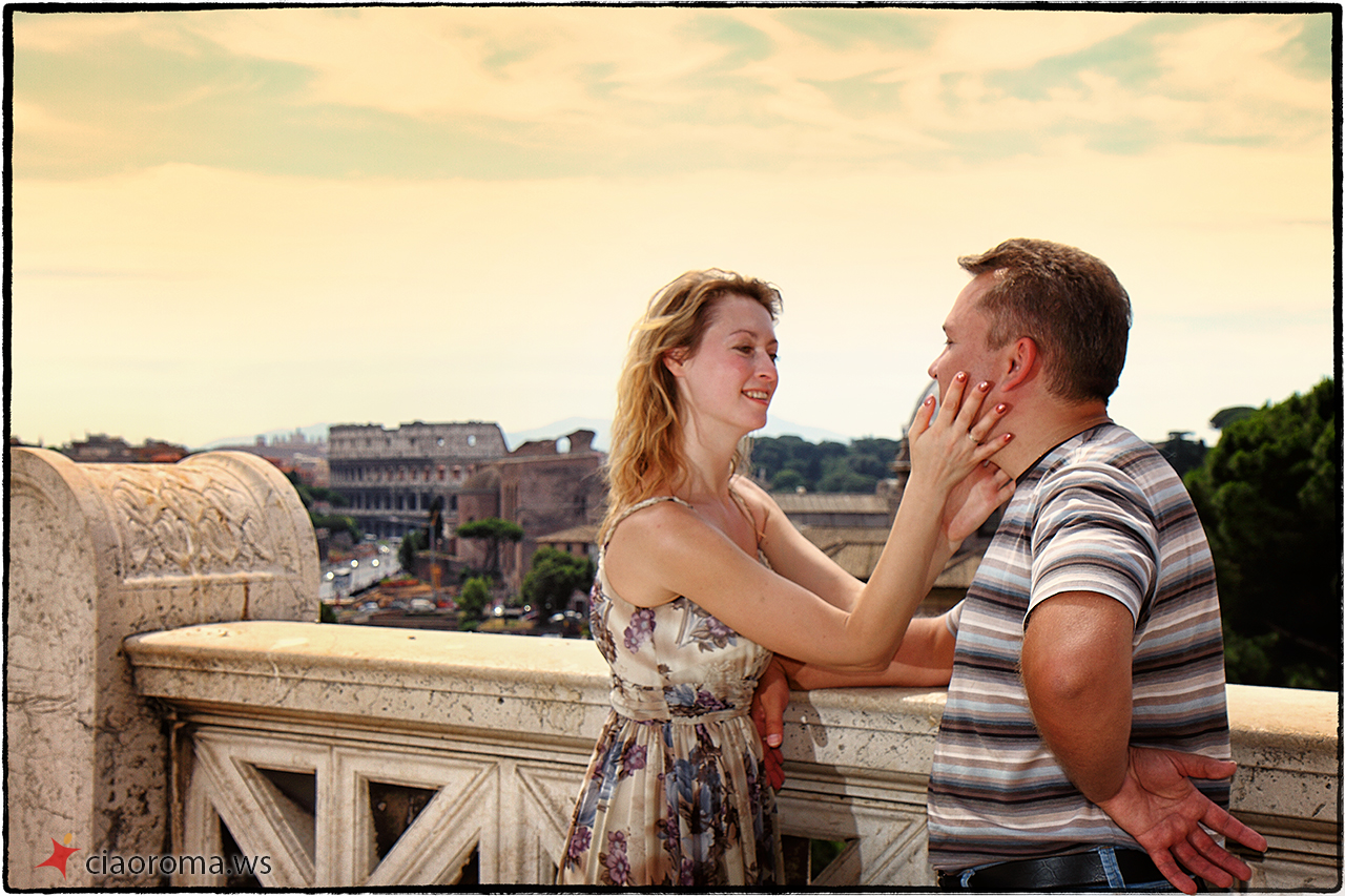 La coppia di Stavropol' è simpatica, lei si lascia facilmente coinvolgere dal marito per dimostrargli la naturalezza e l’energia che è dentro di lei, trasmette felicità! Si lasciano catturare naturalmente in posizioni posate e naturali mentre camminiamo per i Fori Imperiali, anche quando incontriamo una band di musicisti per strada che ci coinvolgono nelle loro musiche turistiche. La nostra camminata ci porta al Campidoglio per farci scoprire, lungo la scalinata nei pressi della famosa Lupa simbolo di Roma, un nuovo panorama dei Fori Imperiali che ho catturato in diverse condizioni di luce per la loro memoria. Proseguiamo poi per l’Altare della Patria dove non ci facciamo mancare la veduta panoramica dall’ultimo piano del monumento, di tutta Roma, dove spiccano Via del Corso e l’Aventino. Alcuni scatti simpatici con i cannocchiali messi a disposizione dal comune con ancora qualche foto simpatica e romantica. La più bella foto, felice, spensierata, libera, è per me quella davanti il piazzale della Basilica di Santa Maria in Ara Coeli dove un gruppo di colombe prende il volo di fronte la felice coppia innamorata che corre verso di me che li fotografo!