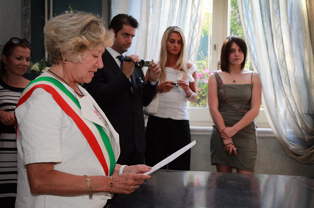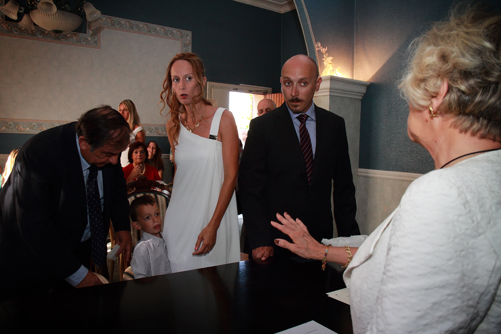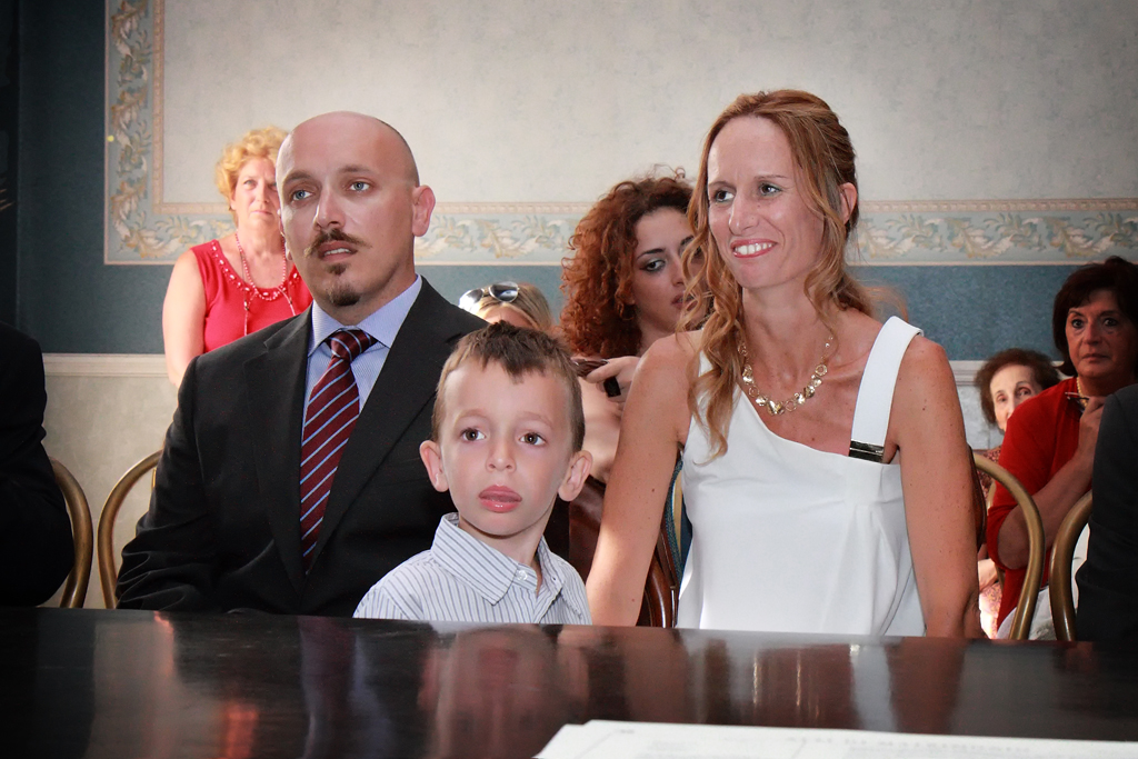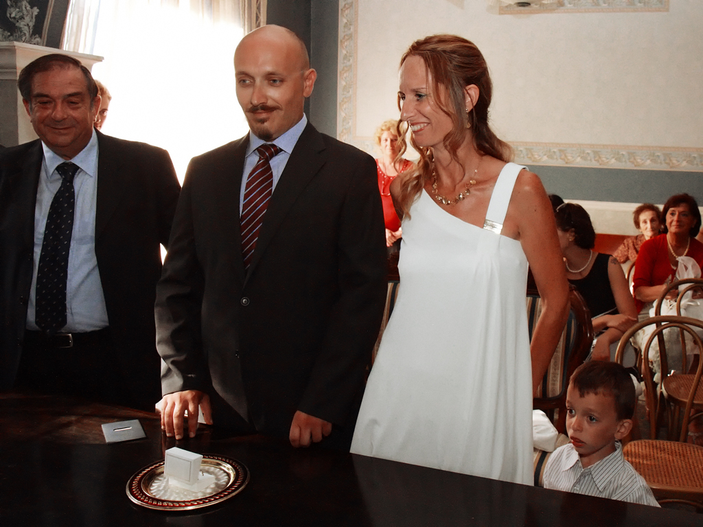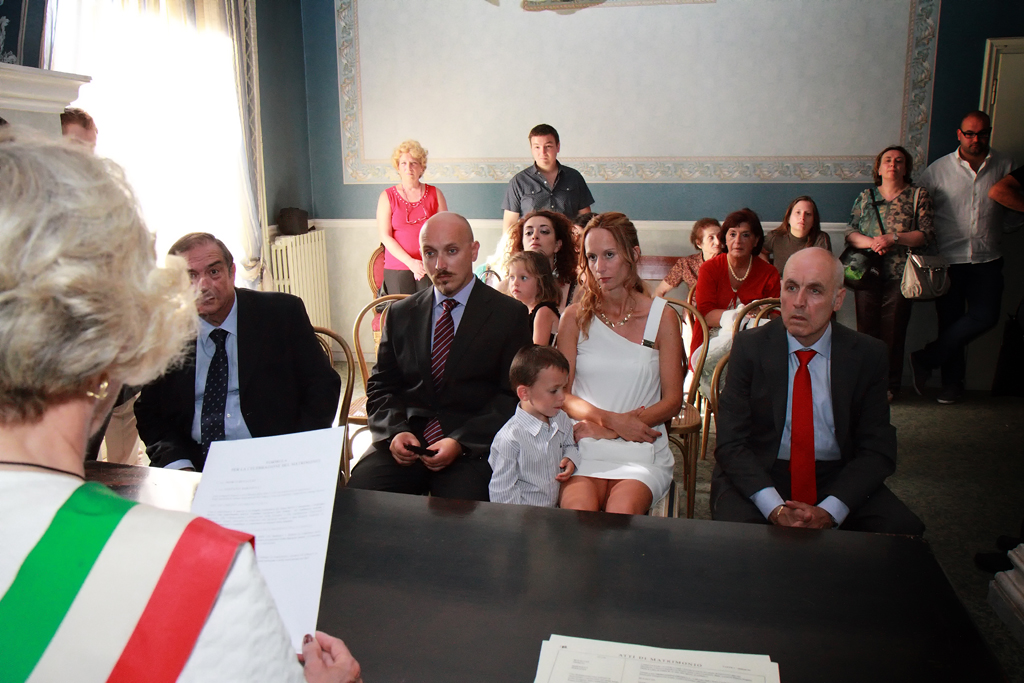 Proprio qualche minuto prima dell'orario prefissato, ecco che sono arrivati gli sposi con i loro due bambini. Qualche saluto veloce con i parenti e subito sono entrati nella sala Comunale per iniziare la celebrazione. Il Messo Comunale ha letto gli articoli e la documentazione matrimoniale, il papà dello sposo ha consegnato gli anelli agli sposi e successivamente ci sono state le firme sui documenti ufficiali per attestare l'ufficialità del matrimonio.