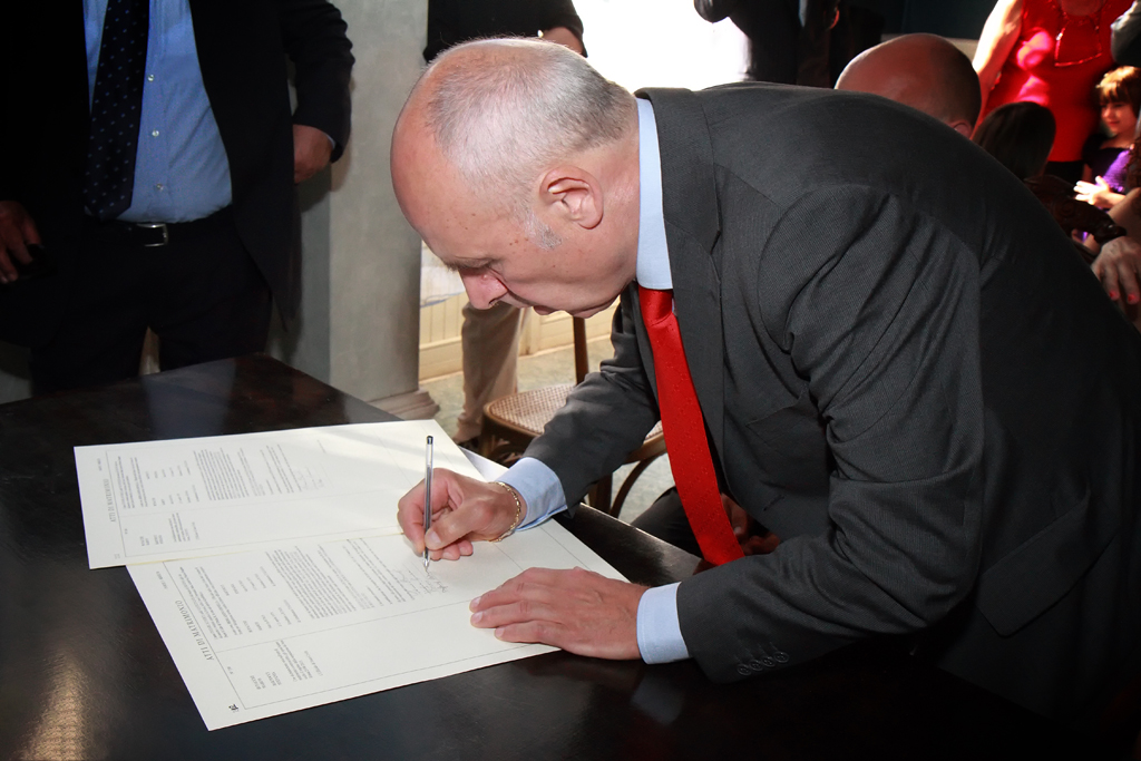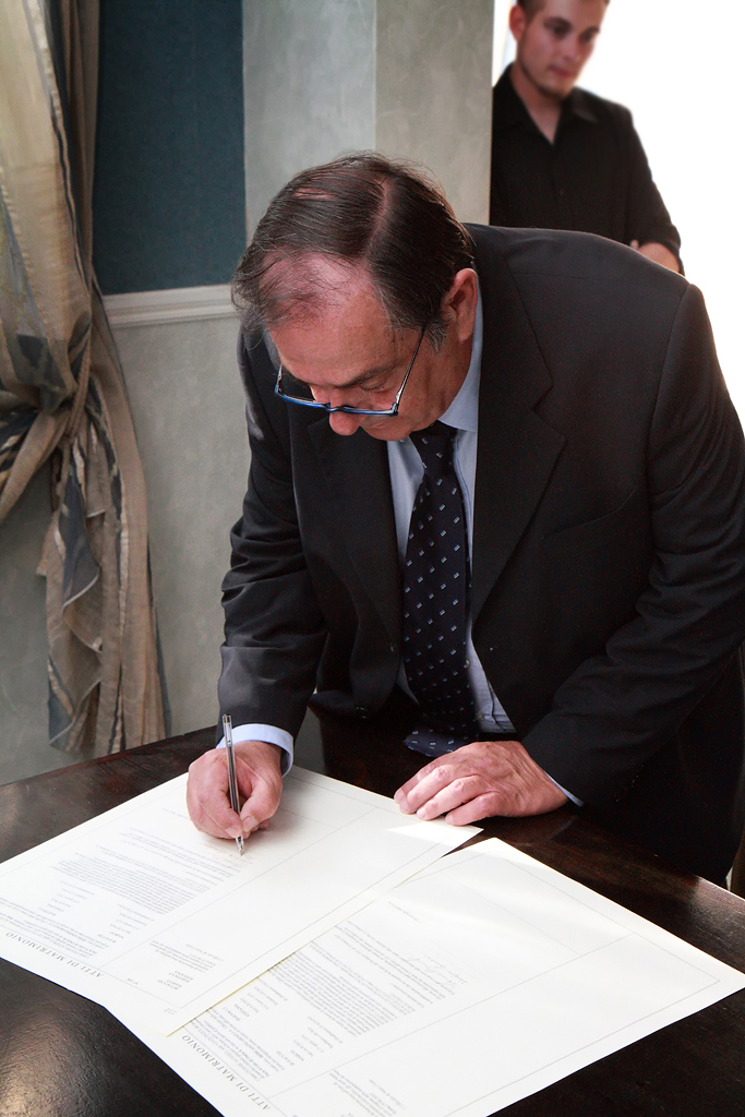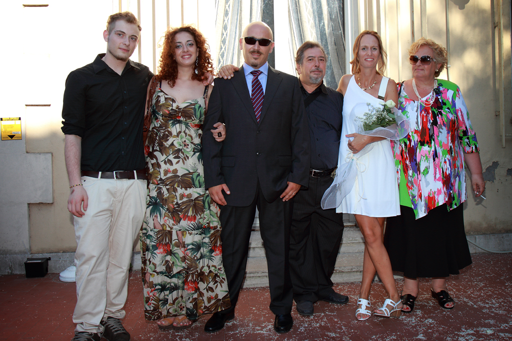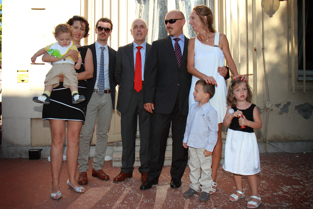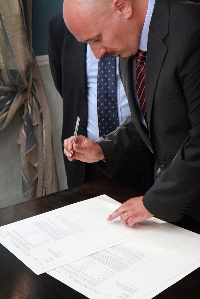 Proprio qualche minuto prima dell'orario prefissato, ecco che sono arrivati gli sposi con i loro due bambini. Qualche saluto veloce con i parenti e subito sono entrati nella sala Comunale per iniziare la celebrazione. Il Messo Comunale ha letto gli articoli e la documentazione matrimoniale, il papà dello sposo ha consegnato gli anelli agli sposi e successivamente ci sono state le firme sui documenti ufficiali per attestare l'ufficialità del matrimonio.