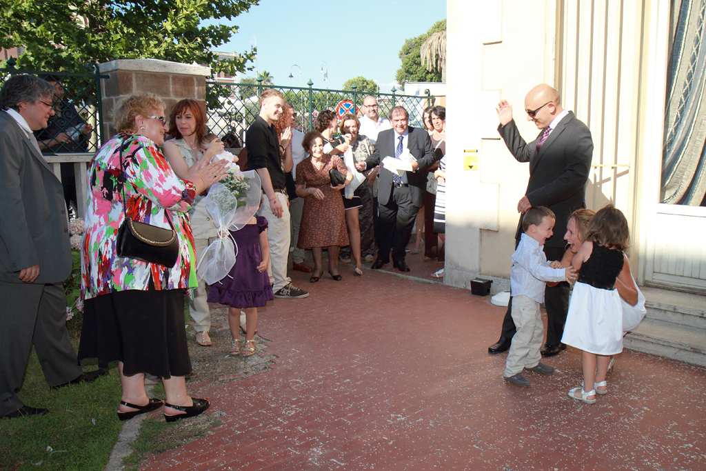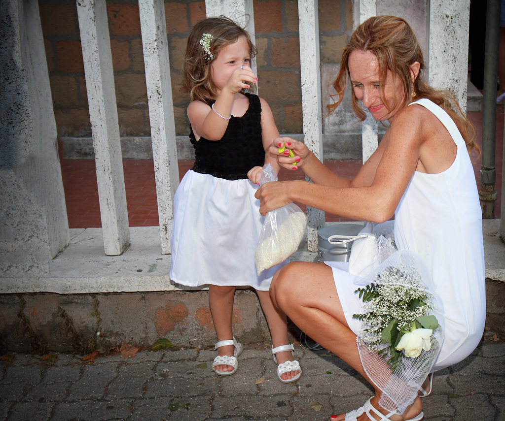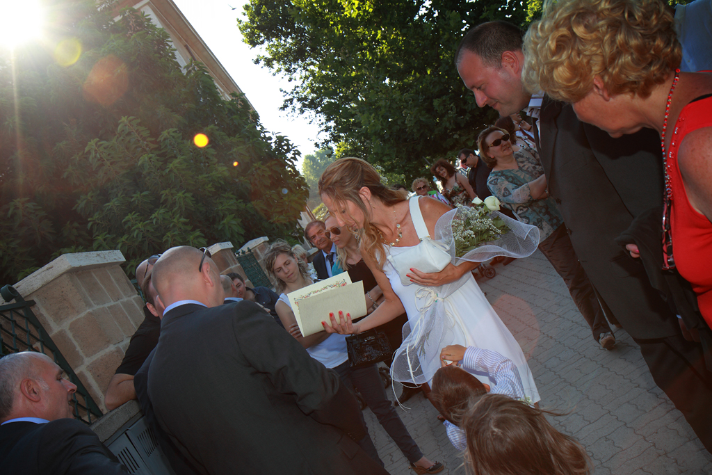 All'uscita c'è stato il rituale lancio di riso agli sposi, anche con un po' troppa irruenza da parte di qualche invitato, così che il cortile si è riempito ben presto di una coltre bianca.
