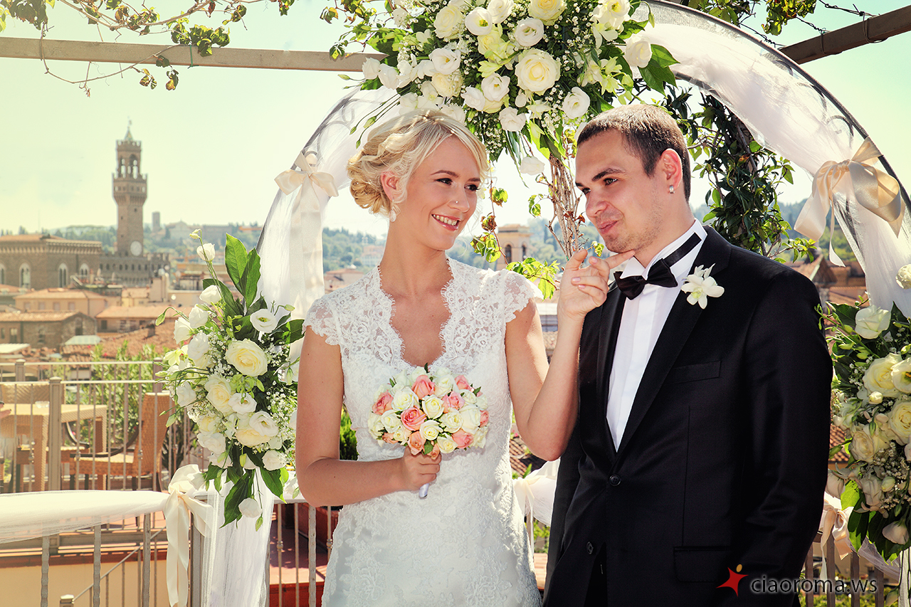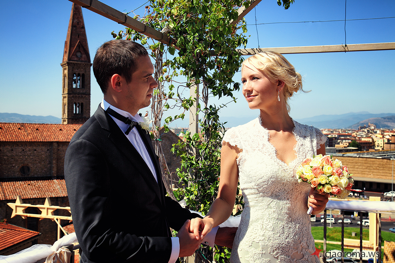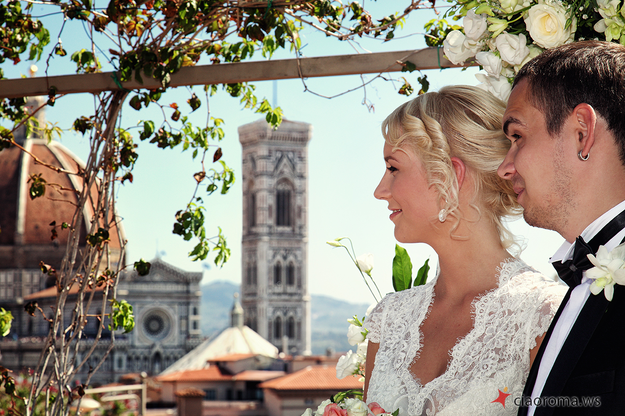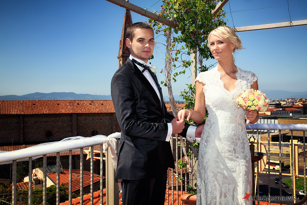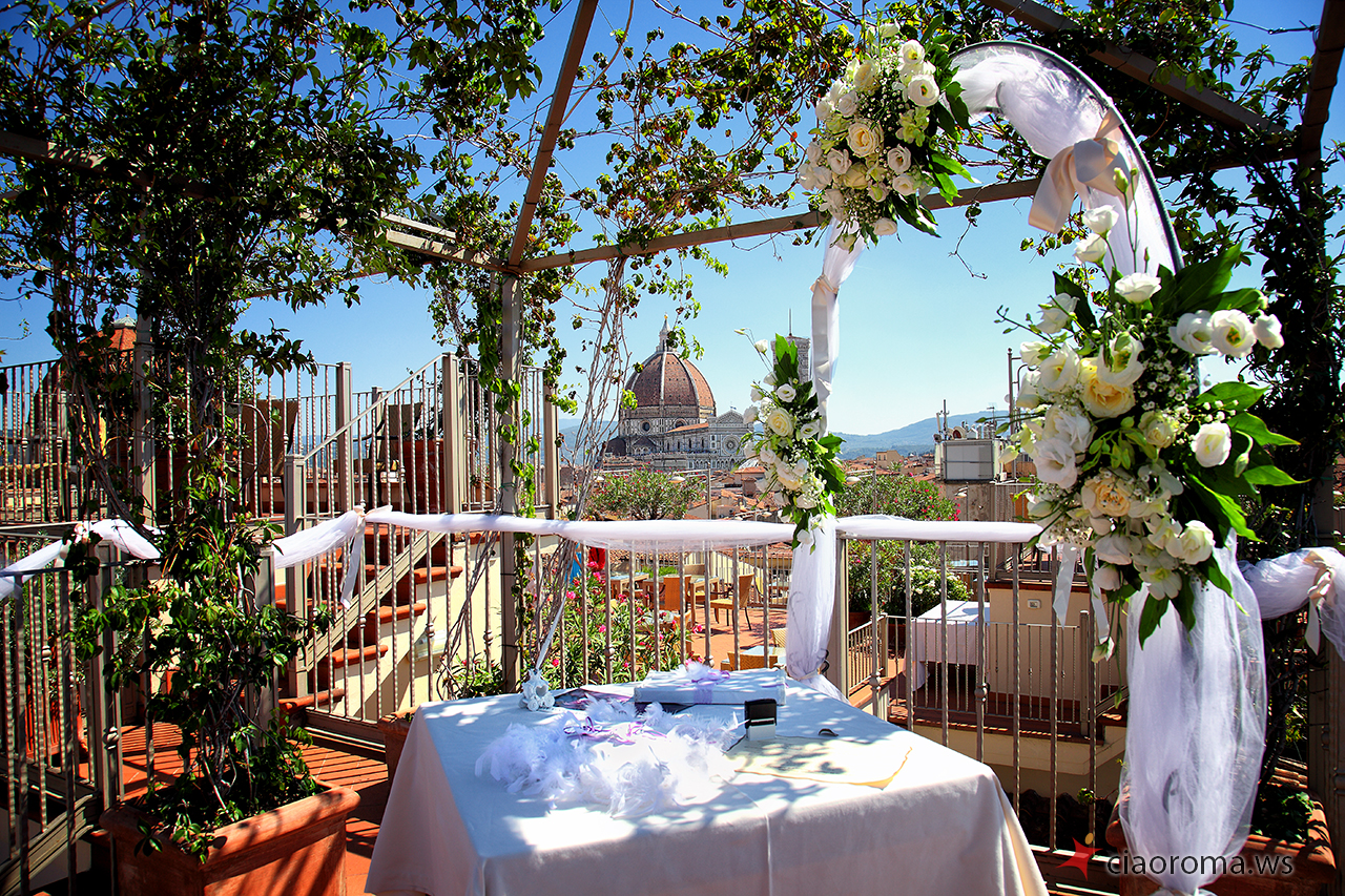 Arrivato a Firenze di mattina presto, nella zona centrale vicino alla Stazione Santa Maria Novella, sono andato a visionare il luogo della cerimonia, le terrazze dell'Hotel Baglioni. Sul posto c'erano già la Wedding Planner, il fiorista con la sua squadra di aiutanti ed il maître di sala che prendeva le indicazioni per il pranzo nuziale. Il panorama era stupendo, si potevano osservare tutti i principali monumenti di Firenze come il Duomo ed il Campanile di Giotto, il Ponte Vecchio, la Chiesa Protestante Episcopale Americana, Palazzo Pitti.
