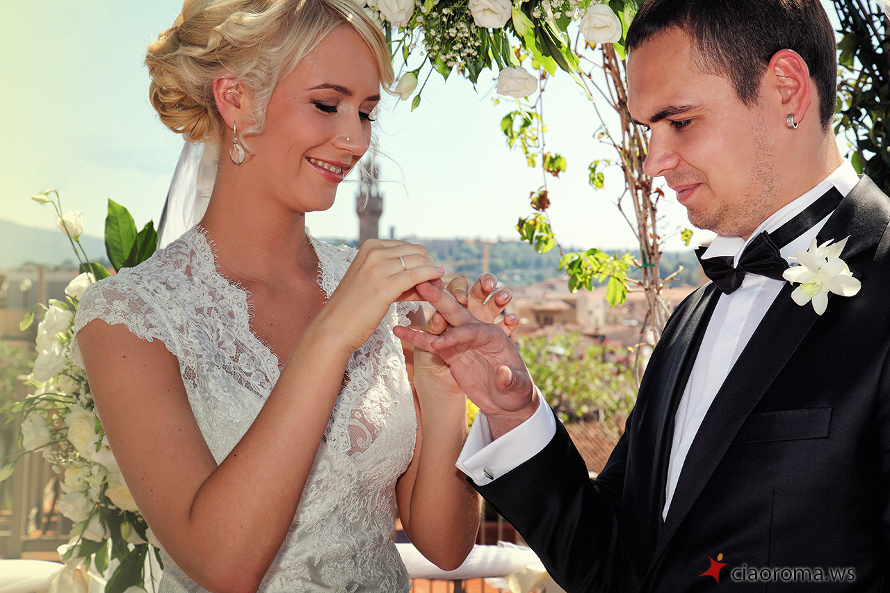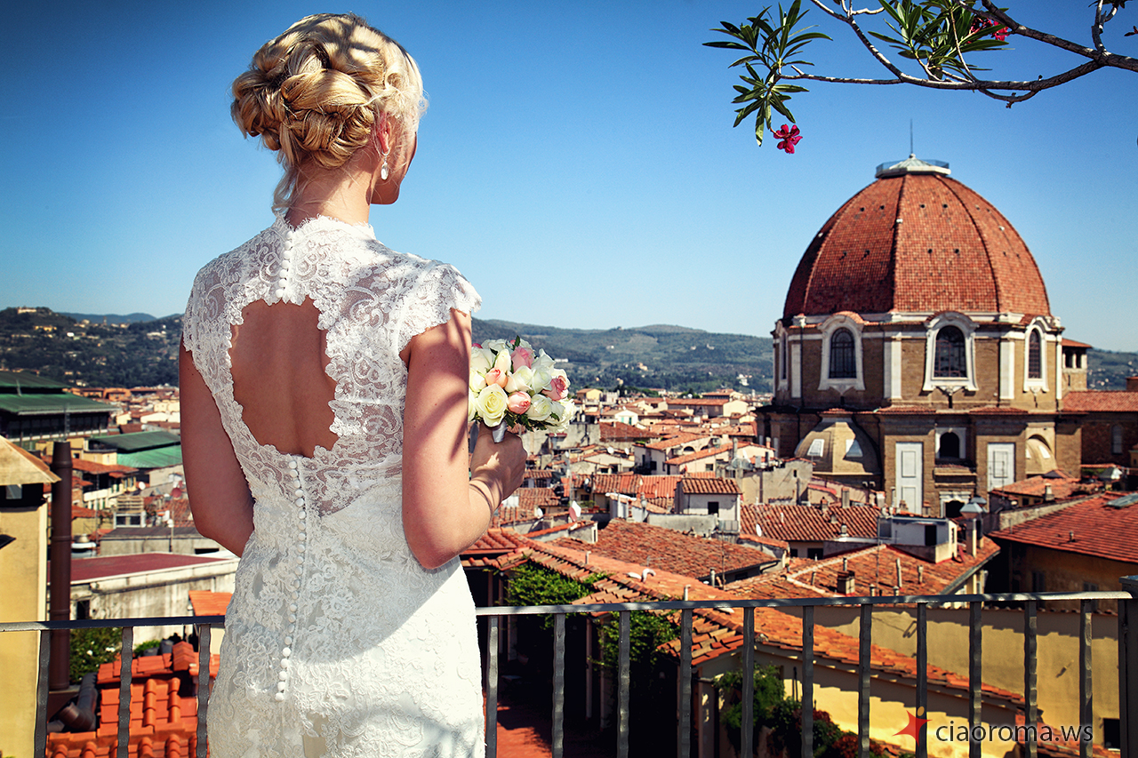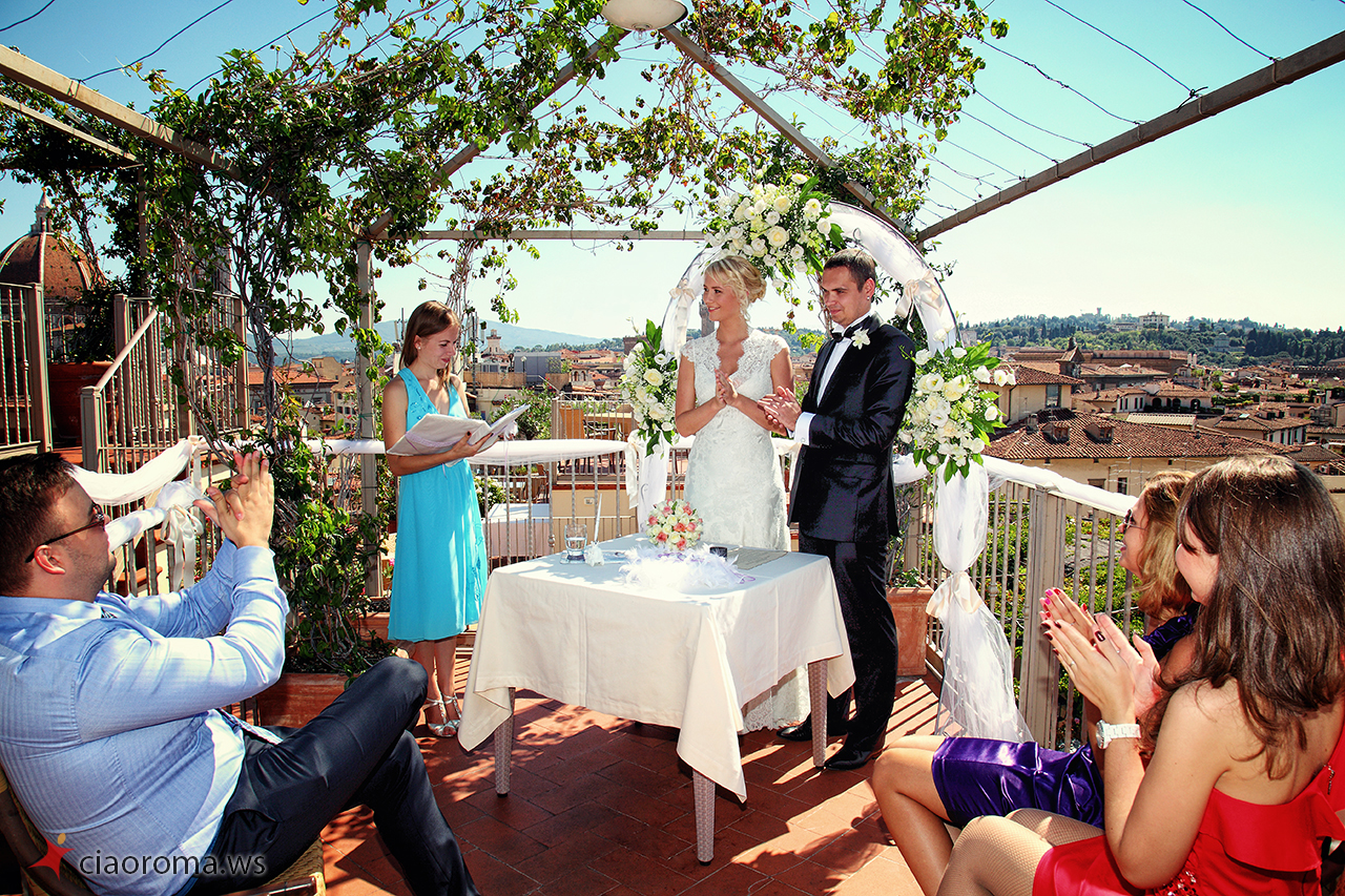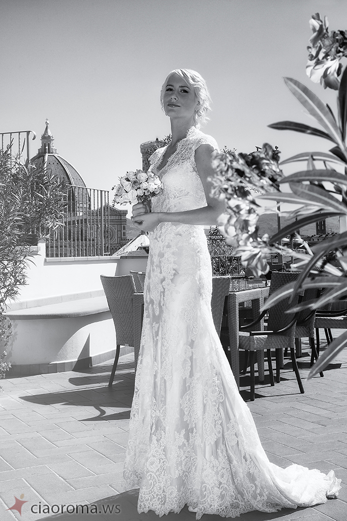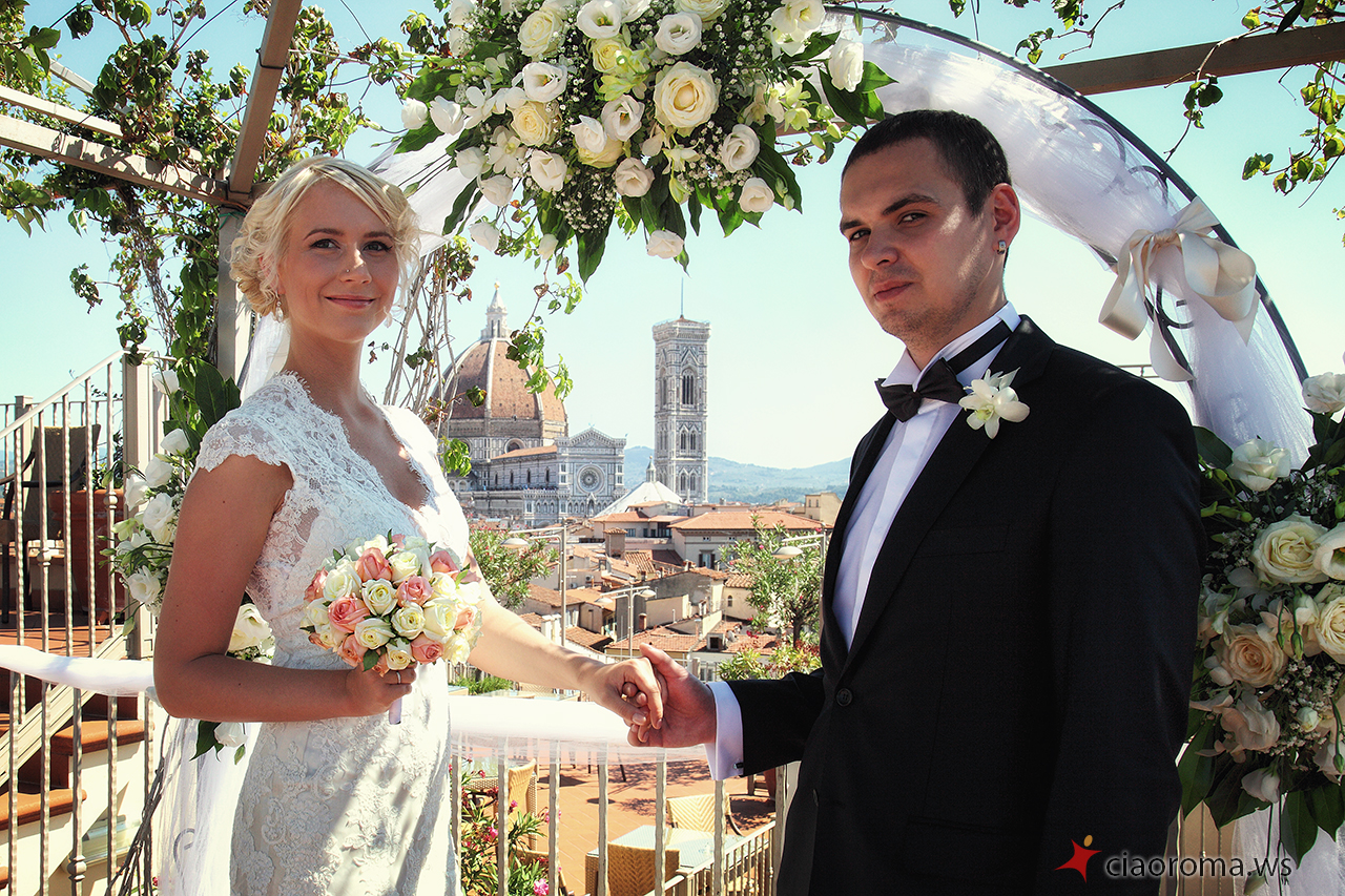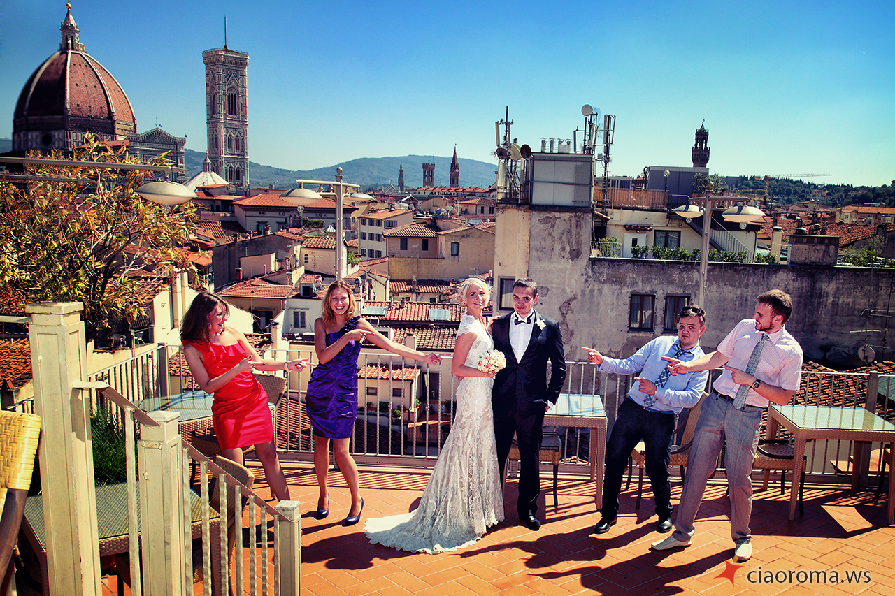 Arrivato a Firenze di mattina presto, nella zona centrale vicino alla Stazione Santa Maria Novella, sono andato a visionare il luogo della cerimonia, le terrazze dell'Hotel Baglioni. Sul posto c'erano già la Wedding Planner, il fiorista con la sua squadra di aiutanti ed il maître di sala che prendeva le indicazioni per il pranzo nuziale. Il panorama era stupendo, si potevano osservare tutti i principali monumenti di Firenze come il Duomo ed il Campanile di Giotto, il Ponte Vecchio, la Chiesa Protestante Episcopale Americana, Palazzo Pitti.
