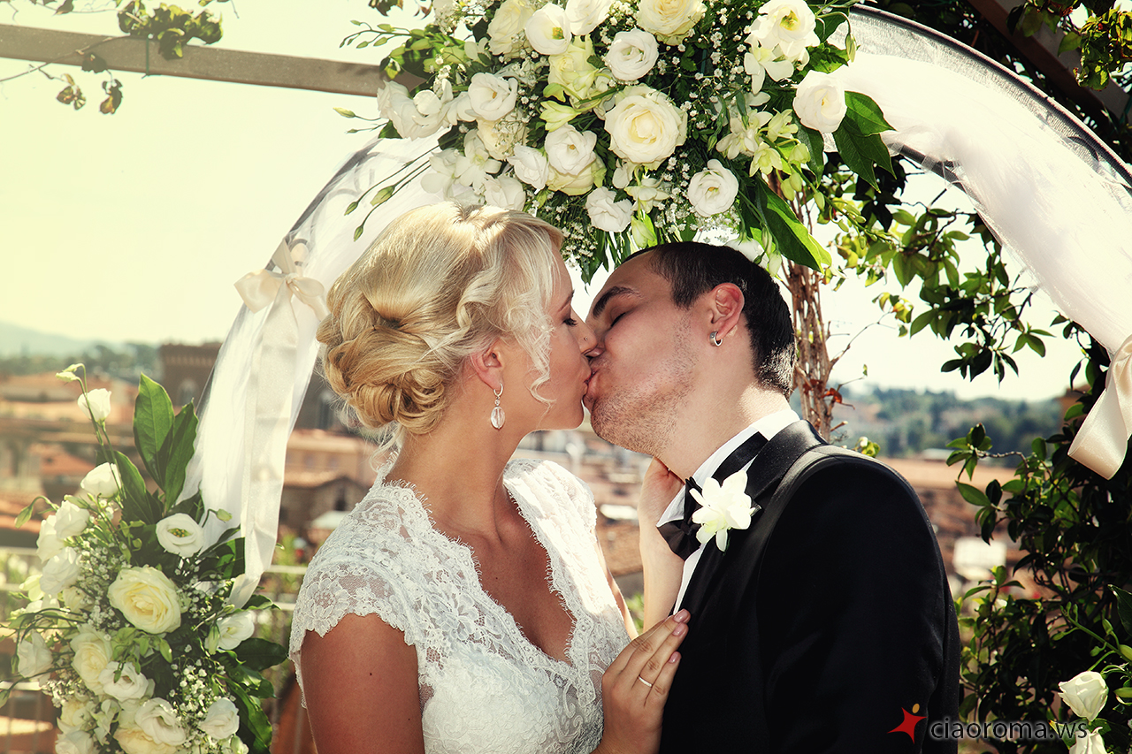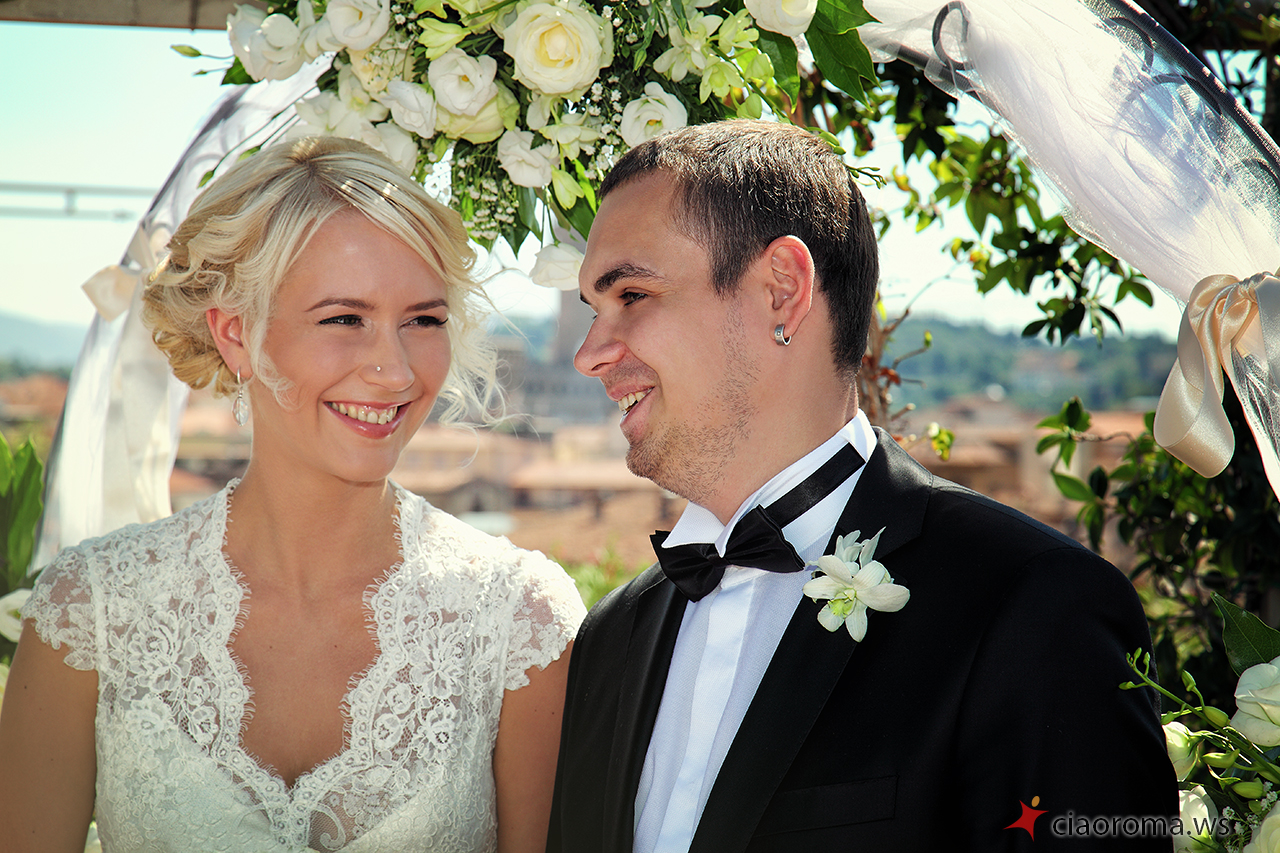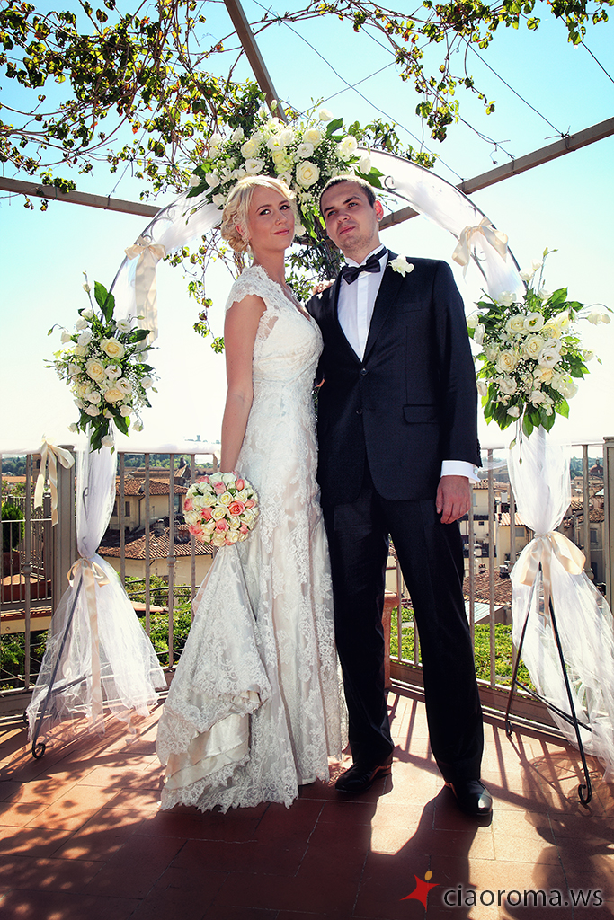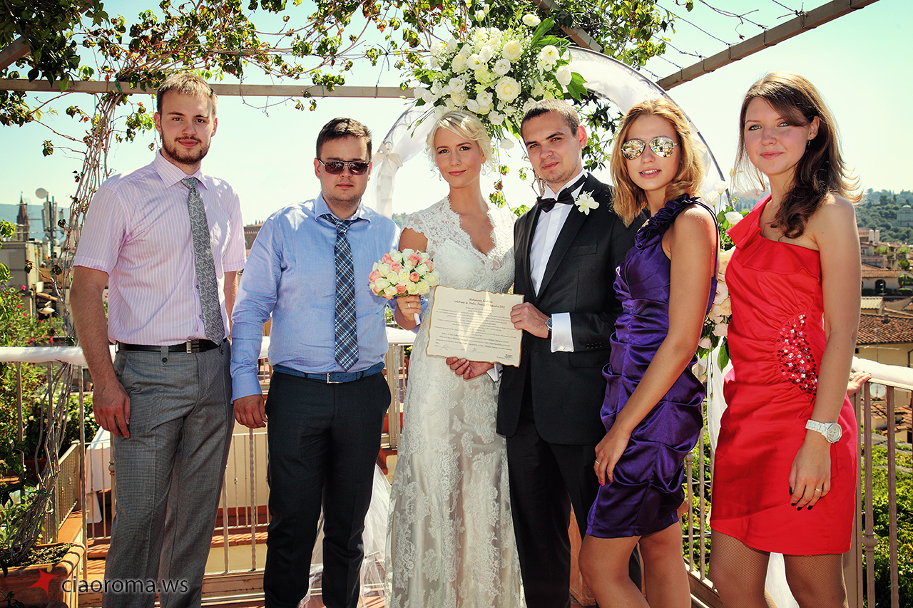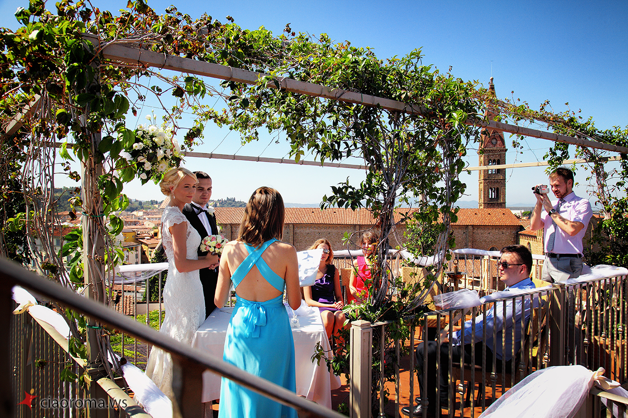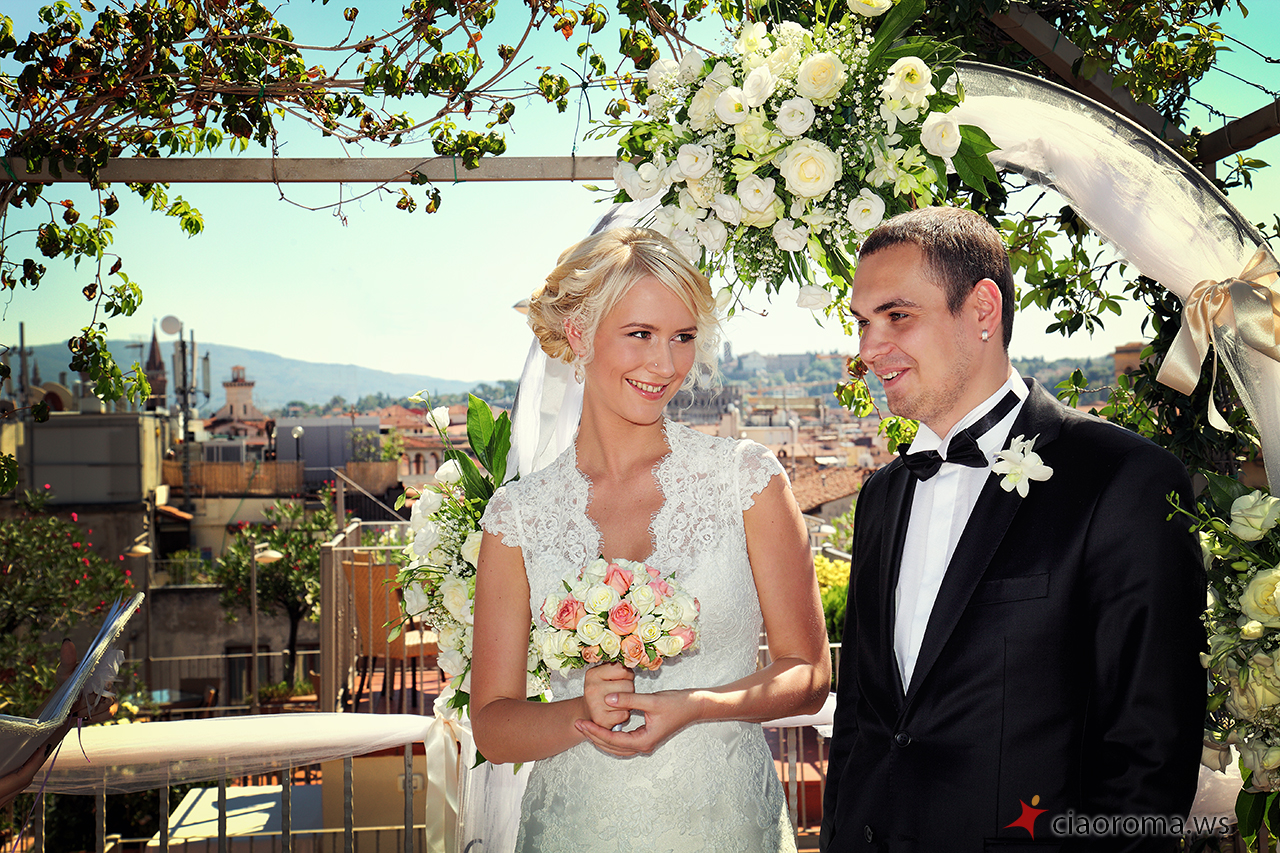 Arrivato a Firenze di mattina presto, nella zona centrale vicino alla Stazione Santa Maria Novella, sono andato a visionare il luogo della cerimonia, le terrazze dell'Hotel Baglioni. Sul posto c'erano già la Wedding Planner, il fiorista con la sua squadra di aiutanti ed il maître di sala che prendeva le indicazioni per il pranzo nuziale. Il panorama era stupendo, si potevano osservare tutti i principali monumenti di Firenze come il Duomo ed il Campanile di Giotto, il Ponte Vecchio, la Chiesa Protestante Episcopale Americana, Palazzo Pitti.