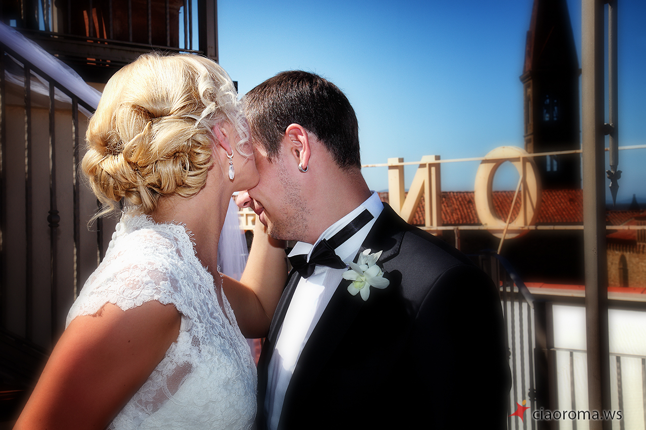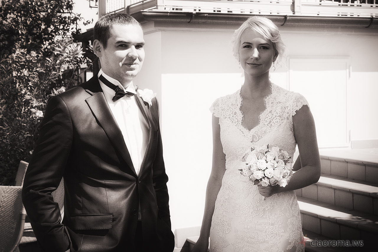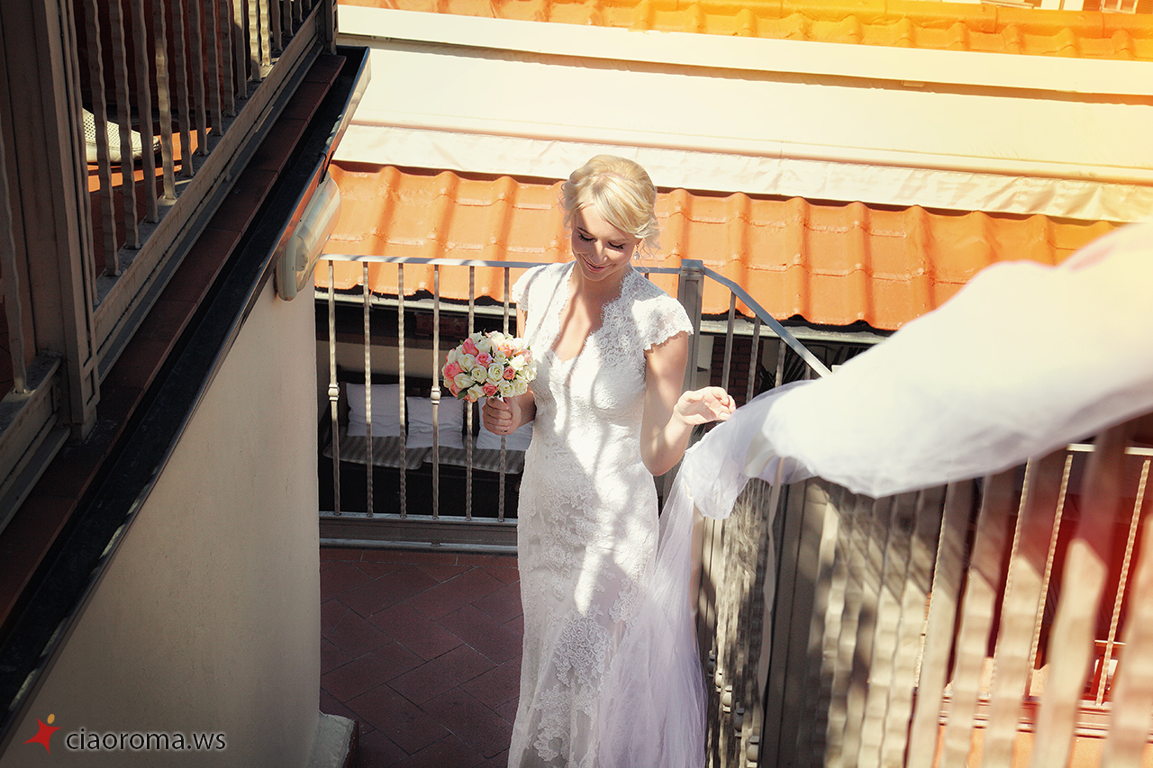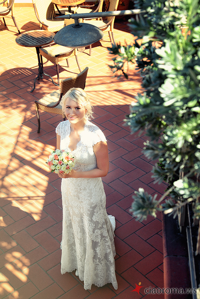 Gli sposi erano ancora nelle loro stanze in Hotel. La sposa era con la truccatrice che stava ultimando gli ultimi ritocchi e lo sposo era già pronto per l'uscita. Ho chiesto loro se volessero le foto durante la preparazione, ma hanno preferito avere il ricordo solo delle classiche foto durante la cerimonia e nella passeggiata successiva. Dopo poco tempo la sposa era pronta vestita del suo elegante abito Pronovias, puntuale è arrivato anche il bouquet portato dalla Wedding Planner con il fiorista. Siamo andati tutti, con gli ospiti, nella zona allestita per il matrimonio ed è iniziata la celebrazione delle nozze.