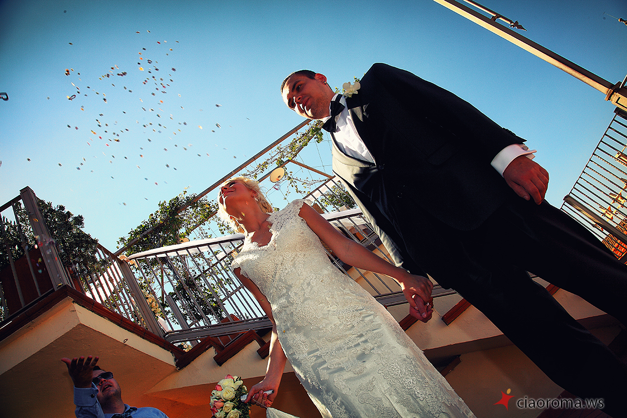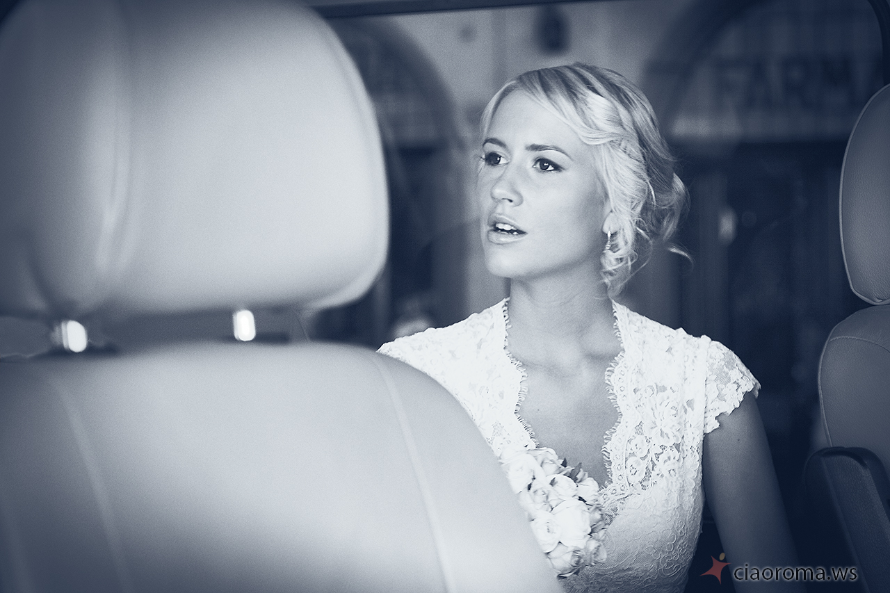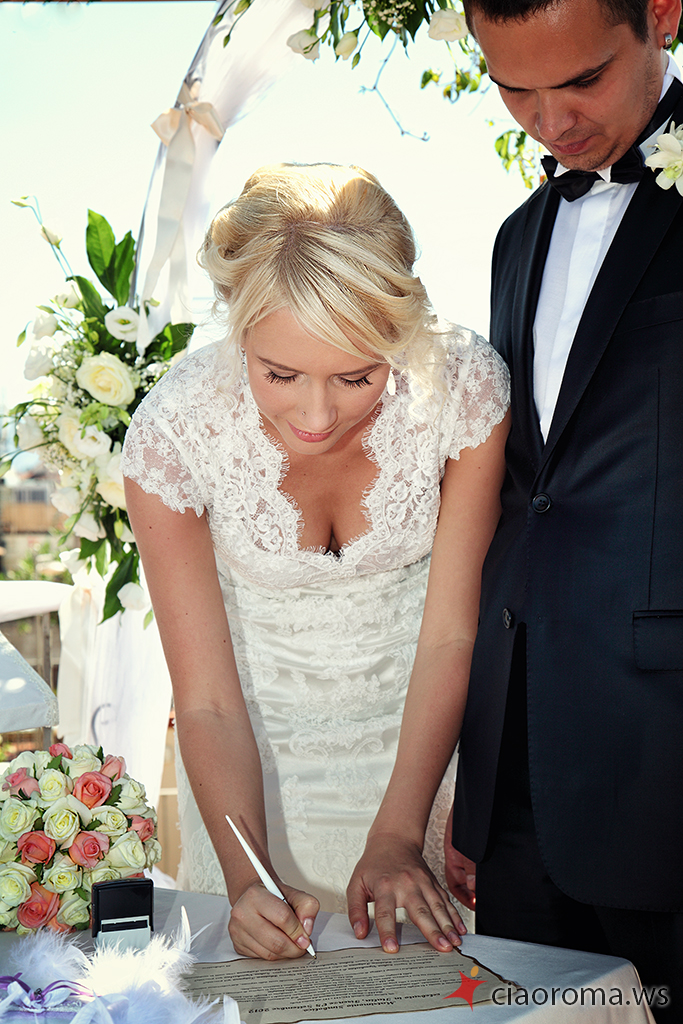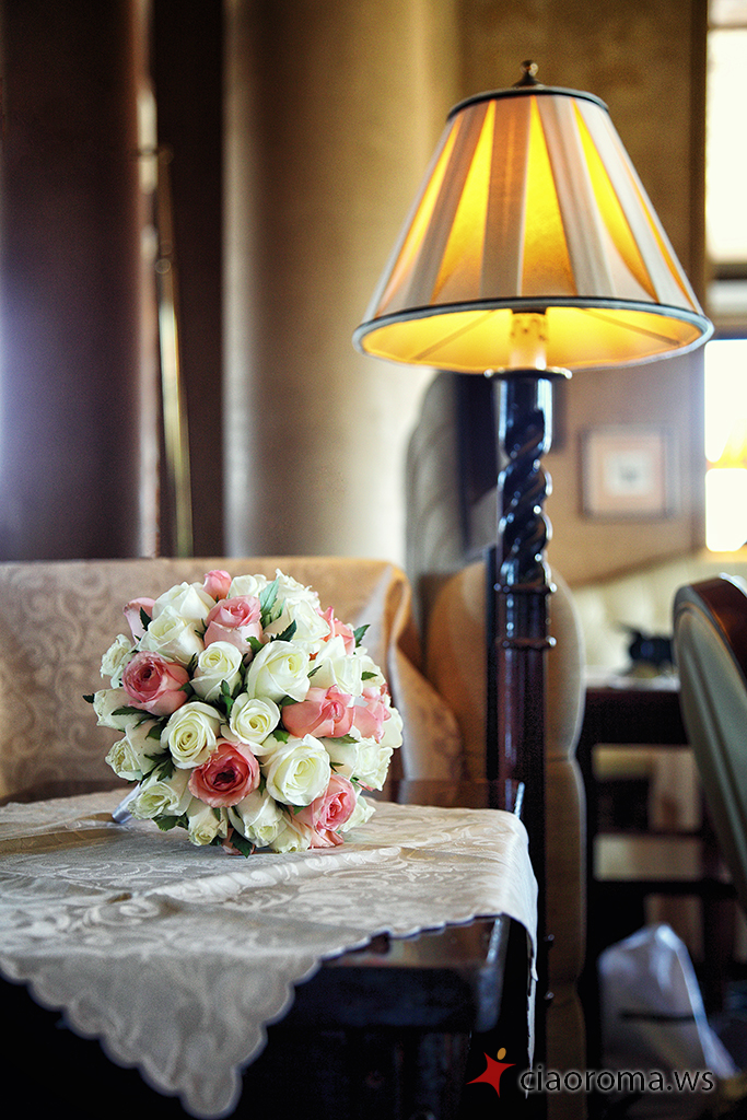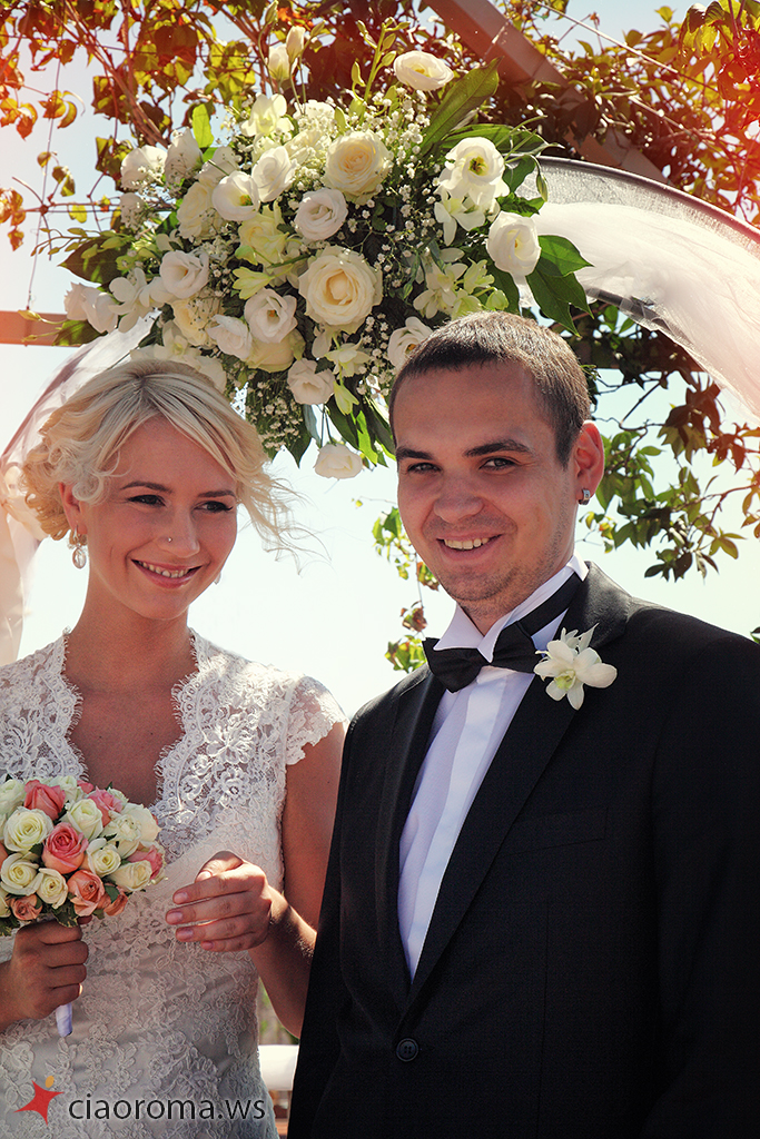 Gli sposi erano ancora nelle loro stanze in Hotel. La sposa era con la truccatrice che stava ultimando gli ultimi ritocchi e lo sposo era già pronto per l'uscita. Ho chiesto loro se volessero le foto durante la preparazione, ma hanno preferito avere il ricordo solo delle classiche foto durante la cerimonia e nella passeggiata successiva. Dopo poco tempo la sposa era pronta vestita del suo elegante abito Pronovias, puntuale è arrivato anche il bouquet portato dalla Wedding Planner con il fiorista. Siamo andati tutti, con gli ospiti, nella zona allestita per il matrimonio ed è iniziata la celebrazione delle nozze.