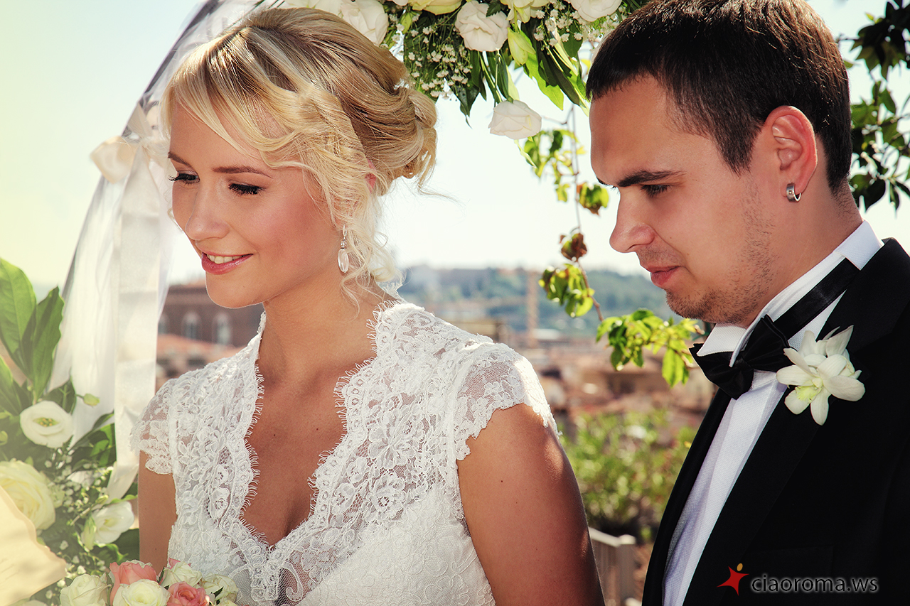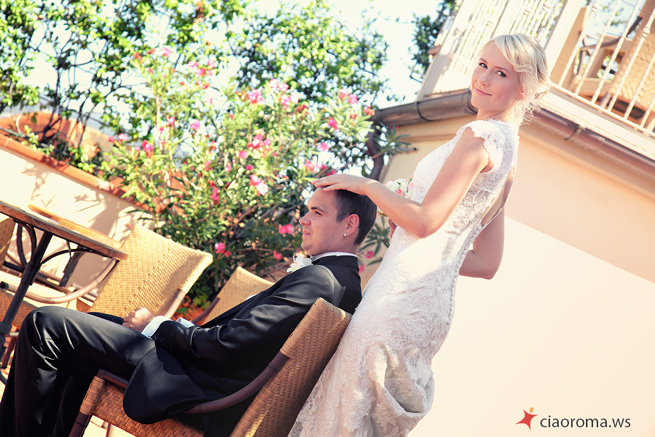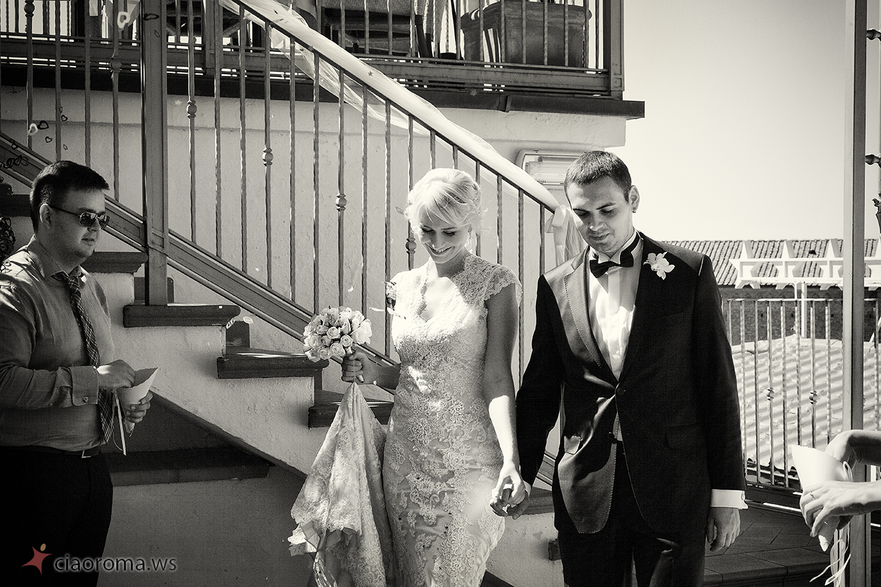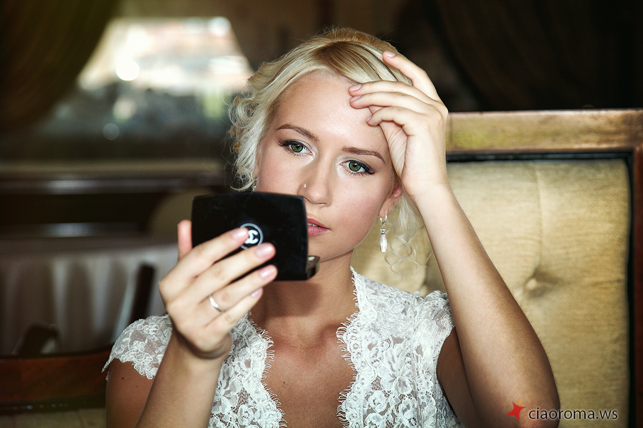 Gli sposi erano ancora nelle loro stanze in Hotel. La sposa era con la truccatrice che stava ultimando gli ultimi ritocchi e lo sposo era già pronto per l'uscita. Ho chiesto loro se volessero le foto durante la preparazione, ma hanno preferito avere il ricordo solo delle classiche foto durante la cerimonia e nella passeggiata successiva. Dopo poco tempo la sposa era pronta vestita del suo elegante abito Pronovias, puntuale è arrivato anche il bouquet portato dalla Wedding Planner con il fiorista. Siamo andati tutti, con gli ospiti, nella zona allestita per il matrimonio ed è iniziata la celebrazione delle nozze.