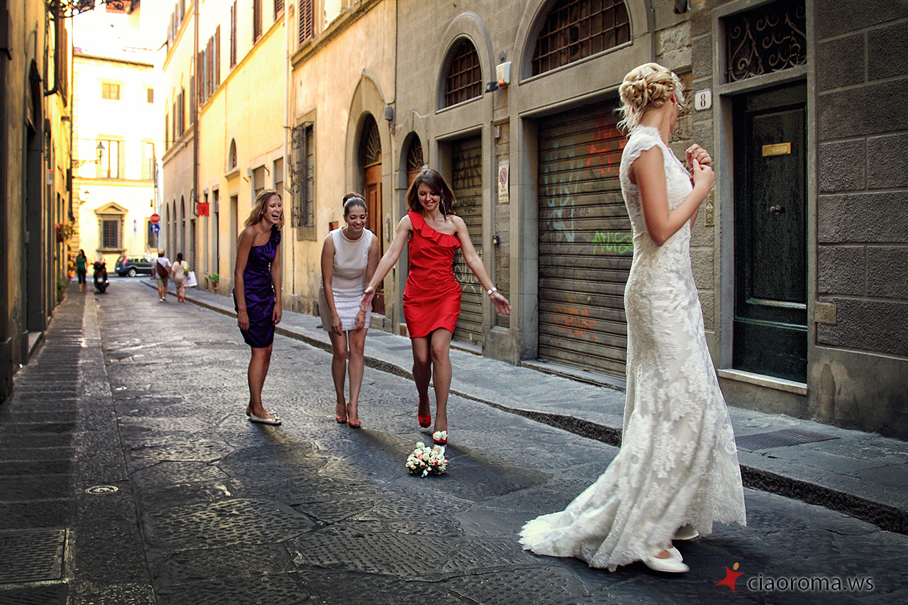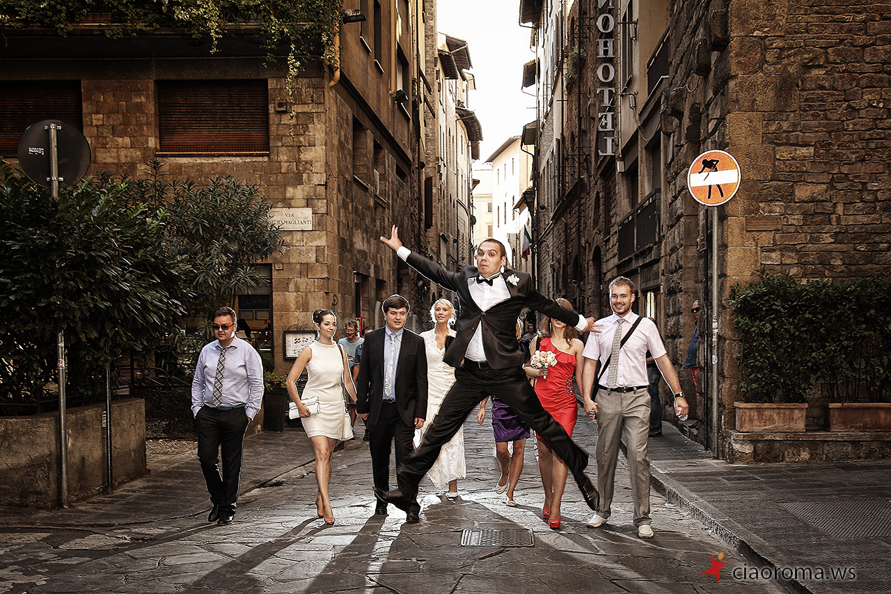 Avere due bellissimi sposi ed un panorama come quello di Firenze è stato molto intenso dal punto di vista fotografico, avere uno sfondo così particolare ha arricchito ogni singola foto e son sicuro che anche a voi arriveranno le splendide emozioni che esse trasmettono. Subito dopo la cerimonia, ho fatto degli scatti con gli sposi e lo stupendo panorama, alternando qualche foto con gli amici e le amiche. Ci siamo poi trasferiti al ristorante dov'era già pronto un buffet per il pranzo. Molto belle le bomboniere, un ricordo del vino Toscano con i classici confetti nel sacchetto. Dopo il pranzo siamo usciti per le vie della città, iniziando da Ponte Vecchio e ricercando, come al mio modo di scattare, scorci particolari ed unici che potessero far ricordare agli sposi, negli anni a venire, questo stupendo giorno a Firenze.