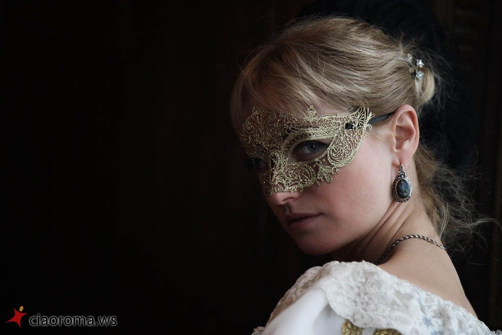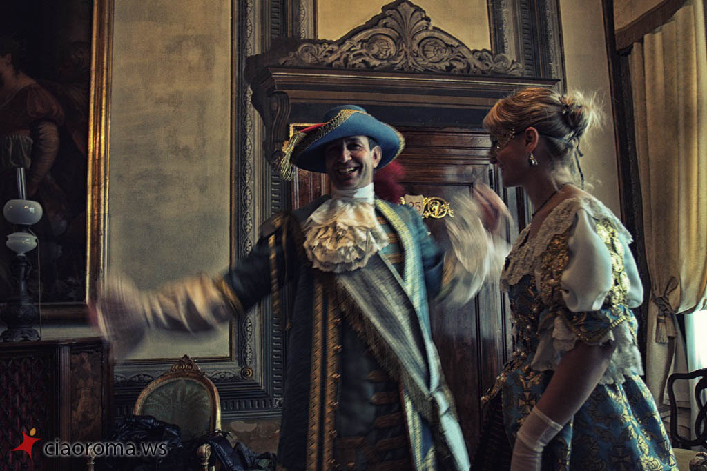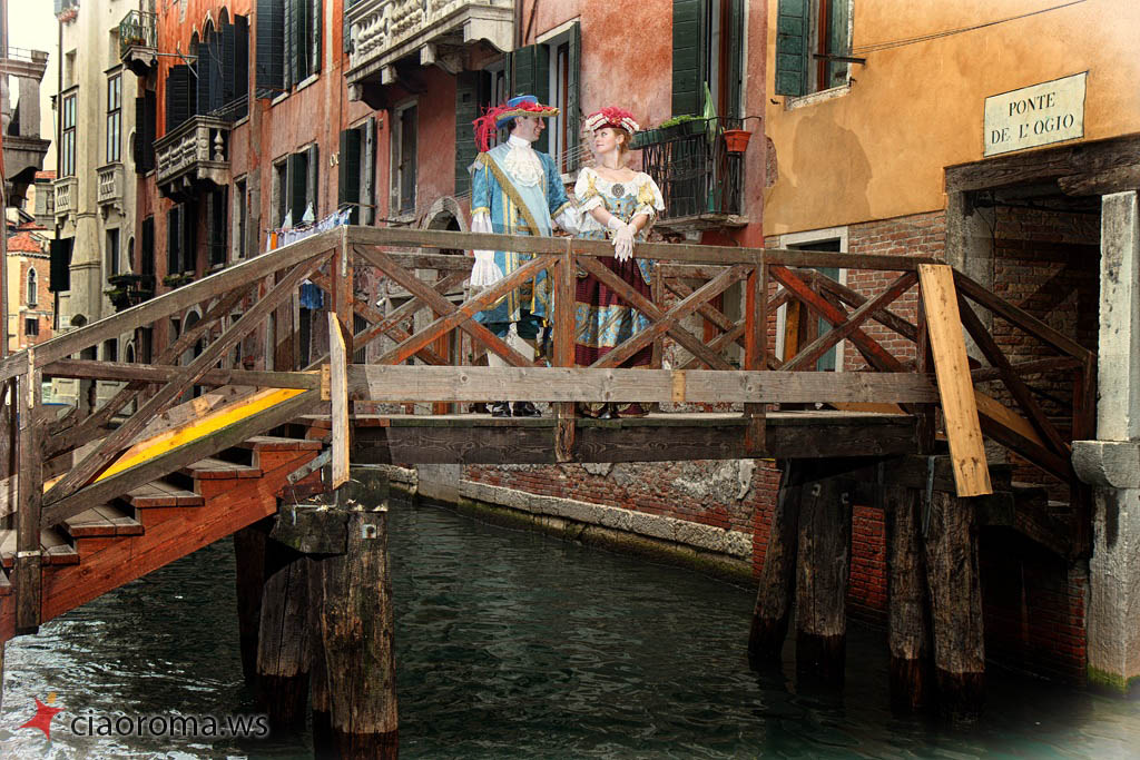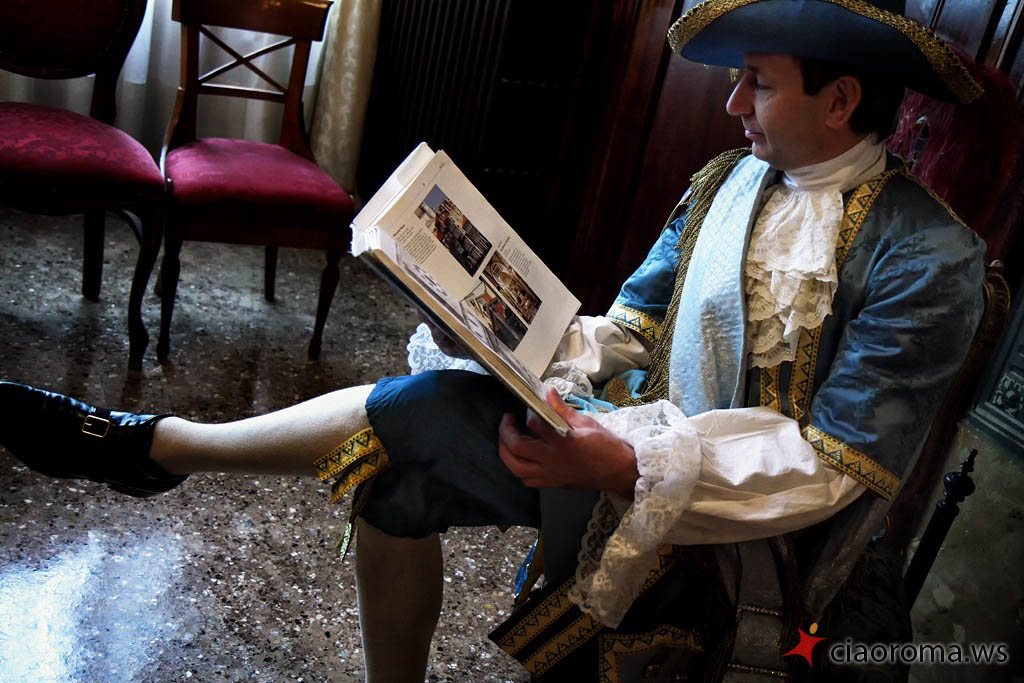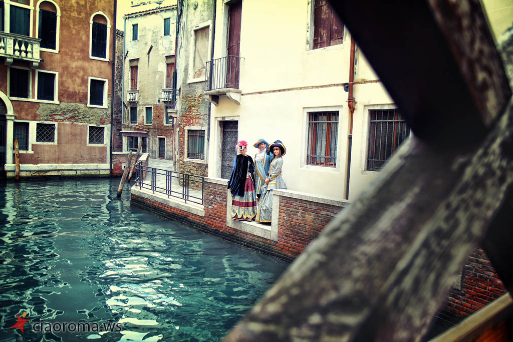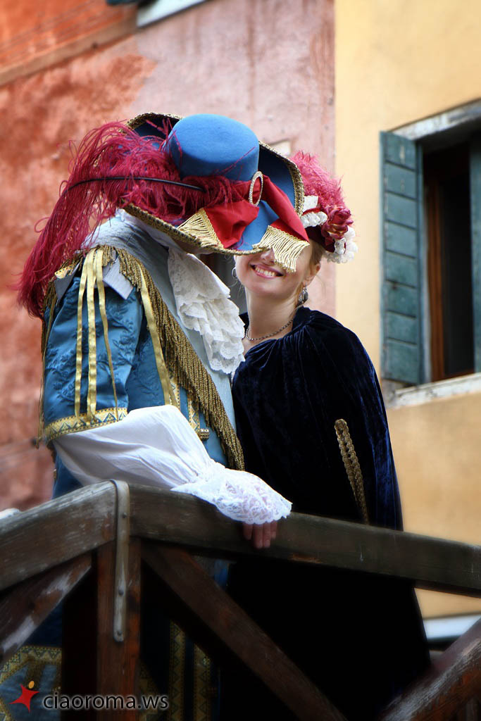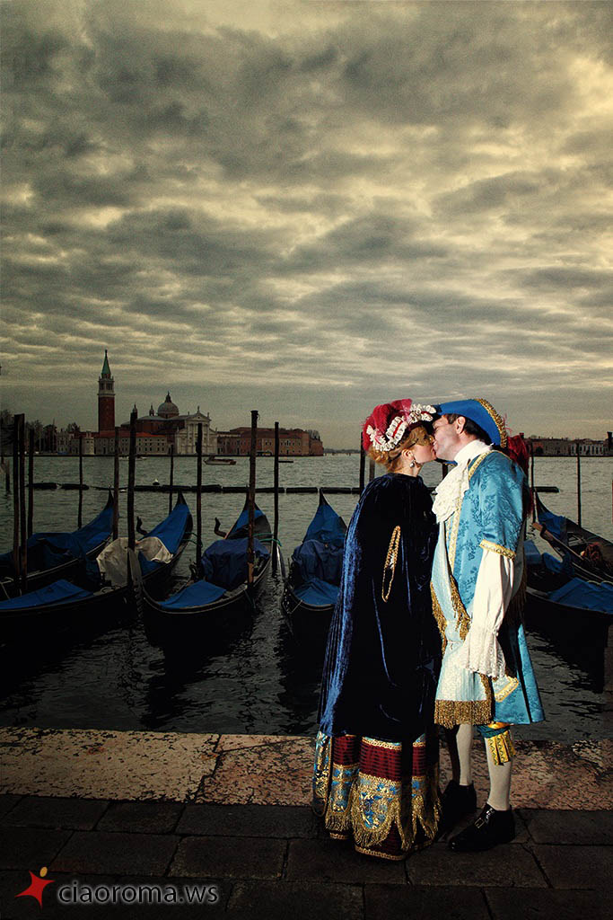 Vika ed io siamo arrivati a Venezia molto presto per studiare bene i percorsi fotografici dove condurre successivamente gli sposi per realizzare le loro foto. All'alba eravamo già in stazione ed abbiamo potuto osservare il sorgere del sole sulla laguna, un'immagine che rimane ancora oggi impressa nella mia mente e nel mio cuore. Dopo un'abbondante colazione, siamo andati all'hotel degli sposi, loro erano ancora in abbigliamento comune. Ottemperate le prime disposizioni sulla time line della giornata, gli sposi hanno iniziato le vestizioni in abiti d'epoca. Con loro c'era anche la figlia di lui che ha voluto partecipare a questa giornata di festa. Abbiamo iniziato il nostro giro fotografico come da programma, catturando emozioni e luoghi che potessero lasciare un bel ricordo, il piccolo porto con le Gondole, i canali ed i piccoli ponticelli che uniscono i vari isolati, le maschere esposte nei negozi. Arrivati al Palazzo Abadessa, ci siamo concessi un po' di relax nello splendido giardino caratterizzato da scorci particolari e adornato da alcune forme d'arte raffiguranti manichini dalle strane forme. Qualche scatto romantico prima di proseguire all'interno del palazzo ed iniziare la cerimonia. All'interno della sala ci attendeva già il violinista e Vika che sia era nel frattempo cambiata per prepararsi a celebrare la cerimonia simbolica.