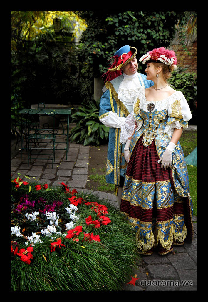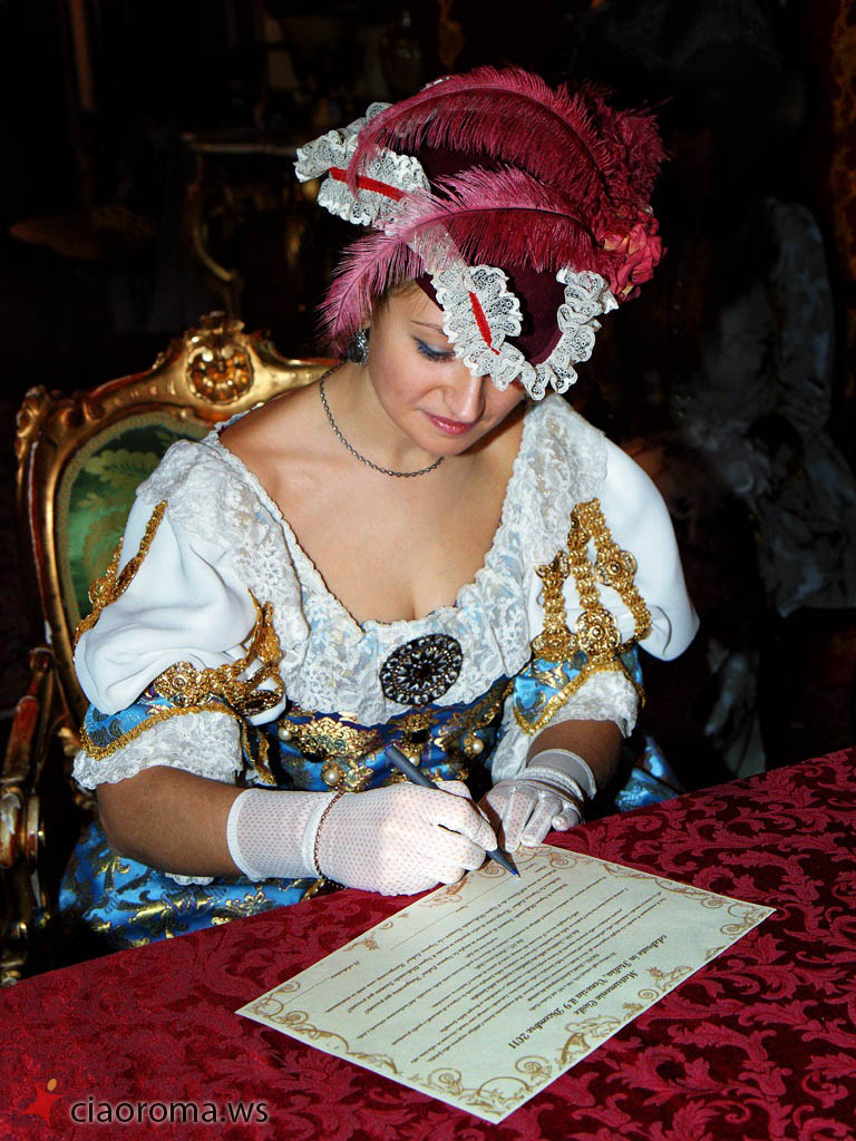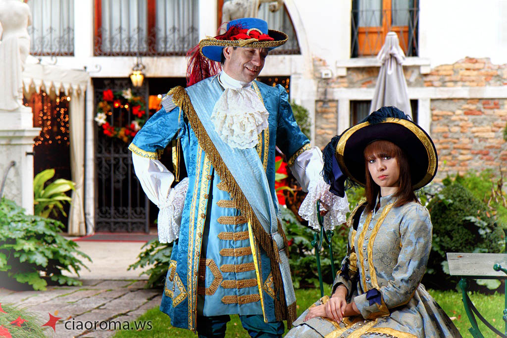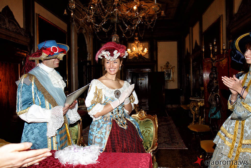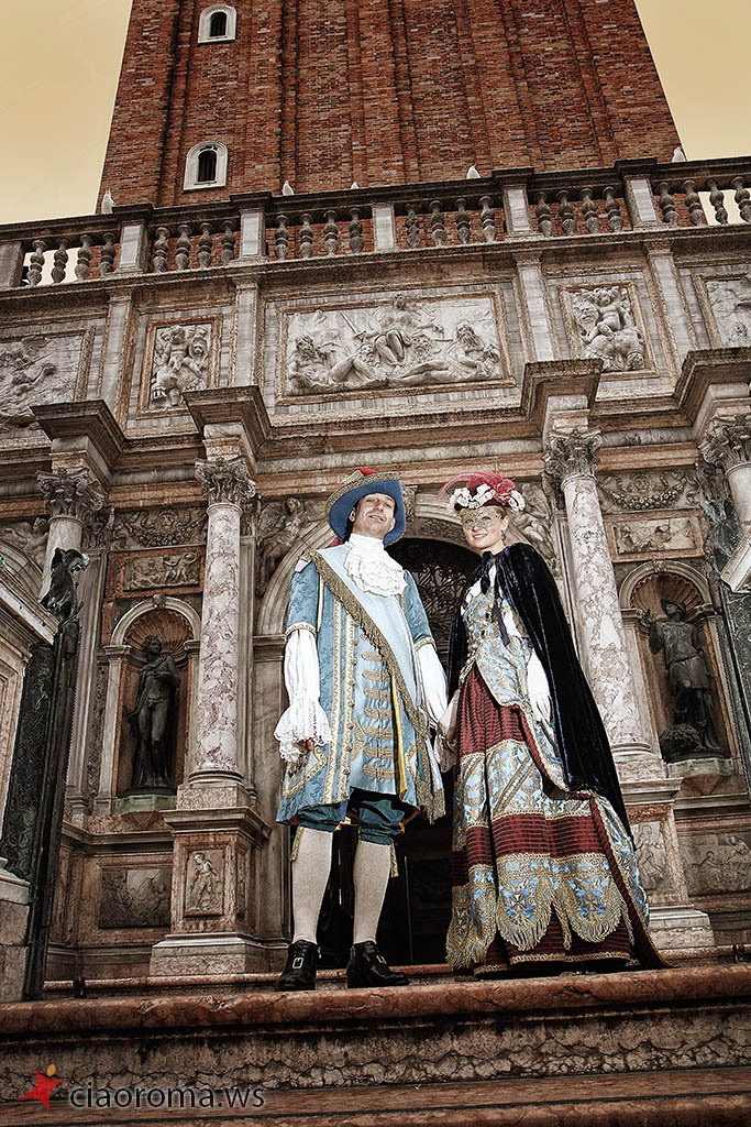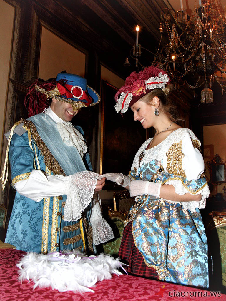 Le fasi iniziali dell'organizzazione si sono svolte nella ricerca dell'abbigliamento più adatto alle caratteristiche degli sposi e all'ambientazione del rito. Si è scelto di affidare quest'arduo compito ad uno degli atelier di costumi d'epoca più importante di Venezia, con centinaia di costumi, guanti, scarpe, cappelli, cinture, piume... che, a gusto degli sposi, riproducessero il clima del XVI secolo. Per quanto riguarda l'ambientazione è stato scelto un Hotel nella zona centrale di Venezia, il palazzo Abadessa, ammobiliato in stile rinascimentale, con decorazioni che ben facevano riportare alla mente lo stile di vita che si viveva all'epoca: tappeti e quadri antichi, vasi in porcellana, lampadari enormi. Per rendere più suggestivo il momento del matrimonio ci si è affidati all'esperienza di un violinista che ha dato vita ad un commovente sottofondo musicale, affiancato durante i festeggiamenti successivi, da altri due musicisti che attraverso i loro strumenti, il mandolino e la fisarmonica, hanno contribuito a creare un'atmosfera indimenticabile. Per finire, si è scelto di liberare le tradizionali colombe bianche e godersi il panorama dei vicoli veneziani su di una gondola. Certo non poteva mancare il banchetto nuziale! Per deliziare i palati degli sposi e dei loro invitati è stato scelto un locale suggestivo ed accogliente nei pressi di Piazza San Marco, il ristorante La Cusina, con vista sulla laguna di Venezia.