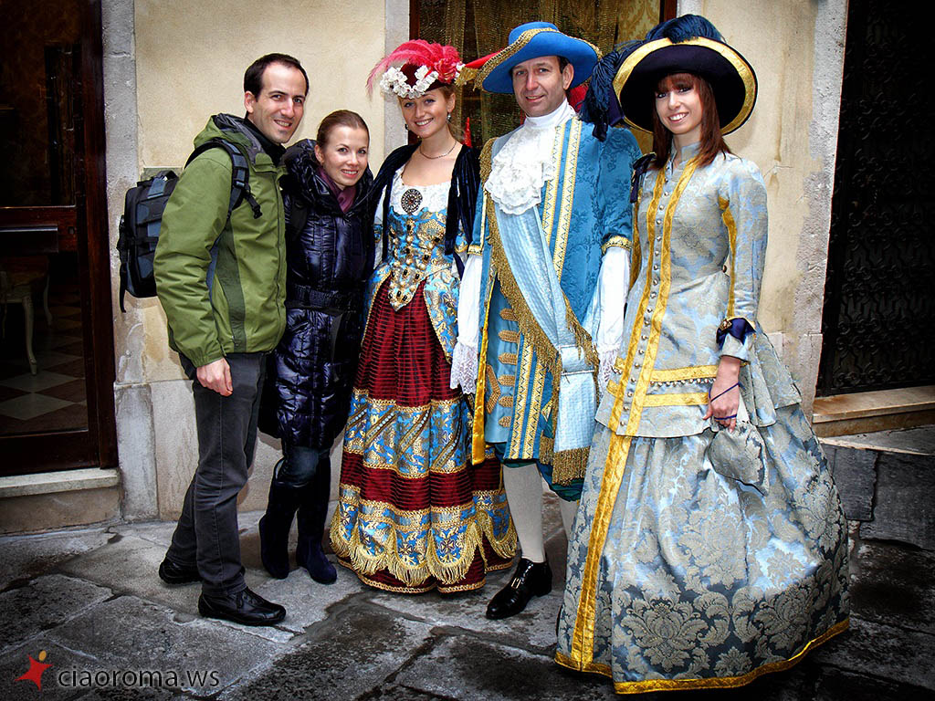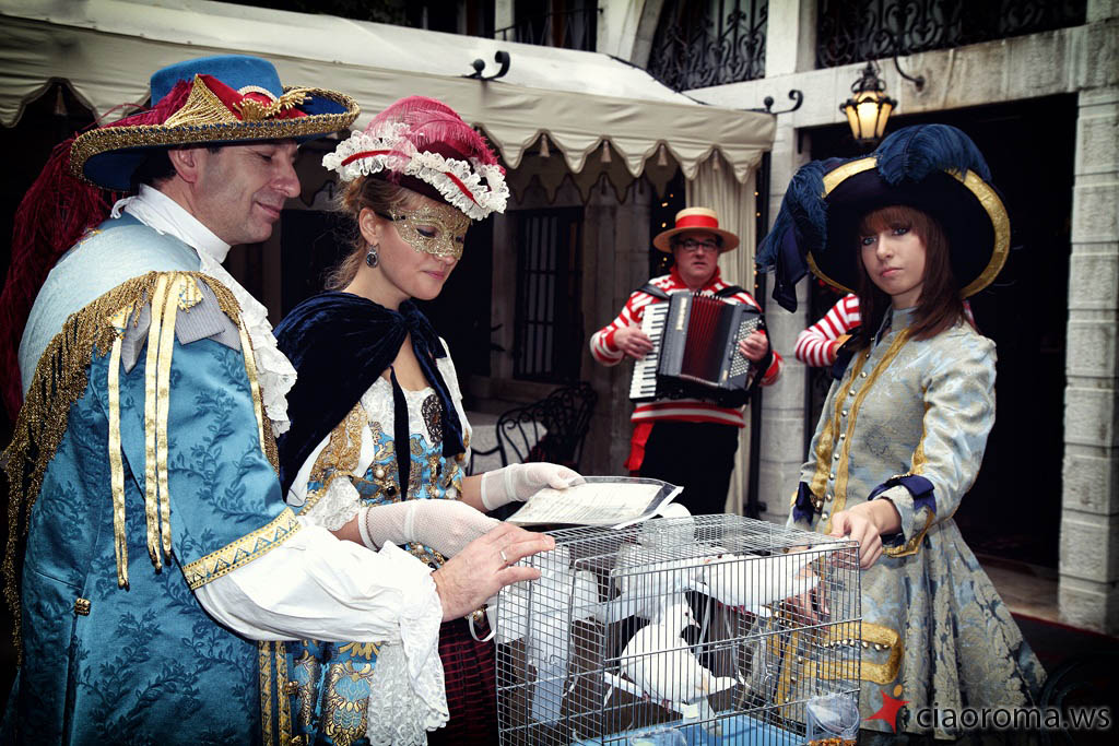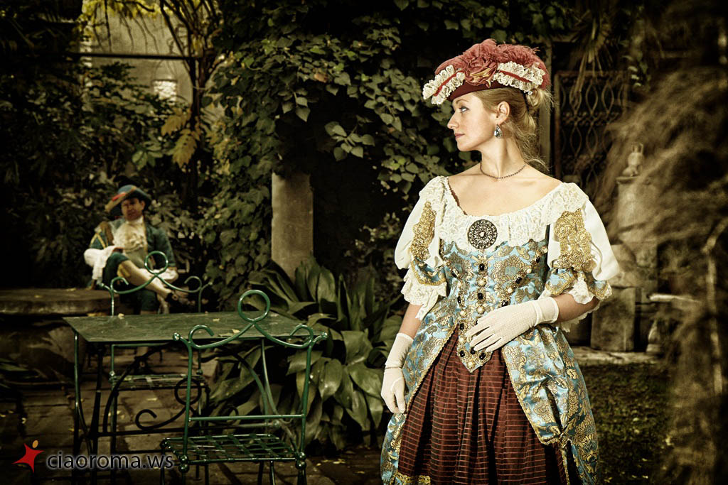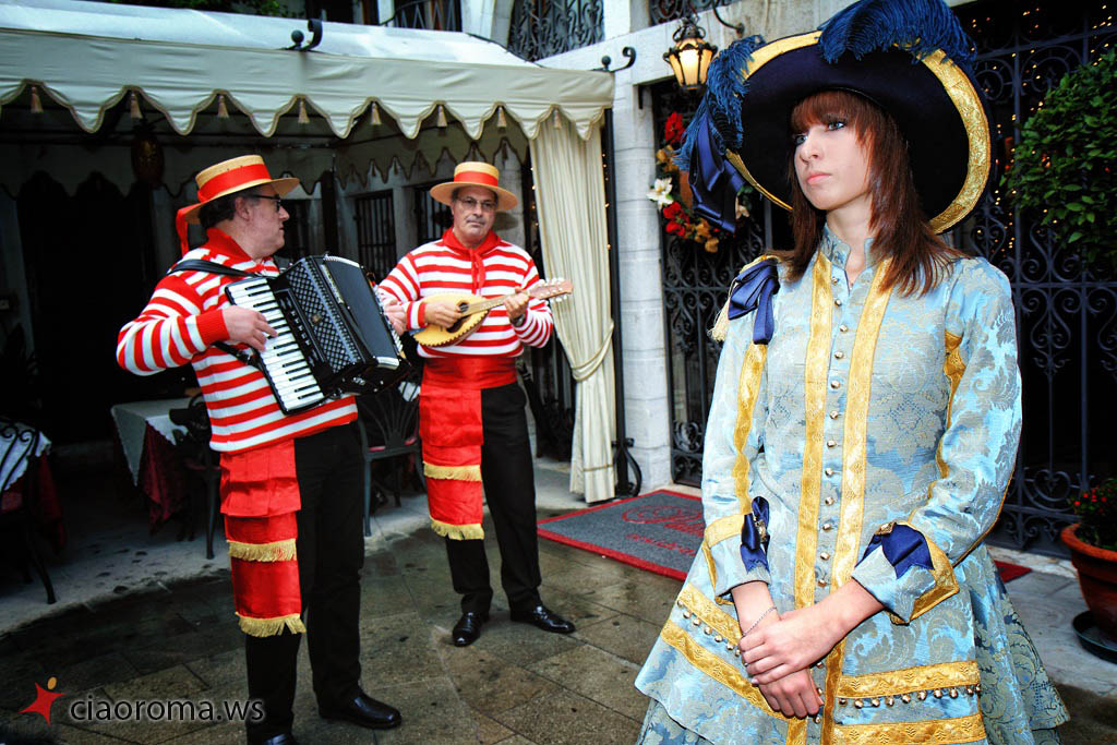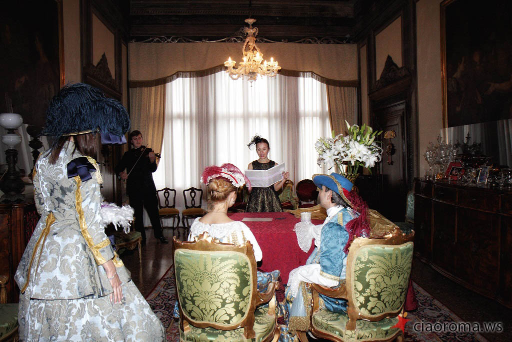 Le fasi iniziali dell'organizzazione si sono svolte nella ricerca dell'abbigliamento più adatto alle caratteristiche degli sposi e all'ambientazione del rito. Si è scelto di affidare quest'arduo compito ad uno degli atelier di costumi d'epoca più importante di Venezia, con centinaia di costumi, guanti, scarpe, cappelli, cinture, piume... che, a gusto degli sposi, riproducessero il clima del XVI secolo. Per quanto riguarda l'ambientazione è stato scelto un Hotel nella zona centrale di Venezia, il palazzo Abadessa, ammobiliato in stile rinascimentale, con decorazioni che ben facevano riportare alla mente lo stile di vita che si viveva all'epoca: tappeti e quadri antichi, vasi in porcellana, lampadari enormi. Per rendere più suggestivo il momento del matrimonio ci si è affidati all'esperienza di un violinista che ha dato vita ad un commovente sottofondo musicale, affiancato durante i festeggiamenti successivi, da altri due musicisti che attraverso i loro strumenti, il mandolino e la fisarmonica, hanno contribuito a creare un'atmosfera indimenticabile. Per finire, si è scelto di liberare le tradizionali colombe bianche e godersi il panorama dei vicoli veneziani su di una gondola. Certo non poteva mancare il banchetto nuziale! Per deliziare i palati degli sposi e dei loro invitati è stato scelto un locale suggestivo ed accogliente nei pressi di Piazza San Marco, il ristorante La Cusina, con vista sulla laguna di Venezia.
